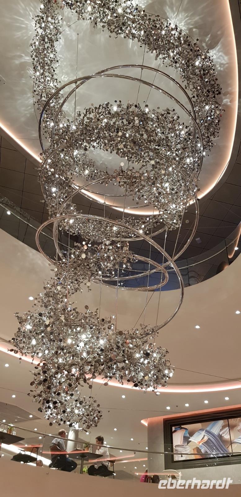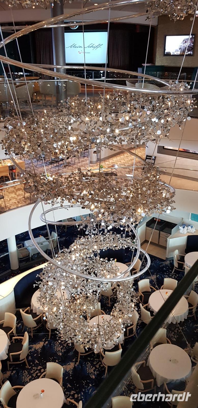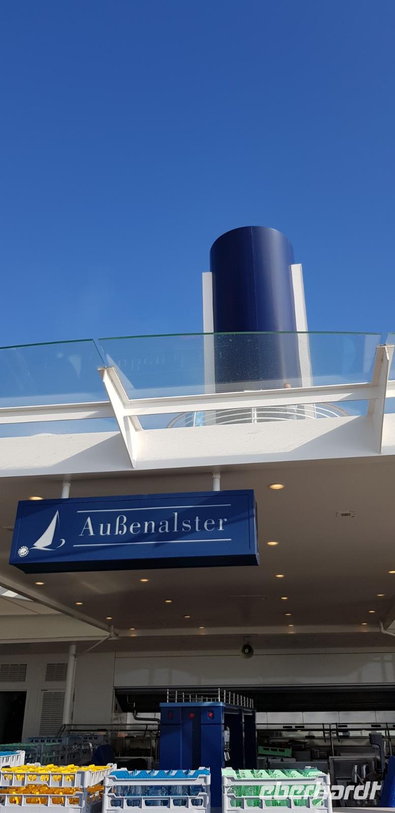 18.00 Uhr treffen wir uns, wer Lust hat, zum gemeinsamen Abendessen. Heute sind wir vier und wir besuchen das à la carte Restaurant Atlantik mediterran auf Deck 4. Wir können wieder zwischen den einzelnen Gerichten der verschiedenen Menüs wählen und uns unser eigenes Menü zusammenstellen oder auch ein komplettes Menü auswählen. Dazu werden hauseigene Getränke und auch andere Getränke angeboten. Alles schmeckt sehr gut und wird in sehr entspannter Atmosphäre serviert.Nach dem Abendessen kann man noch durch die Einkaufspassage NEUER WALL bummeln. Und 21.30 Uhr beginnt im THEATER die Willkommens-Show „Leinen los". Der Kreuzfahrtdirektor führt durch die Show und er stellt sehr unterhaltsam neben dem Kapitän Andreas Greulich alle wichtigen Personen an Bord vor. Im Anschluss an die Show sorgt der Mannschafts-Shanty-Chor noch für ordentlich Stimmung vor der LUMAS Bar. Der erste Seetag geht langsam zu Ende