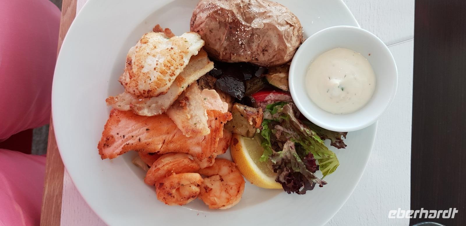 Zum Abendessen sind wir wieder zu viert. Wir probieren heute das Fischrestaurant GOSCH Sylt auf Deck 12. Hier erwartet uns ein sehr leckeres Menü mit einem Fischgrillteller als Hauptgang. Wir können von hier oben aus einen fantastischen Sonnenuntergang beobachten. Der komplettiert das tolle Ambiente. Am Abend werden im THEATER in der Show „Ti Amo" die besten deutschen und italienischen Schlager präsentiert. Bis 23.00 Uhr ist die Shoppingmeile NEUER WALL noch geöffnet. Viele tolle Angebote locken die Gäste, doch mal herein zu schauen. Und die Bars und Restaurants haben auch noch geöffnet und erwarten die Gäste.