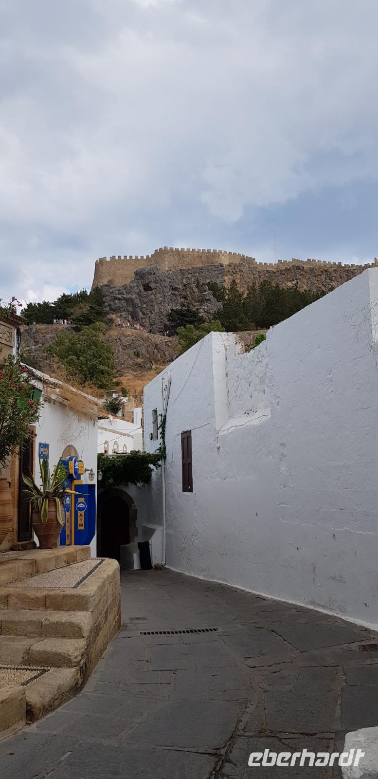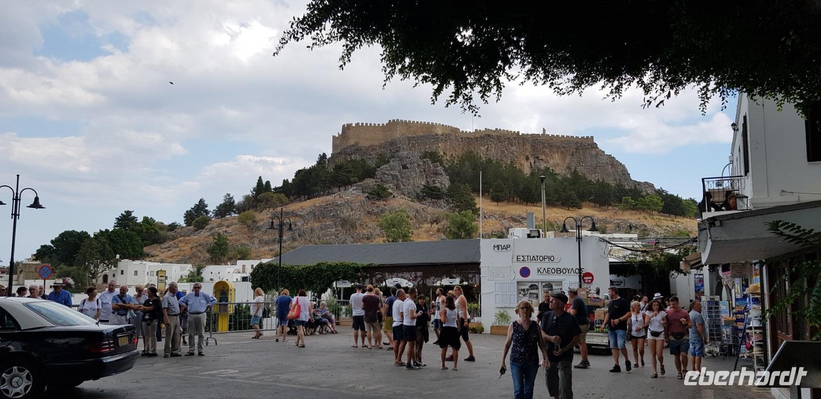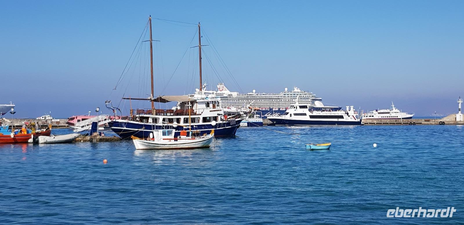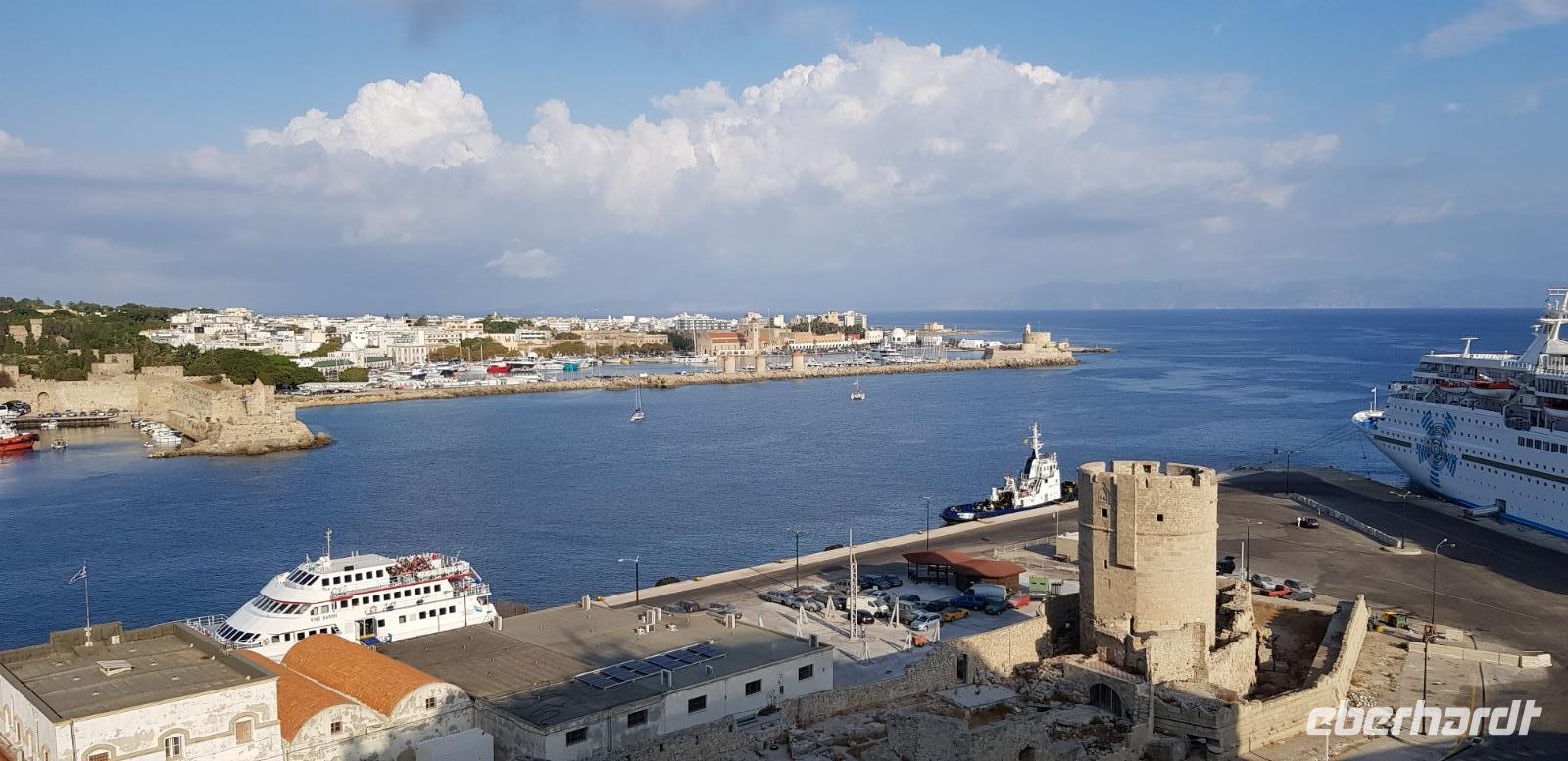 Wir starten erst mittags um 13.00 Uhr zu unserer Inselrundfahrt. Am Mandraki-Hafen machen wir einen kurzen Stopp. Hier ankern vor allem Ausflugsschiffe und Motor- und Segeljachten. Der Hafen ist von einer Mole umgeben. Über der Hafeneinfahrt soll der Koloss von Rhodos, eines der Weltwunder, gestanden haben. Heute wird die Hafeneinfahrt von zwei Säulen mit den Wappentieren von Rhodos, Hirsch und Hirschkuh flankiert. Dann geht die Fahrt weiter hinauf zur Akropolis von Rhodos. Von dort aus bietet sich ein wunderbarer Blick über die Stadt. Auf der Panoramastraße fahren wir nun über die Insel bis zu dem kleinen Örtchen Lindos. Bevor wir Lindos erreichen, werfen wir einen Blick auf die malerische St. Pauls Bucht. Von hier aus können wir auch die Akropolis von Lindos sehen, die sich über dem Örtchen auf einem Felsplateau befindet. Die weißen Häuser des Ortes schmiegen sich an den Hang der Akropolis. Wir unternehmen einen Spaziergang durch die engen Gassen von Lindos und bestaunen die weißen Häuser. Den etwas beschwerlichen Weg zur Akropolis hinauf kann man auch auf dem Rücken von Maultieren/Eseln zurücklegen. Dann geht es wieder zurück nach Rhodos-Stadt und zu unserem Schiff. Die Gäste,die schon am Vormittag ihren Ausflug hatten, können den Nachmittag bis zum Ablegen noch in der Altstadt von Rhodos verbringen oder auch schon auf das Schiff zurückkehren.