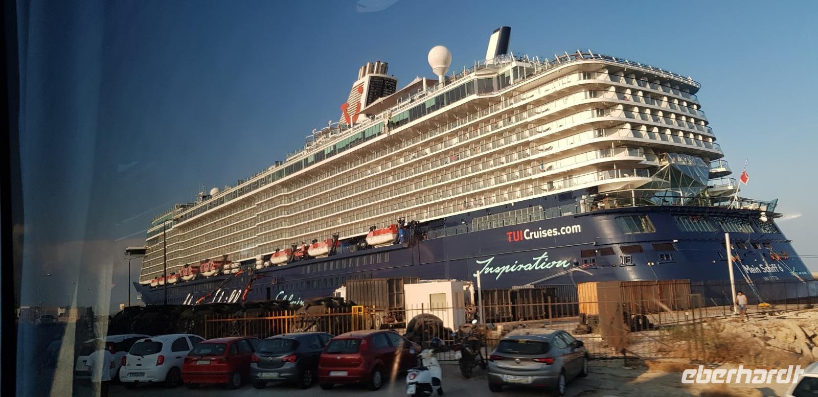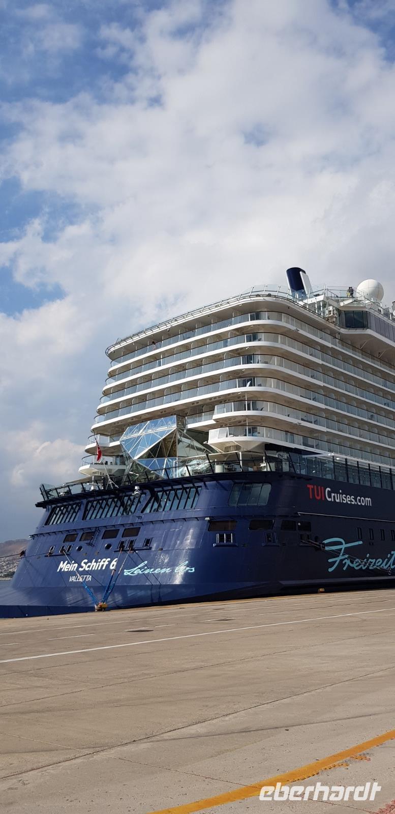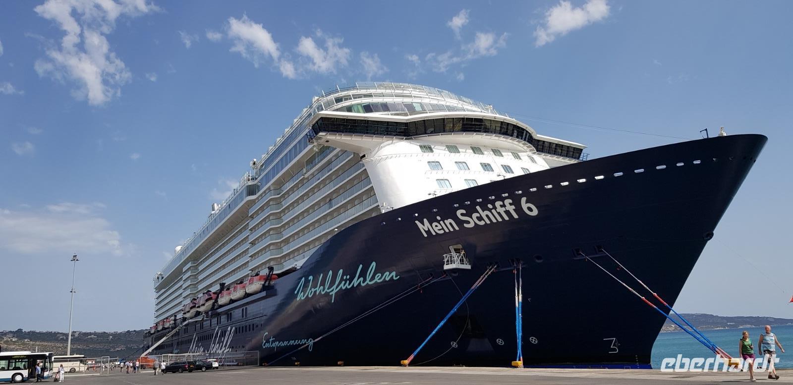 Die Stadt Chania ist in unmittelbarer Nähe vom Hafen, nur wenige Minuten mit dem Bus, dann geht es zu Fuß weiter. Ein erstes Highlight bei der Stadtbesichtigung ist die Markthalle. Hier gibt es ganz frische einheimische Produkte wie Obst und Gemüse, Fisch, Fleisch und Käse und natürlich auch allerlei Souvenire für die Touristen. Anschließend bummeln wir durch die Straßen in der Altstadt. Dabei bieten sich tolle Blicke auf interessante Gebäude und Kirchen, die viel über die Geschichte zu erzählen haben. Dann kommen wir am venezianischen Hafen an, ein weiteres Highlight. Am Hafen herrscht reges Treiben und es bieten sich faszinierende Blicke auf das Meer. Hier gibt es viele Möglichkeiten zum Verweilen. Gegen Mittag geht es wieder zurück aufs Schiff. Wer noch bleiben möchte, kann das sehr gern tun. 17.30 Uhr müssen „Alle Mann" wieder an Bord sein, denn 18.00 Uhr sticht unsere Mein Schiff 6 wieder in See. Da es heute die Sonne recht gut mit uns meint und die Temperaturen sommerliche 30 °C erreichen, bietet sich ein Nachmittag auf Deck an. Dort gibt es ausreichend Möglichkeiten für Sport, Erholung und Genuss.