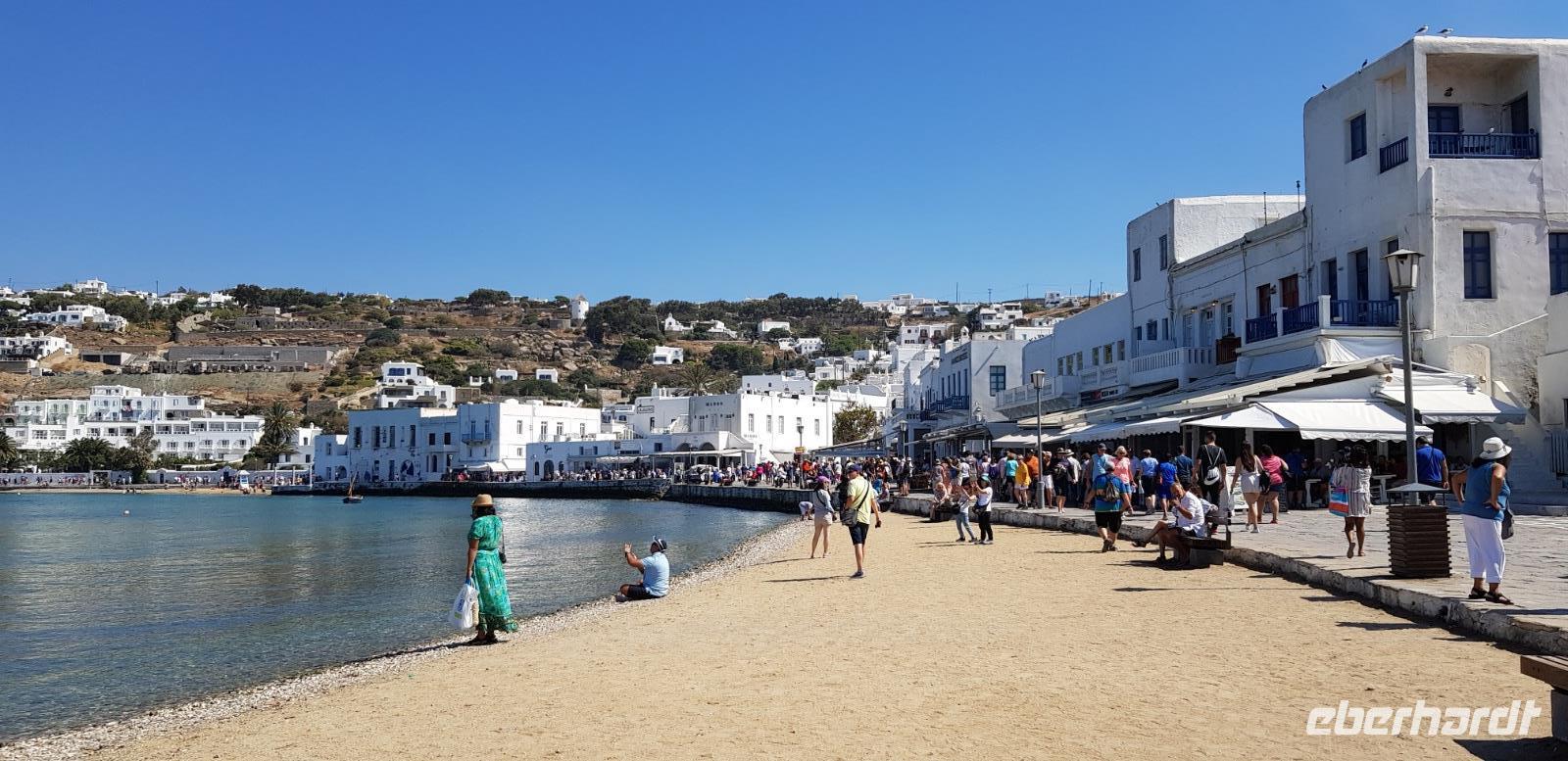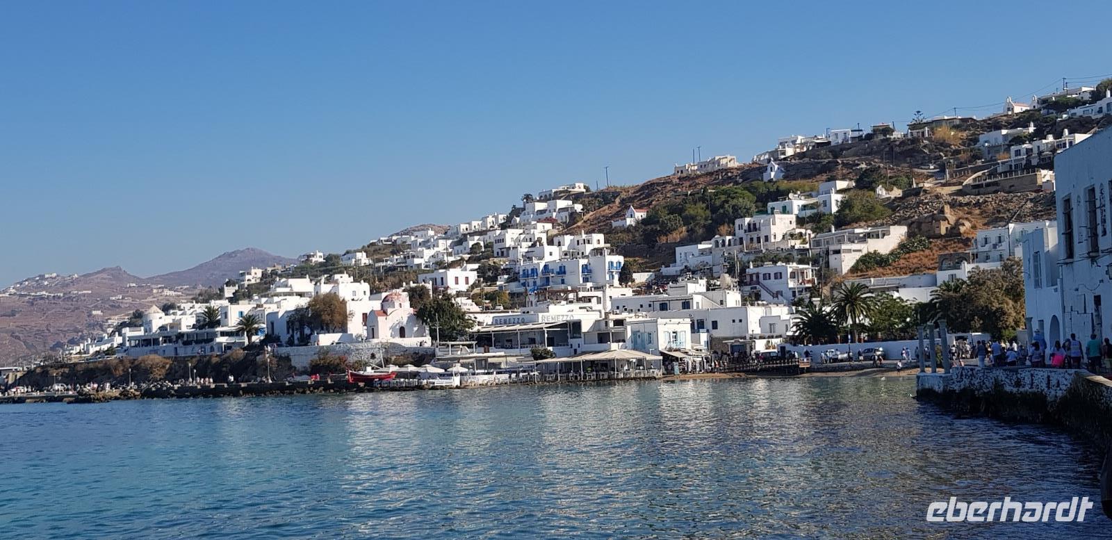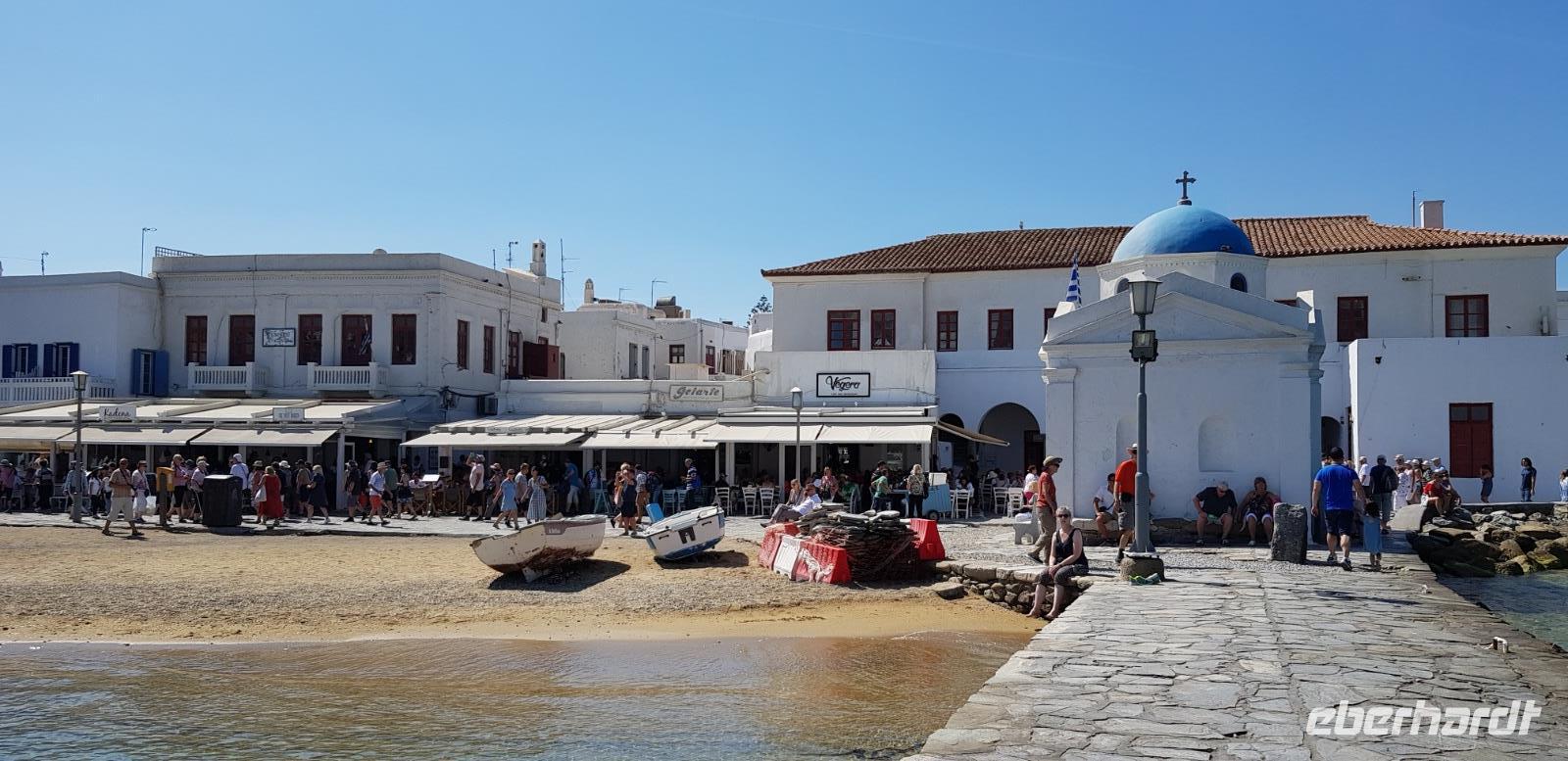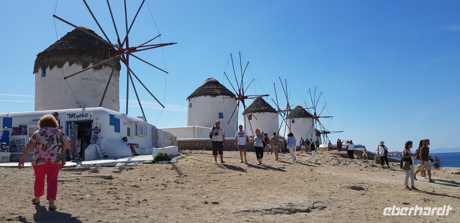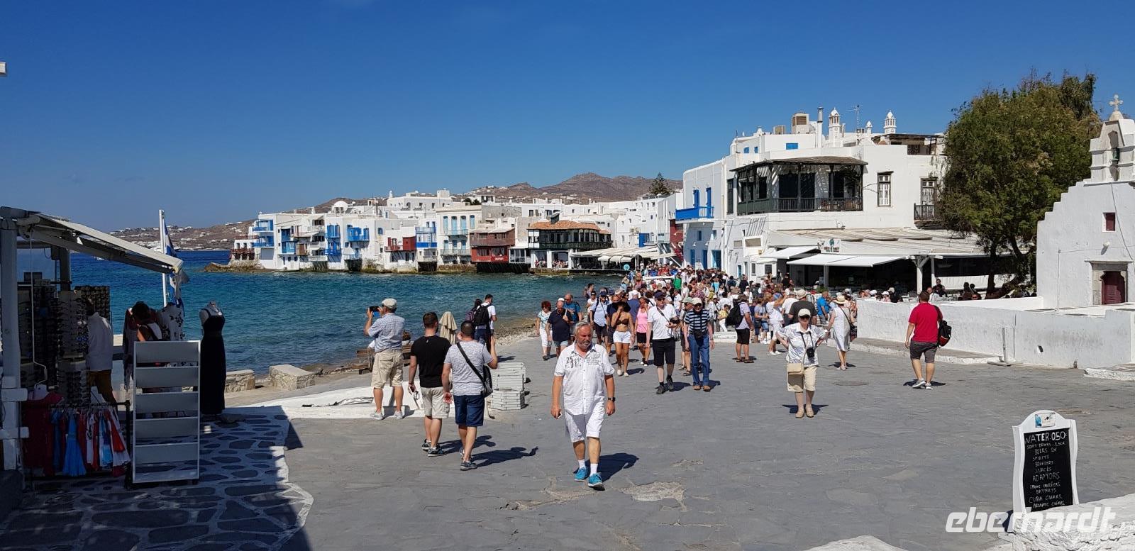 So kommen die charakteristischen weißen Häuser mit ihren blauen Fenstern und Türen besonders gut zur Geltung. Wir bummeln durch die malerisch engen Gassen. Wir sehen die Kapitänshäuser im Venetia-Viertel und die für Mykonos so charakteristischen Windmühlen. Dann geht es am Hafen entlang zum Bus. Bei einer kleinen Inselrundfahrt besuchen wir noch das Kloster in Ano Mero und einen schönen Sandstrand. Dann geht es zurück nach Mykonos-Stadt. Die lädt trotz des Trubels - heute sind vier Kreuzfahrtschiffe da - zum Verweilen ein. Es ist noch ausreichend Zeit und so steht einem Bummel durch Mykonos-Stadt nichts im Wege. Am Nachmittag geht es dann mit dem Tenderboot wieder auf dasSchiff zurück.