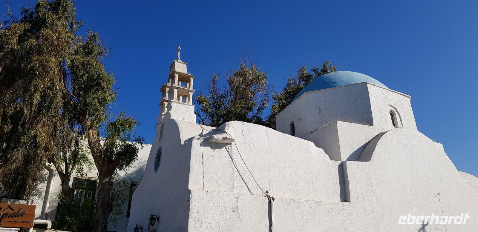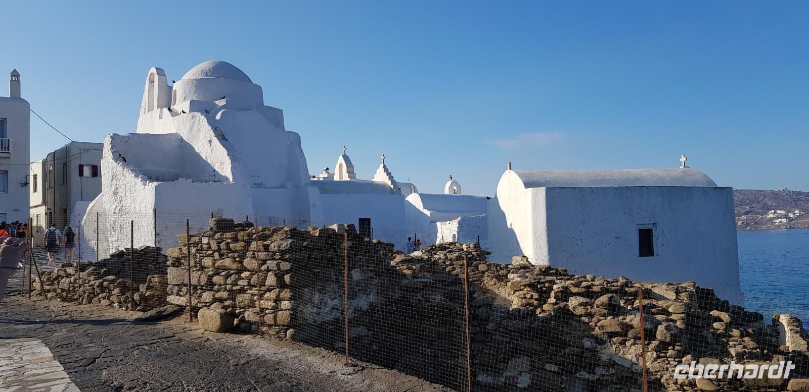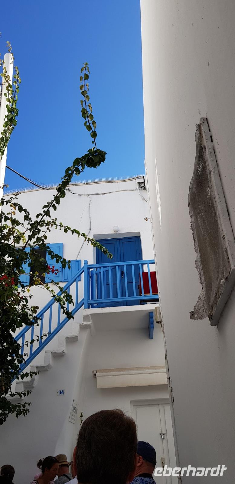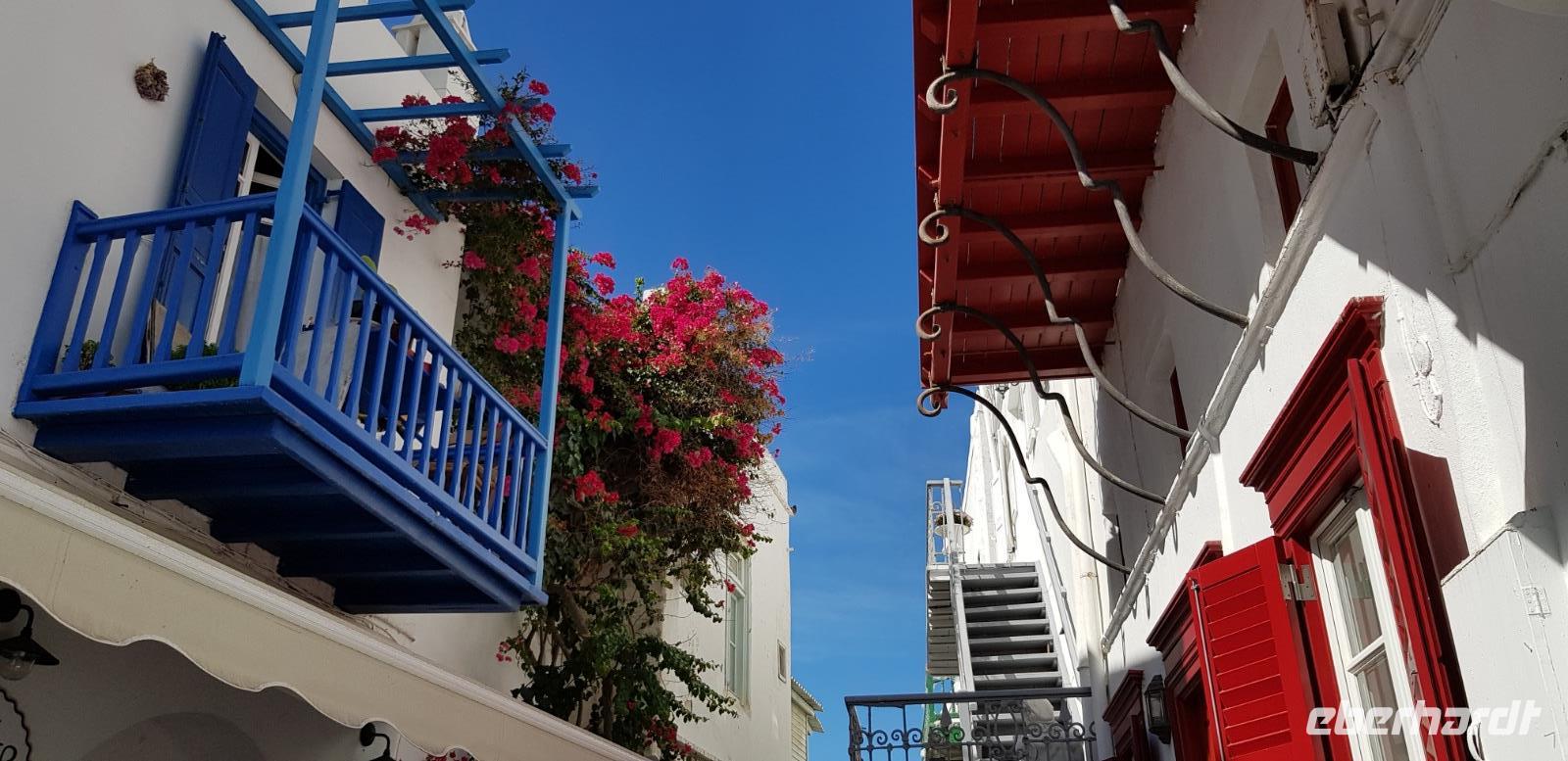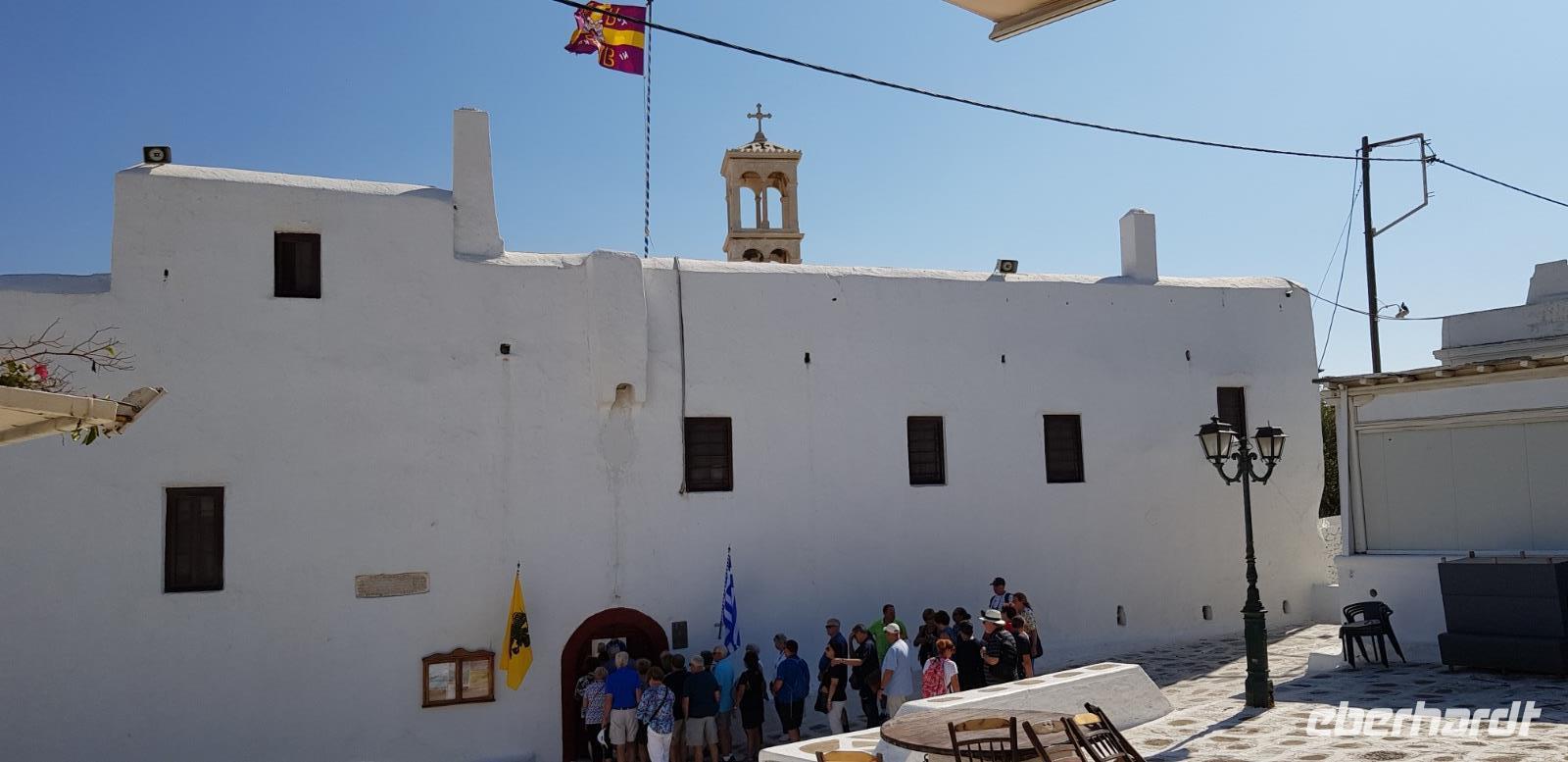 So kommen die charakteristischen weißen Häuser mit ihren blauen Fenstern und Türen besonders gut zur Geltung. Wir bummeln durch die malerisch engen Gassen. Wir sehen die Kapitänshäuser im Venetia-Viertel und die für Mykonos so charakteristischen Windmühlen. Dann geht es am Hafen entlang zum Bus. Bei einer kleinen Inselrundfahrt besuchen wir noch das Kloster in Ano Mero und einen schönen Sandstrand. Dann geht es zurück nach Mykonos-Stadt. Die lädt trotz des Trubels - heute sind vier Kreuzfahrtschiffe da - zum Verweilen ein. Es ist noch ausreichend Zeit und so steht einem Bummel durch Mykonos-Stadt nichts im Wege. Am Nachmittag geht es dann mit dem Tenderboot wieder auf dasSchiff zurück.