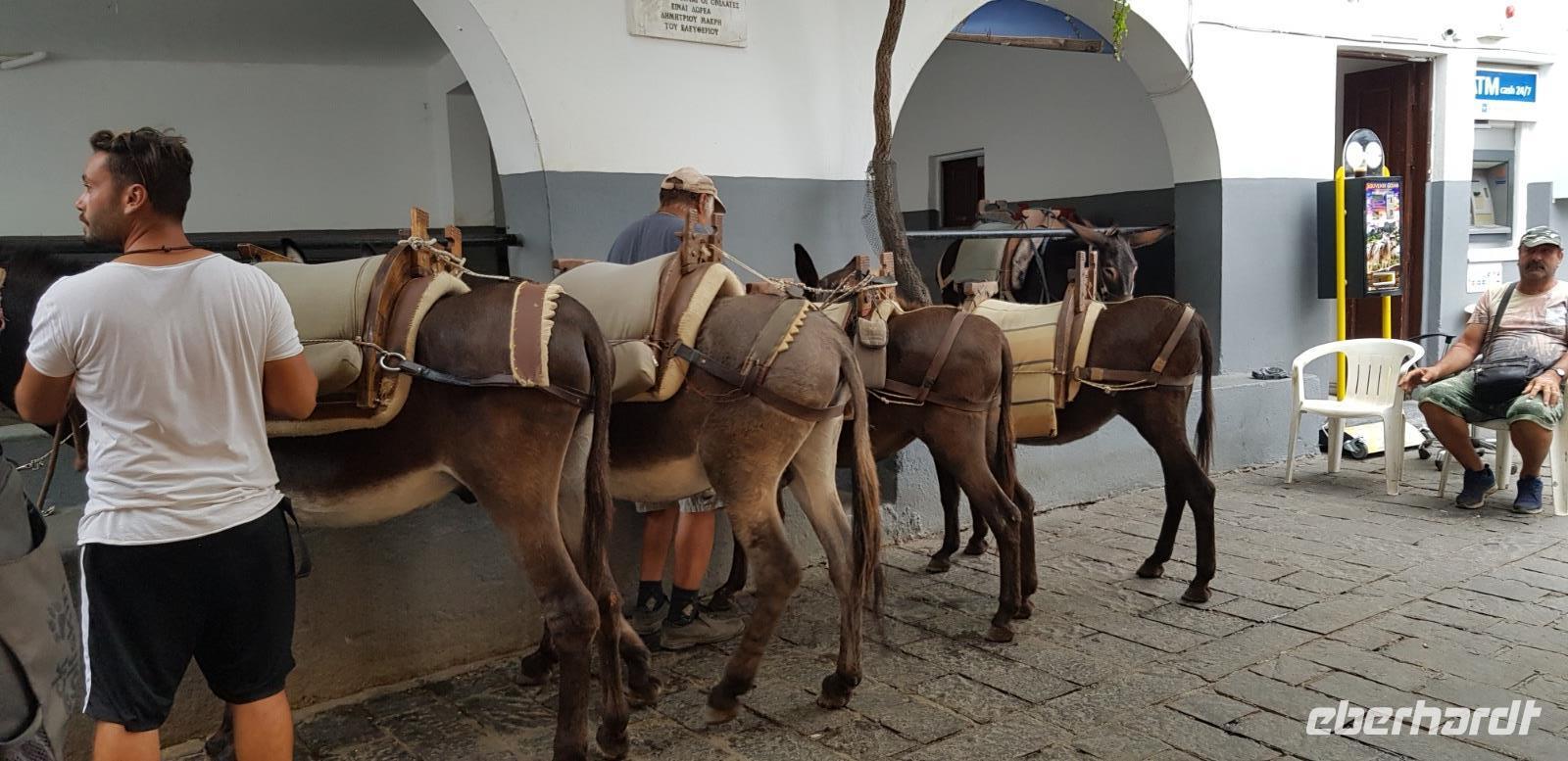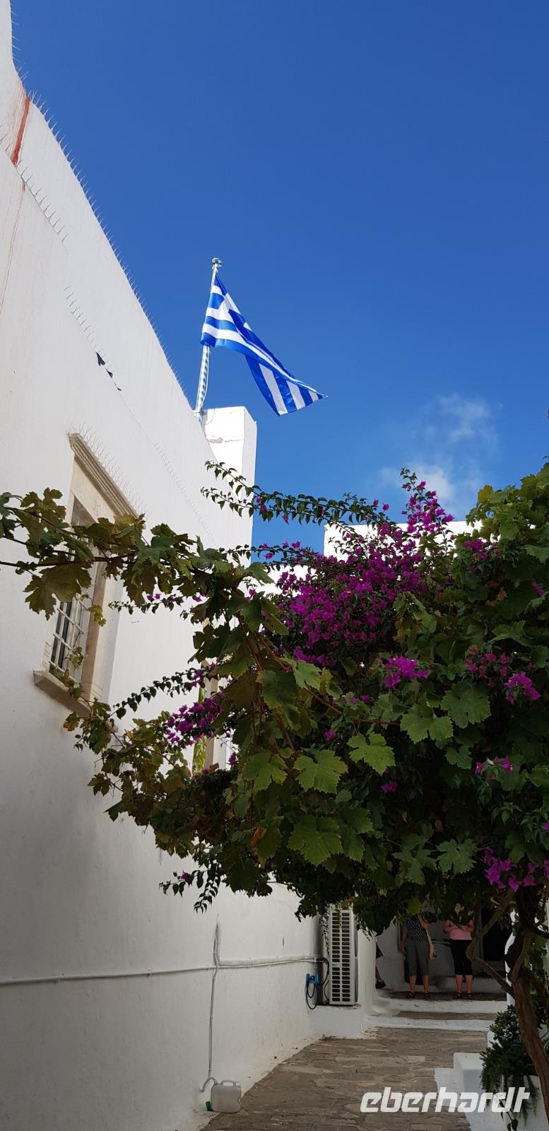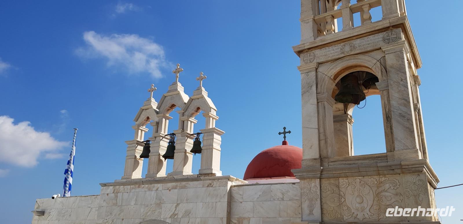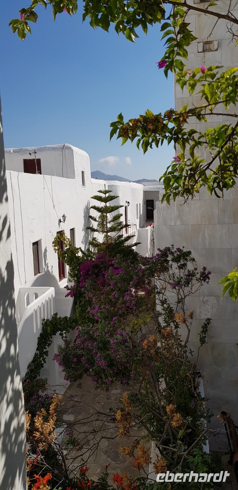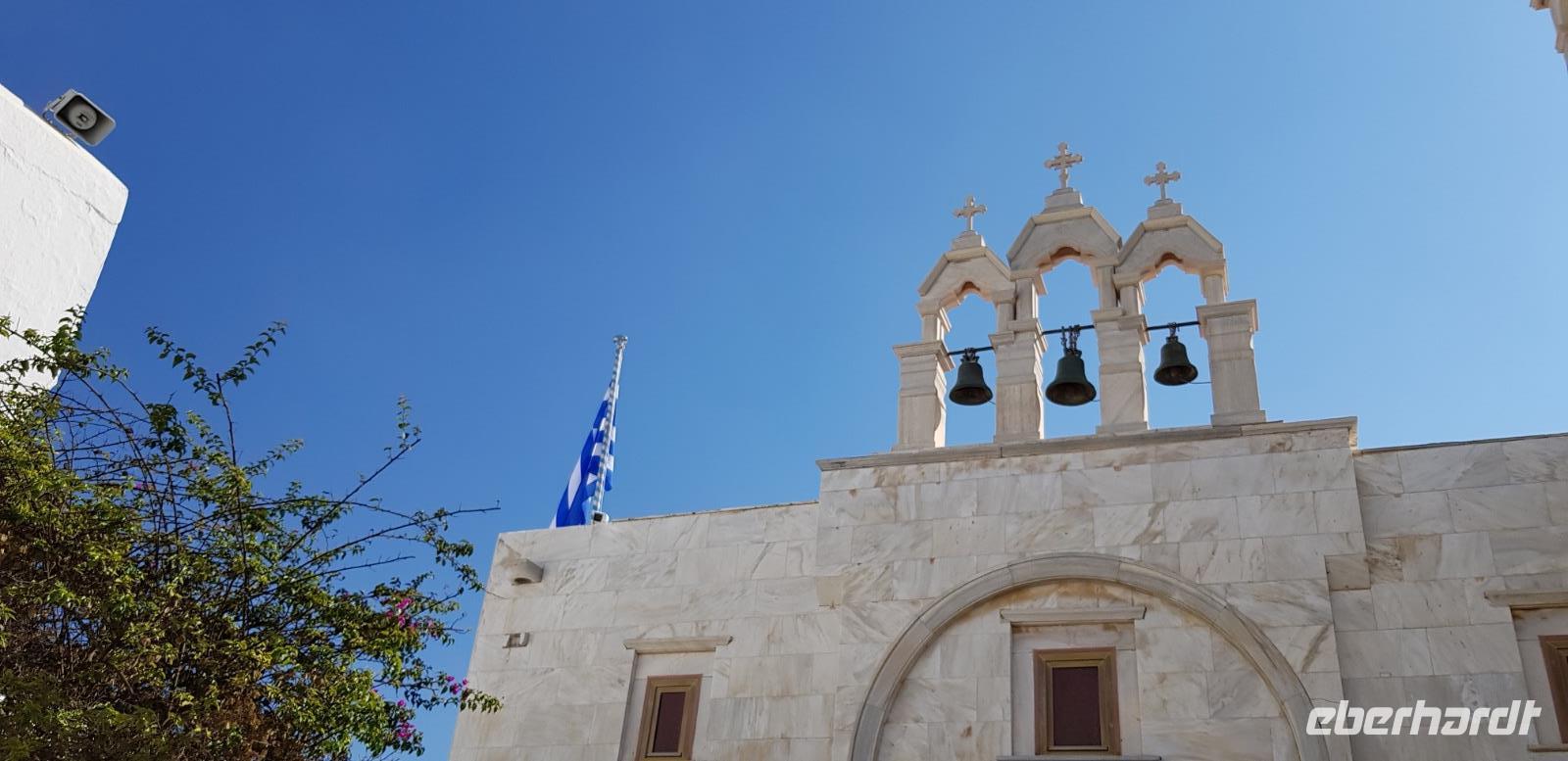 So kommen die charakteristischen weißen Häuser mit ihren blauen Fenstern und Türen besonders gut zur Geltung. Wir bummeln durch die malerisch engen Gassen. Wir sehen die Kapitänshäuser im Venetia-Viertel und die für Mykonos so charakteristischen Windmühlen. Dann geht es am Hafen entlang zum Bus. Bei einer kleinen Inselrundfahrt besuchen wir noch das Kloster in Ano Mero und einen schönen Sandstrand. Dann geht es zurück nach Mykonos-Stadt. Die lädt trotz des Trubels - heute sind vier Kreuzfahrtschiffe da - zum Verweilen ein. Es ist noch ausreichend Zeit und so steht einem Bummel durch Mykonos-Stadt nichts im Wege. Am Nachmittag geht es dann mit dem Tenderboot wieder auf dasSchiff zurück.
