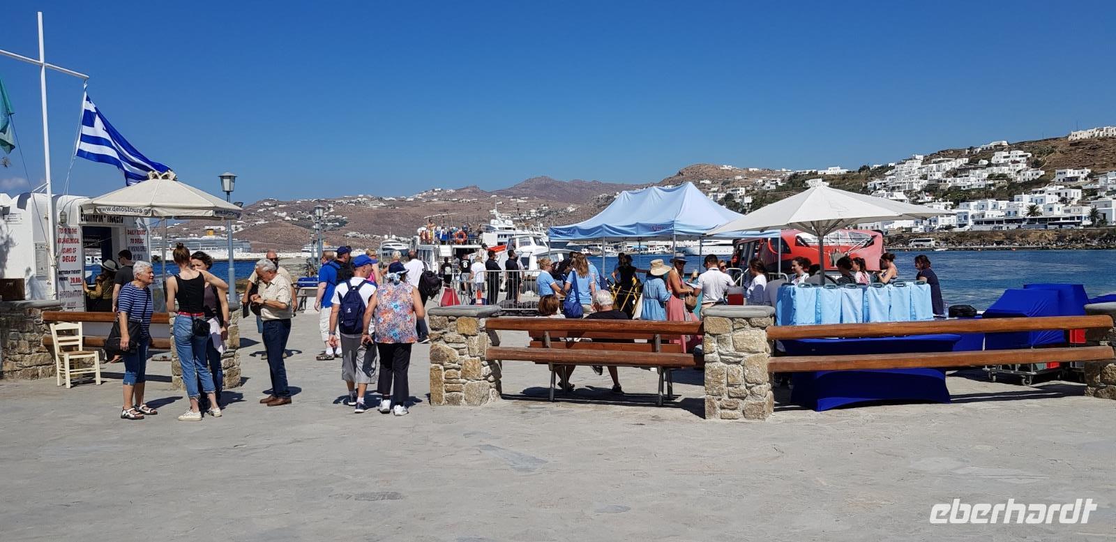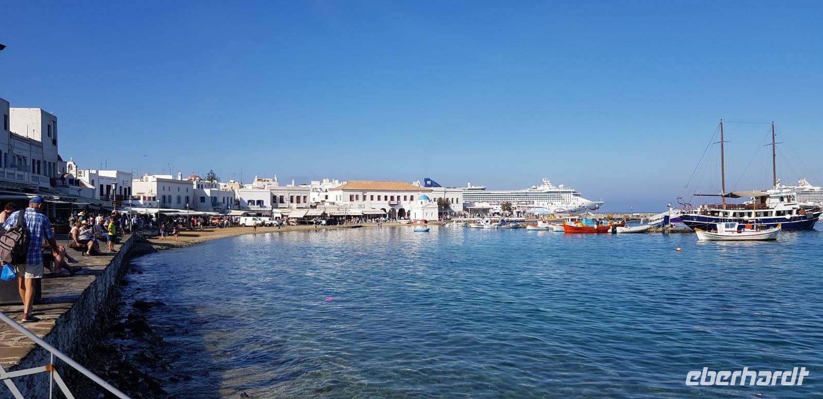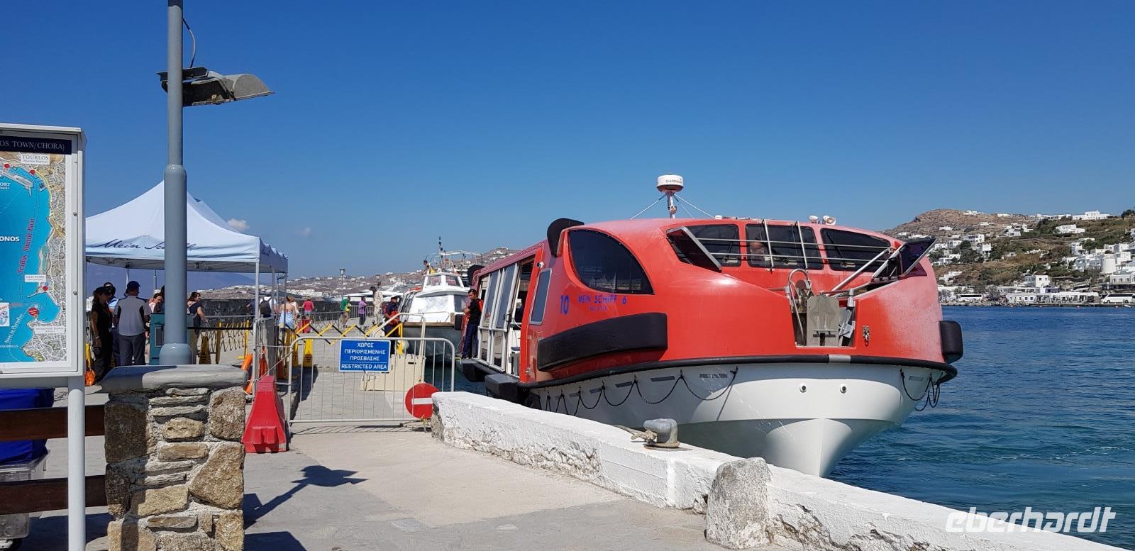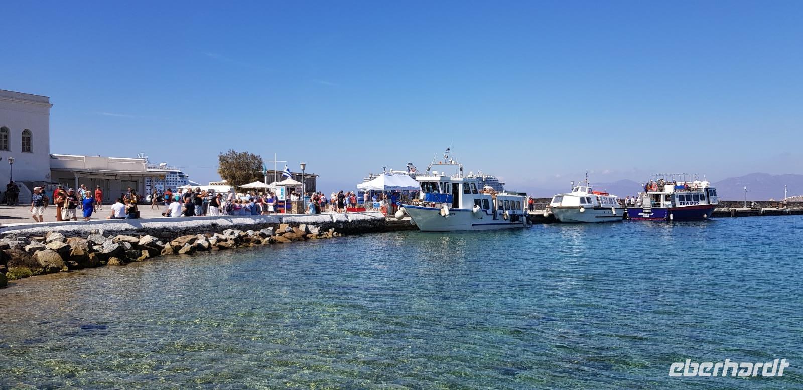 Wir sind schon früh morgens angekommen und gleich nach dem zeitigen Frühstück geht es 8.00 Uhr zu den Ausflügen. Dazu bekommen wir heute zusätzlich zum Bus noch ein Tenderboot für die Fahrt auf die Insel Mykonos zugewiesen. Für die Rückfahrt zum Schiff kann ein beliebiges Tenderboot genutzt werden. Die Tenderboote bringen uns ganz sicher und ruhig an Land und wieder zum Schiff zurück, das letzte fährt 18.15 Uhr in Mykonos-Stadt los. Das möchte man nicht verpassen, sonst ... . Und wieder meint es der Sonnengott Helios gut mit uns - blauer Himmel und Sonnenschein!