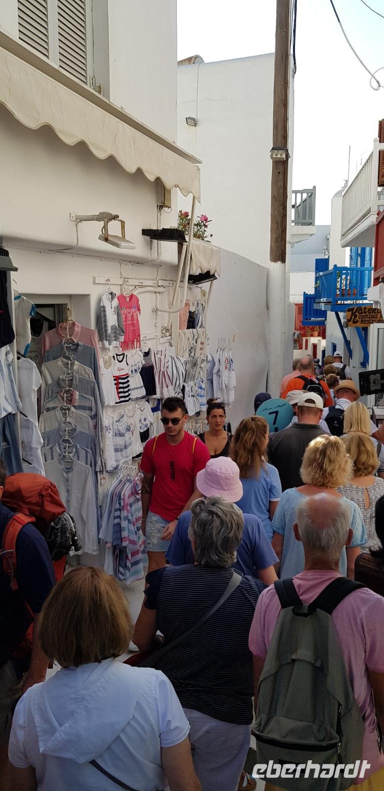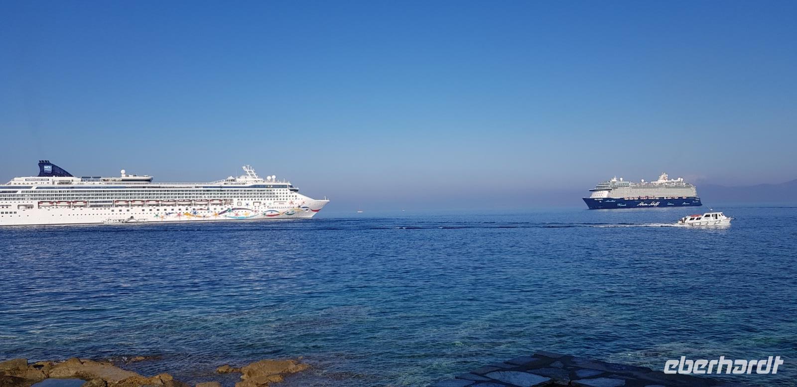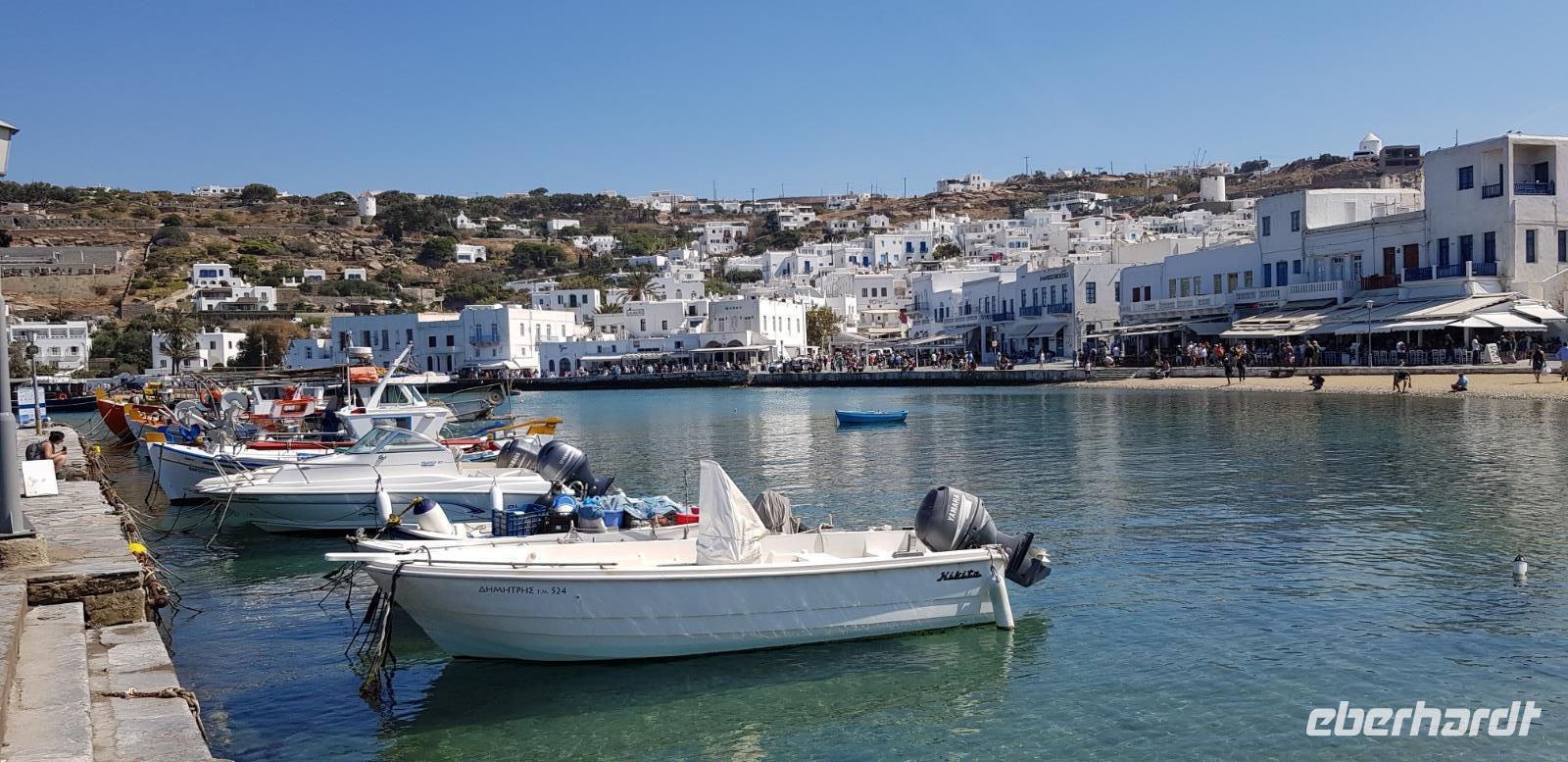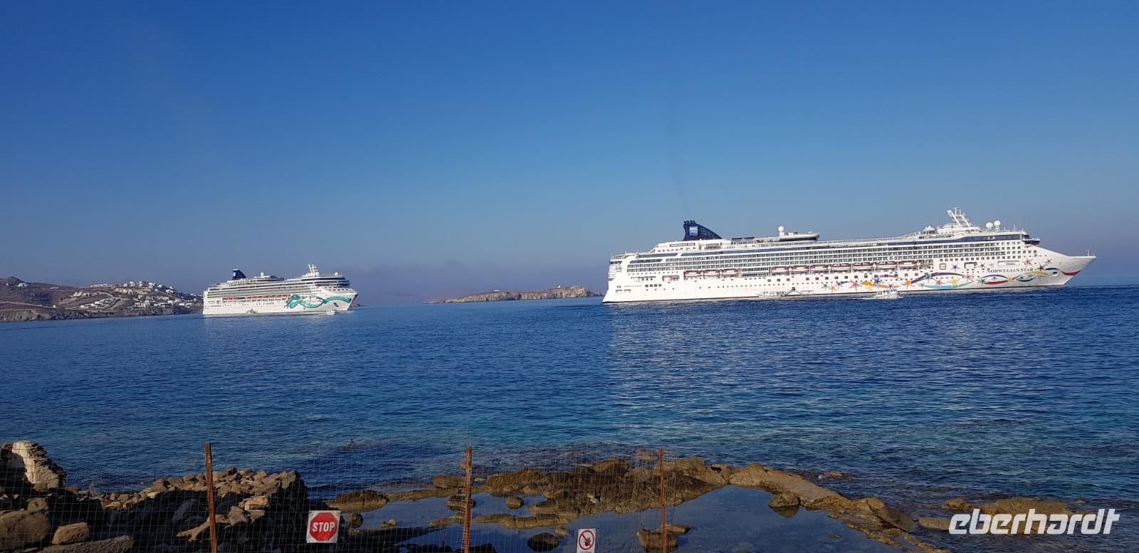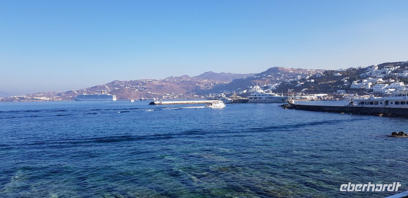 Wir sind schon früh morgens angekommen und gleich nach dem zeitigen Frühstück geht es 8.00 Uhr zu den Ausflügen. Dazu bekommen wir heute zusätzlich zum Bus noch ein Tenderboot für die Fahrt auf die Insel Mykonos zugewiesen. Für die Rückfahrt zum Schiff kann ein beliebiges Tenderboot genutzt werden. Die Tenderboote bringen uns ganz sicher und ruhig an Land und wieder zum Schiff zurück, das letzte fährt 18.15 Uhr in Mykonos-Stadt los. Das möchte man nicht verpassen, sonst ... . Und wieder meint es der Sonnengott Helios gut mit uns - blauer Himmel und Sonnenschein!
