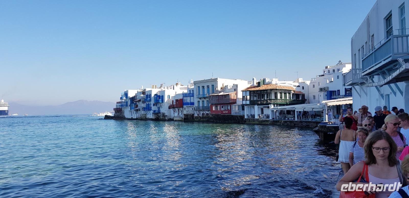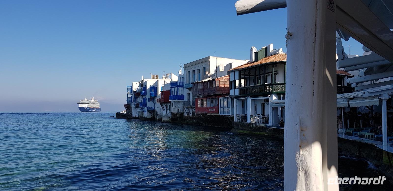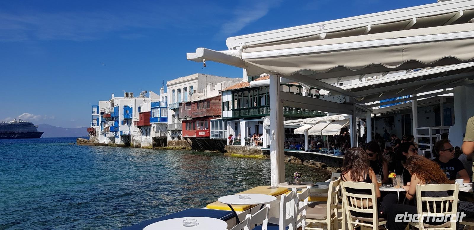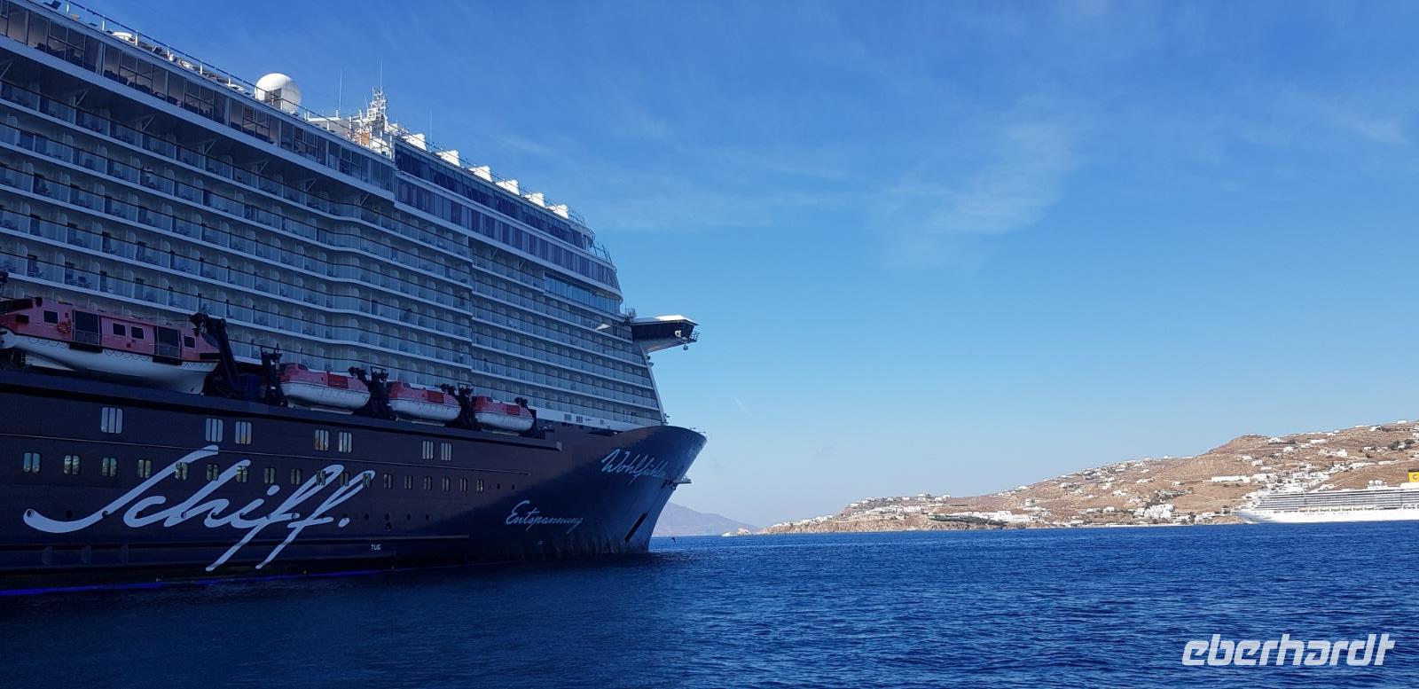 Heute wird es spannend, es wird getendert! Das heißt, unsere Mein Schiff 6 liegt auf Reede und wir Gäste werden per Tenderboot an Land gebracht und auch wieder zurück zum Schiff. Die Insel Mykonos ist bekannt durch ihre leuchtend weißen Häuser mit bunt gestrichenen Balkonen und Fensterläden und ihre Wahrzeichen, die Windmühlen. Auch das Venetia-Viertel mit den bunten Kapitänshäusern und den vielen Bars und Restaurants lockt die Besucher an.