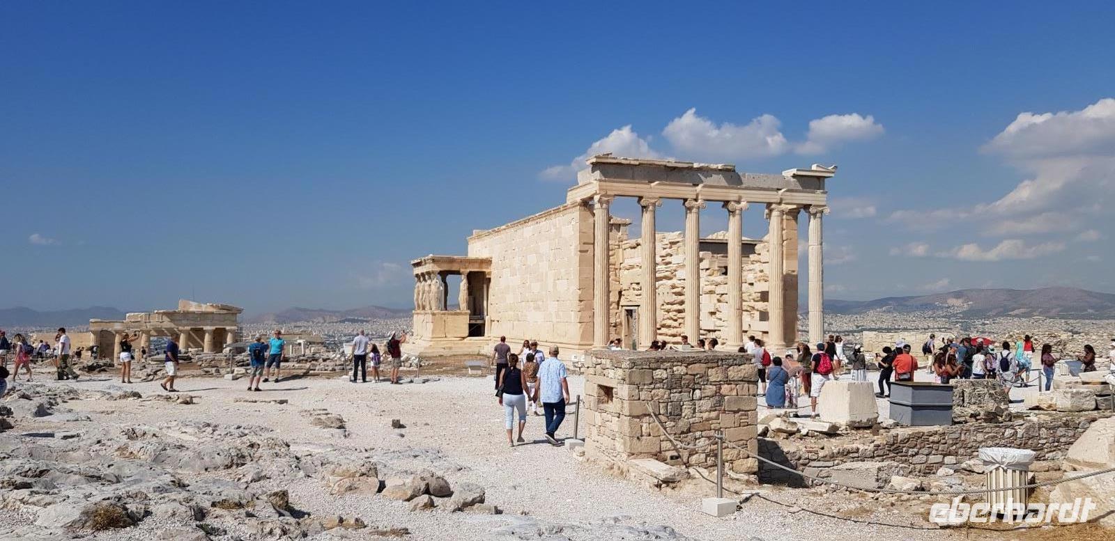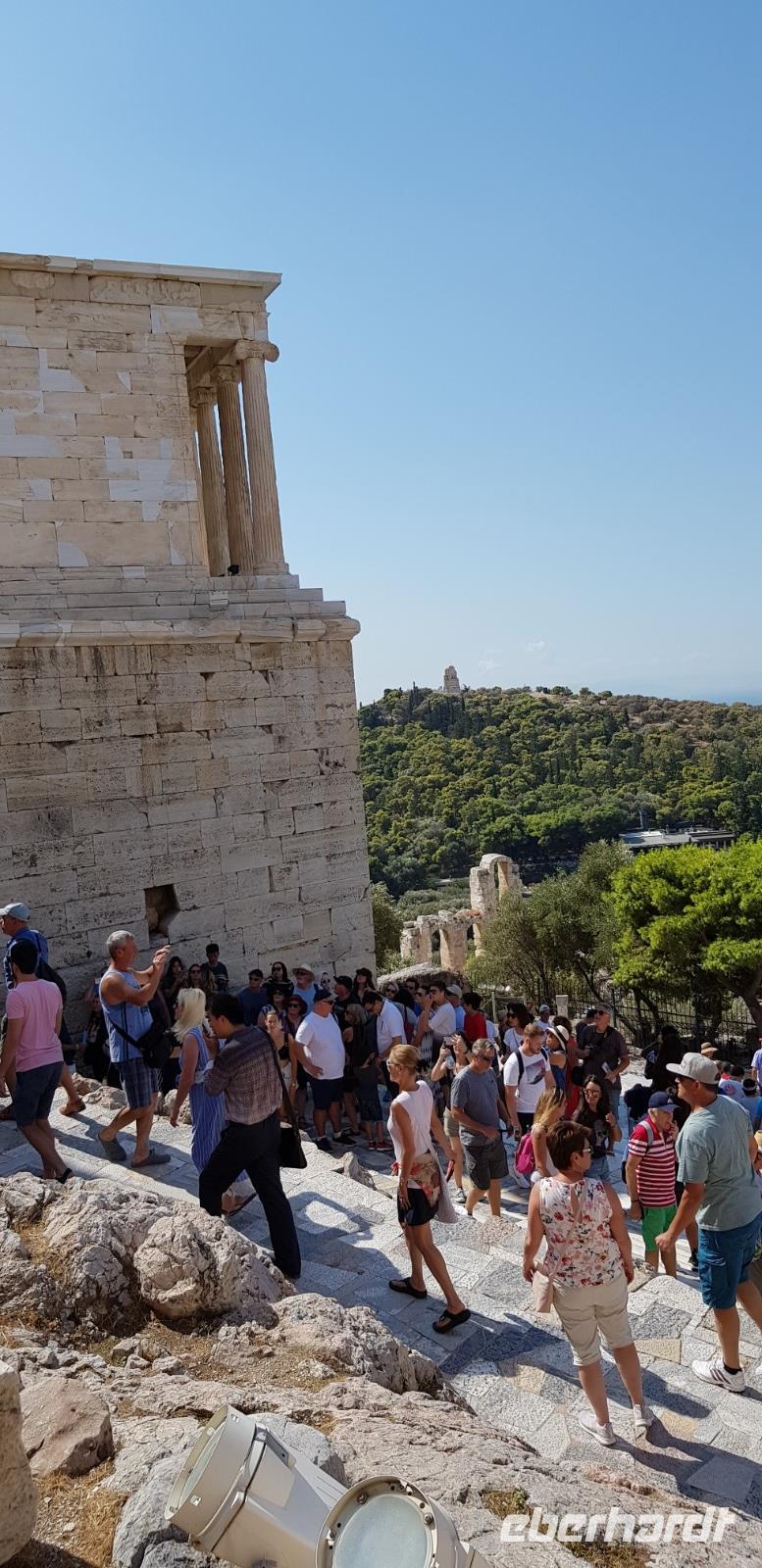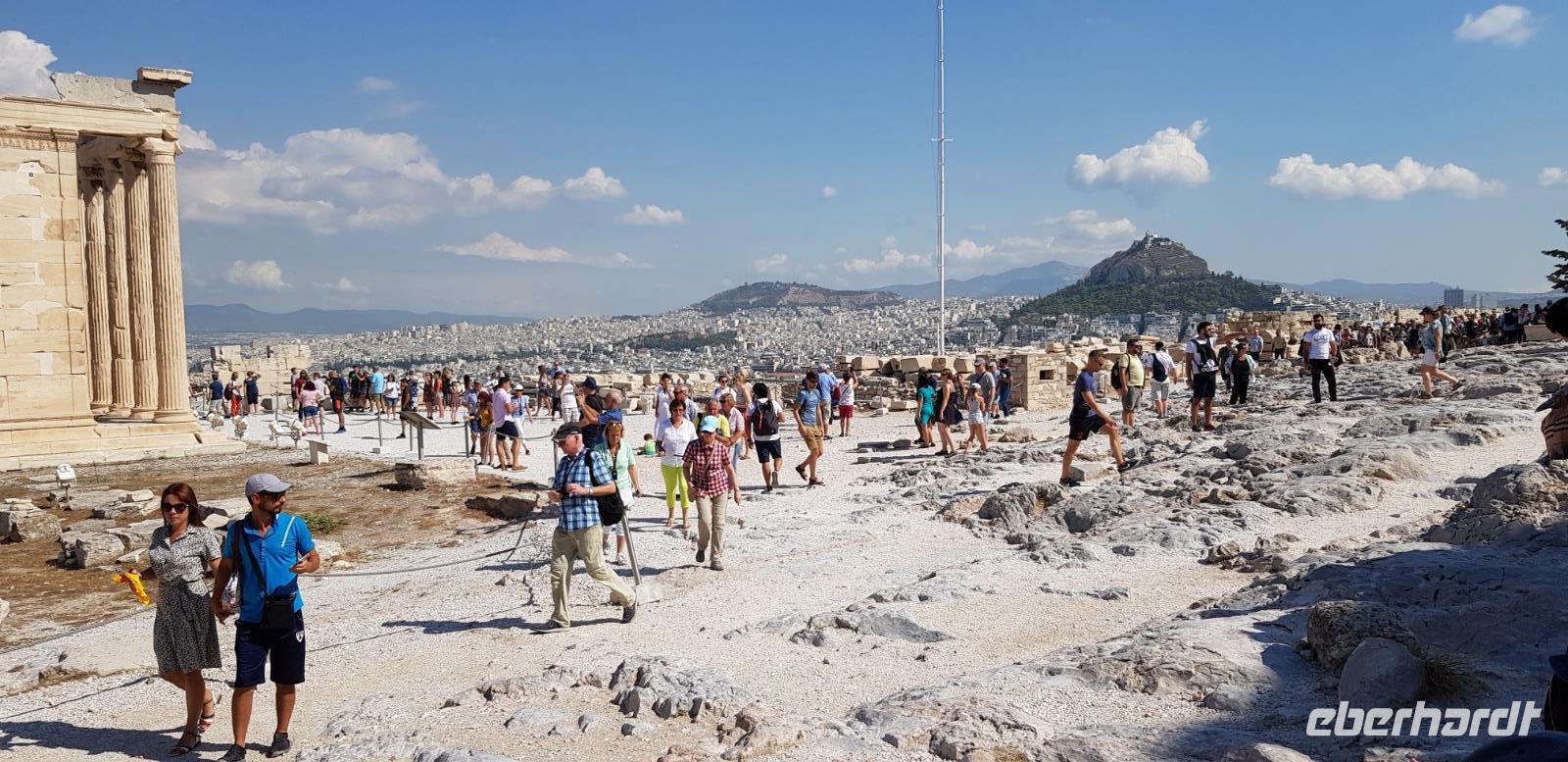 Unser erster Stopp ist an einem Stadion, das 60.000 Besucher aufnehmen kann und für Wettkämpfe im Bogenschießen und als Zielstadion für den Athen-Marathon genutzt wird. Weiter geht es durch das neuzeitliche Athen bis zum großen Parkplatz am Fuß der Akropolis. Von da aus müssen wir zu Fuß auf die Akropolis hinaufsteigen. Wir sind nicht die einzigen Besucher! Wir müssen ganz schön aufpassen, dass wir uns nicht verlieren. Bei unserem Aufstieg kommen wir am Dionysos-Theater vorbei. Das Theater stammt aus dem 4. Jh. vor Chr.. Hier wurden erstmals in Europa Theaterstücke aufgeführt, 15.000 Zuschauer hatten Platz. Dann erreichen wir den Hügel der Akropolis. Im Eingangsbereich schreitet man durch einen Torbau , den Propyläen und gleich dahinter erhebt sich der zierliche Nike-Tempel, der der siegbringenden Athena gewidmet ist. Danach erhebt sich auf der rechten Seite des Plateaus der Parthenon Tempel, der erste Tempel der Stadt, der komplett aus Marmor errichtet worden war und auf der linken Seite das Erechtheion. Darin wurden 13 Götter und Heroen verehrt, darunter die wichtigste, Athena Polias, die Stadtpatronin. Diese vier Gebäude wurden zwischen 480 und 431 vor Chr. errichtet, als Athen auf seinem kulturellen, politischen und wirtschaftlichen Höhepunkt war. All das bringt uns Maria näher und wir lassen es auf uns wirken. Es ist schon ein erhebendes Gefühl, da oben auf dem Plateau hoch über Athen zu stehen.