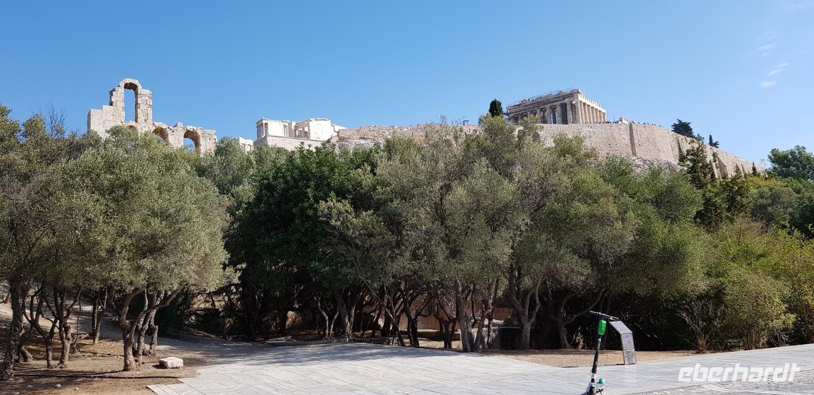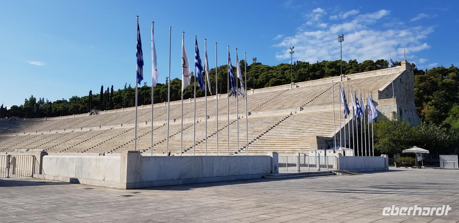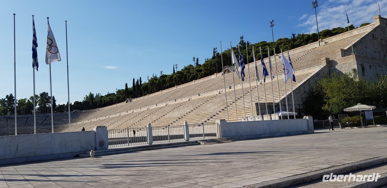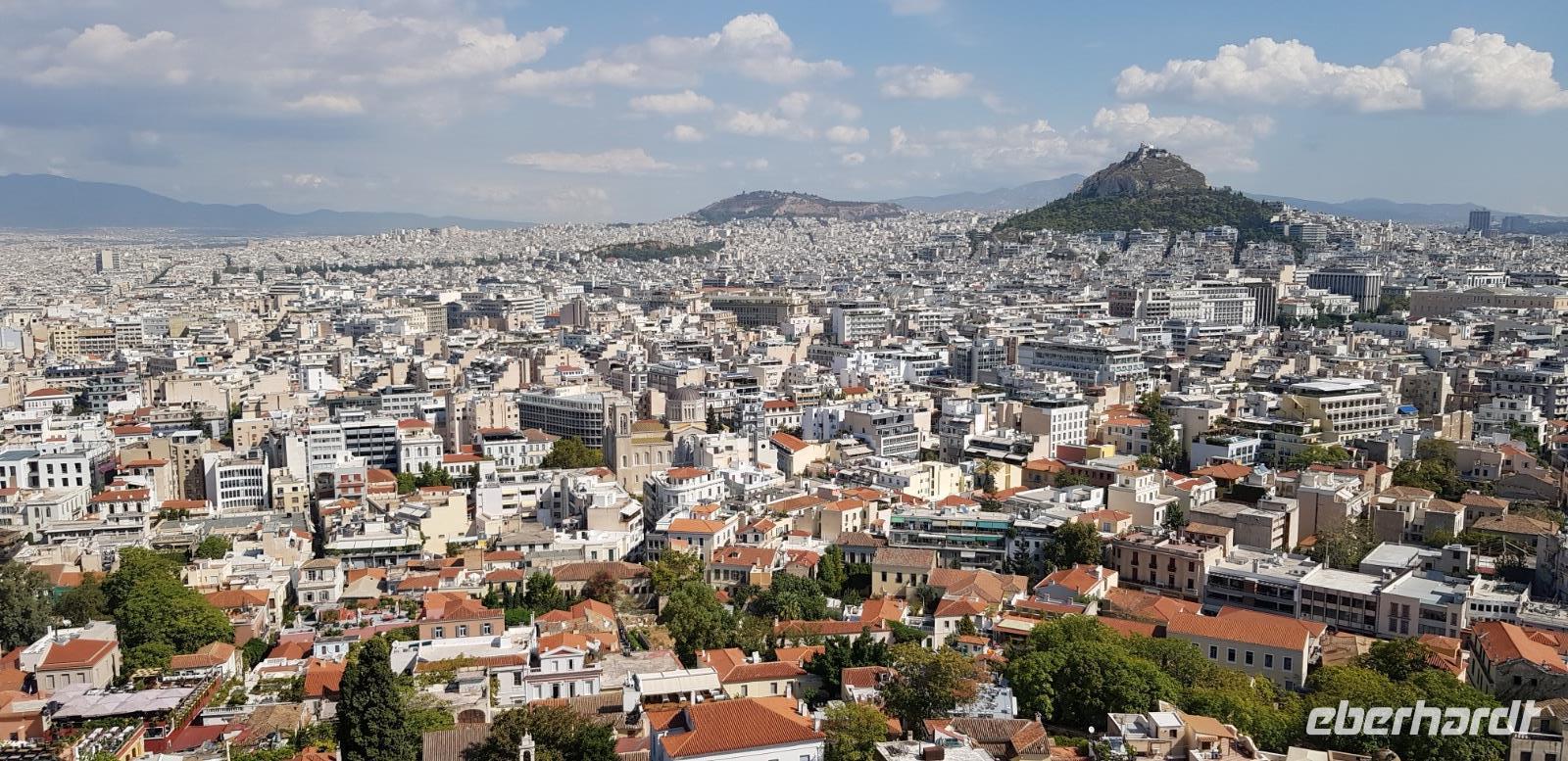 Unser erster Stopp ist an einem Stadion, das 60.000 Besucher aufnehmen kann und für Wettkämpfe im Bogenschießen und als Zielstadion für den Athen-Marathon genutzt wird. Weiter geht es durch das neuzeitliche Athen bis zum großen Parkplatz am Fuß der Akropolis. Von da aus müssen wir zu Fuß auf die Akropolis hinaufsteigen. Wir sind nicht die einzigen Besucher! Wir müssen ganz schön aufpassen, dass wir uns nicht verlieren. Bei unserem Aufstieg kommen wir am Dionysos-Theater vorbei. Das Theater stammt aus dem 4. Jh. vor Chr.. Hier wurden erstmals in Europa Theaterstücke aufgeführt, 15.000 Zuschauer hatten Platz. Dann erreichen wir den Hügel der Akropolis. Im Eingangsbereich schreitet man durch einen Torbau , den Propyläen und gleich dahinter erhebt sich der zierliche Nike-Tempel, der der siegbringenden Athena gewidmet ist. Danach erhebt sich auf der rechten Seite des Plateaus der Parthenon Tempel, der erste Tempel der Stadt, der komplett aus Marmor errichtet worden war und auf der linken Seite das Erechtheion. Darin wurden 13 Götter und Heroen verehrt, darunter die wichtigste, Athena Polias, die Stadtpatronin. Diese vier Gebäude wurden zwischen 480 und 431 vor Chr. errichtet, als Athen auf seinem kulturellen, politischen und wirtschaftlichen Höhepunkt war. All das bringt uns Maria näher und wir lassen es auf uns wirken. Es ist schon ein erhebendes Gefühl, da oben auf dem Plateau hoch über Athen zu stehen.