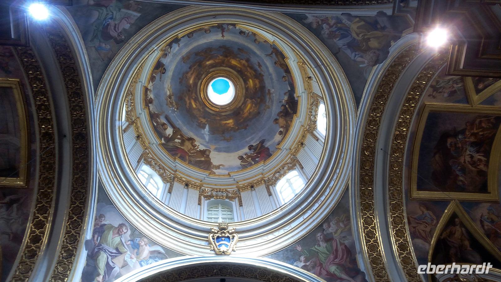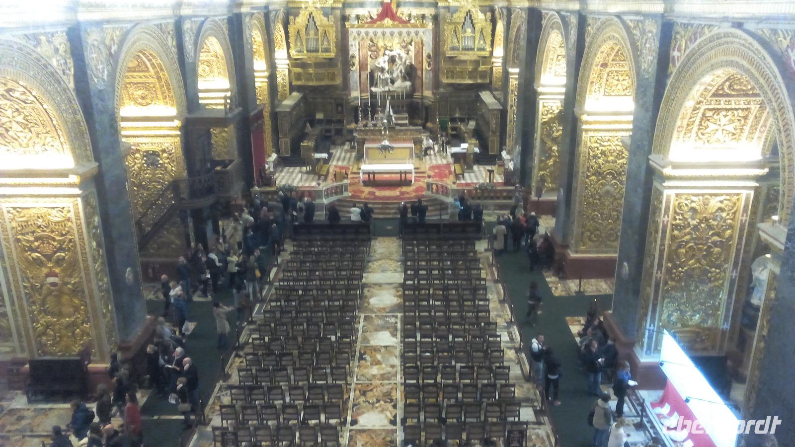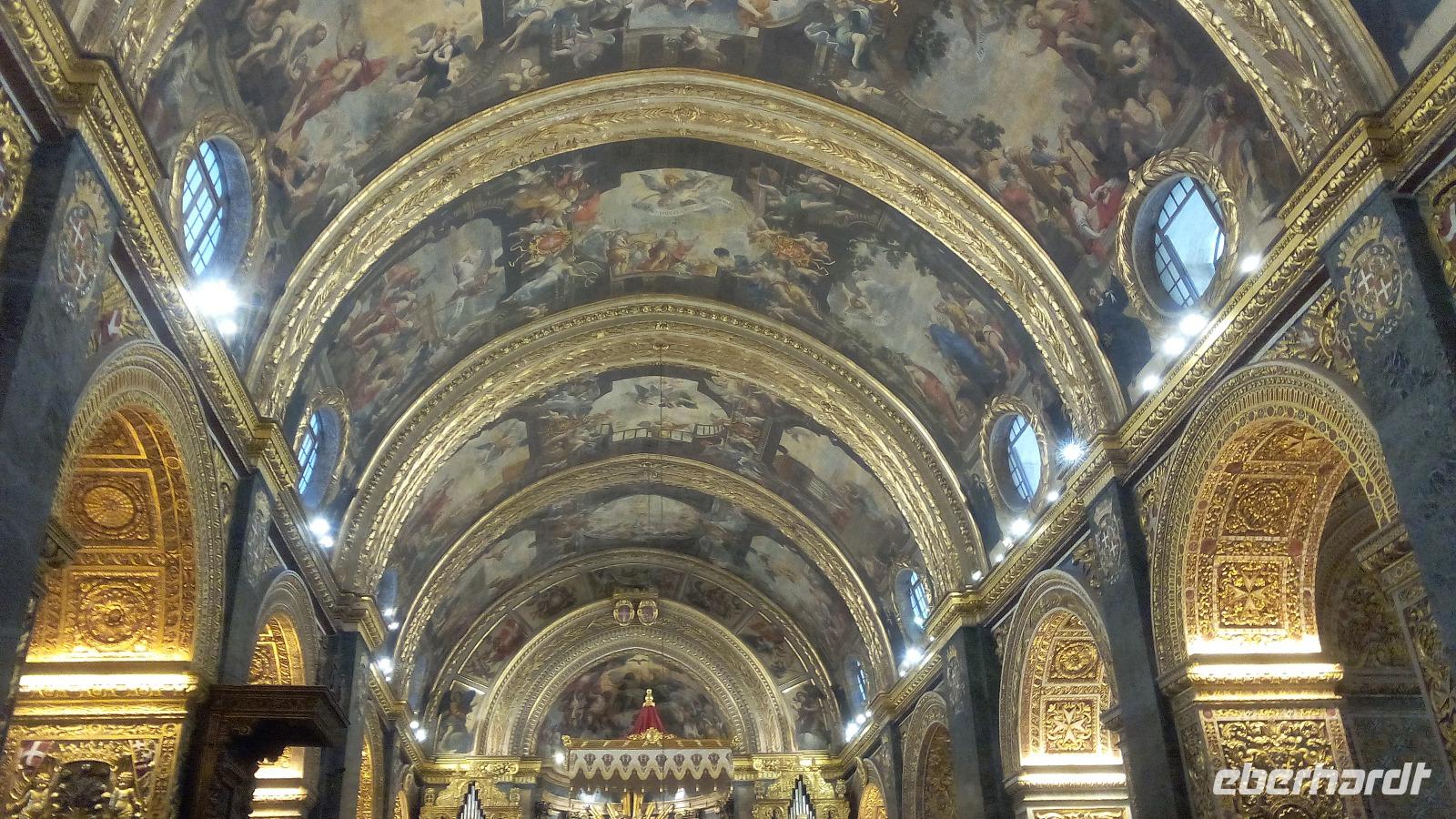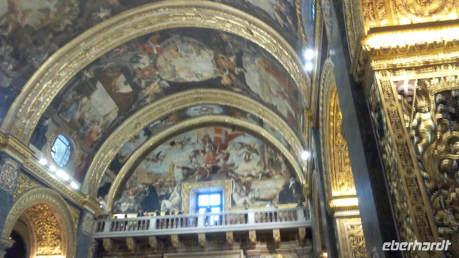 mit dem berühmten Gemälde - Die Enthauptung Johannes des Täufers - vom italienischen Künstler Caravaggio im Oratorium. Wir sind überwältigt von der Pracht im Kirchenschiff. Die prächtige Wandmalerei stammt vom italienischen Maler Mattia Preti, die im 17. Jahrhundert von ihm auf eigene Kosten geschaffen wurden. Dafür wurde der Maler als Ritter in den Orden aufgenommen. Auch der Fußboden mit seinen Grabplatten beeindruckt uns sehr. Hier sehen wir vielfarbige Marmorintarsien, insgesamt sollen es 405 Grabplatten sein. Nach der Führung bleibt uns Zeit, die Kathedrale auf uns wirken zu lassen und es fällt schwer sich auf Neues einzustellen.