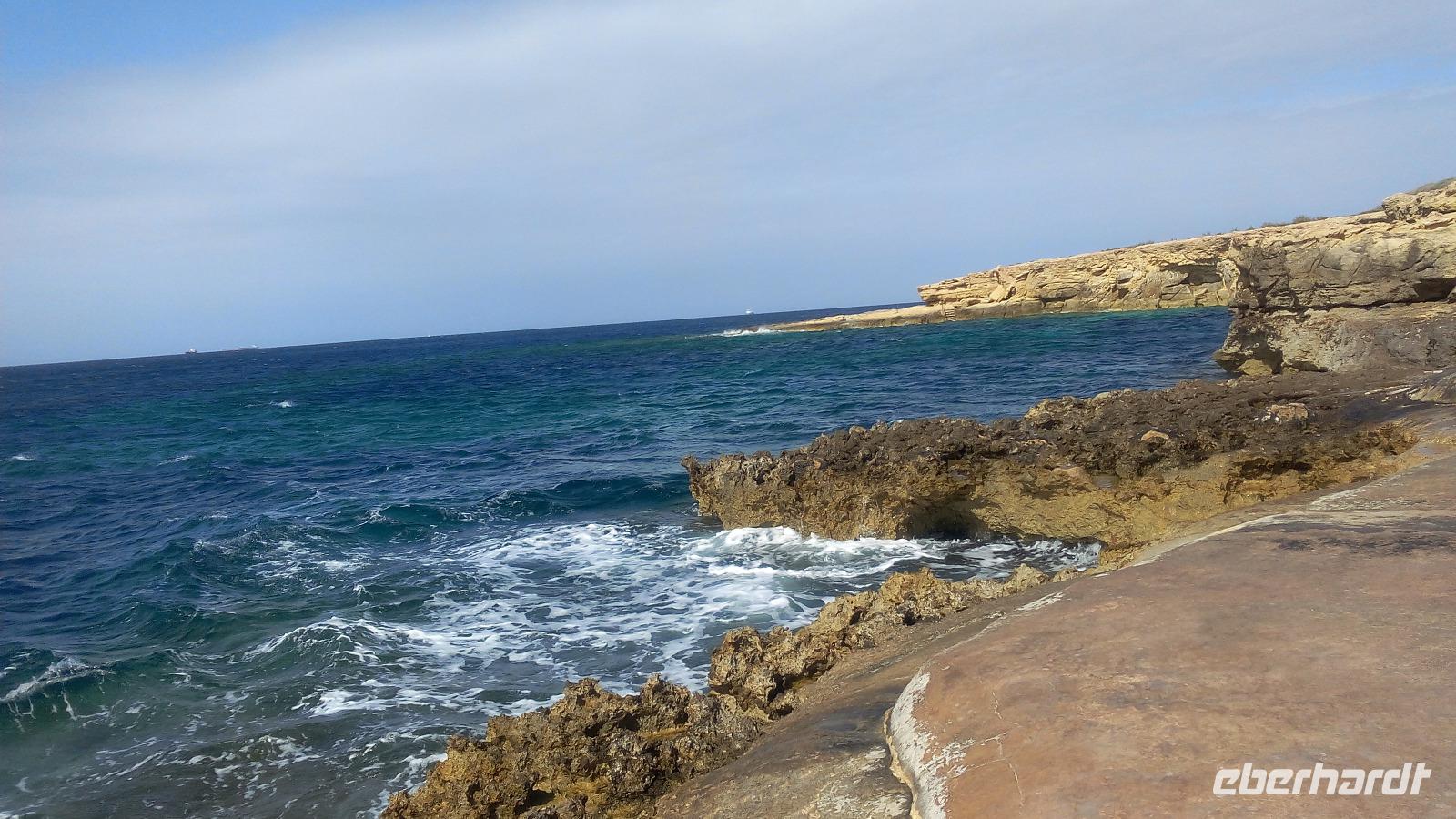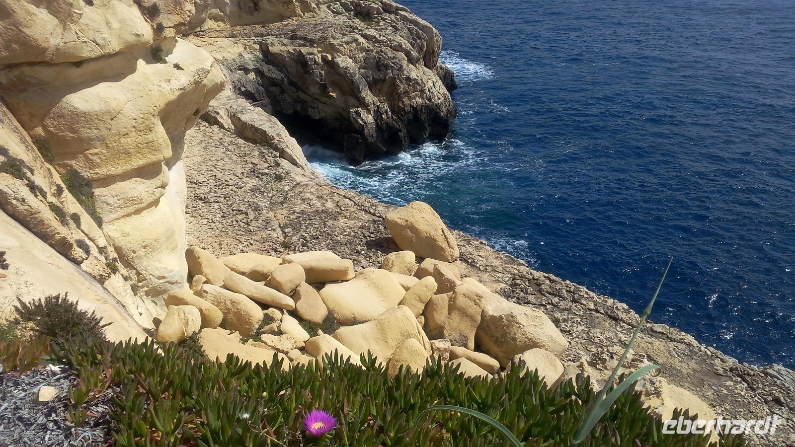 Danach steigen wir wieder in den Bus und fahren zur Ortschaft Zurrieq zur Blauen Grotte. Wenn wir auch nicht mit den Booten fahren können, haben wir aber die Möglichkeit, uns einige Fotomotive auszusuchen. Uns begeistert die schroffe, faszinierende Steilküste. Es ist ein ganzes Höhlensystem. Der Name der Grotte leitet sich von der Blauen Grotte in Capri ab. Die Malteser nennen sie aber auch Taht il-Hnejja "Unter dem Bogen" und das trifft den Punkt. Zwischenzeitlich ist die Zeit fortgeschritten und wir planen unsere Mittagpause im beschaulichen