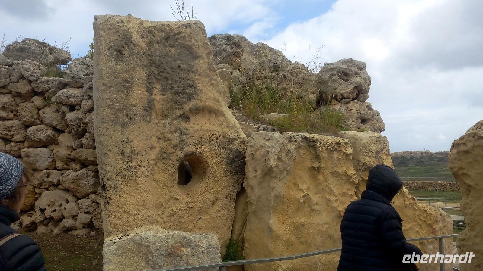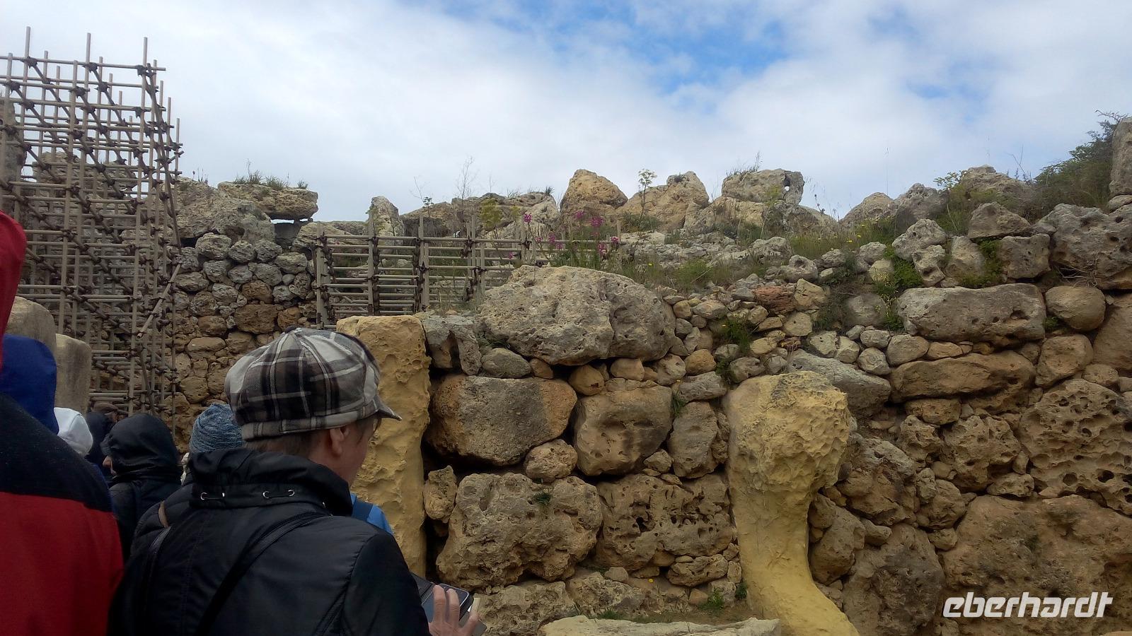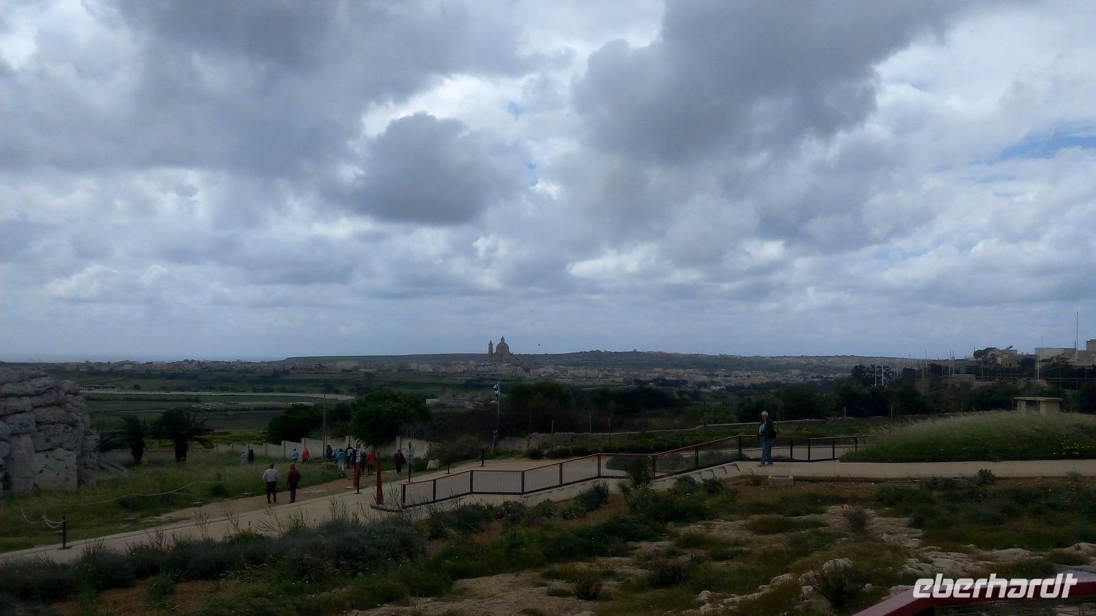 Wir treffen uns in Mgarr am Bus und fahren als Erstes zur Tempelanlage Ggantija Tempel in Xaghra. Diese Anlage soll zwischen 3.600 und 2.400 v. Ch errichtet wurden sein und wurde noch nicht überdacht. Wir kommen durch das moderne Besucherzentrum und werden auch hier zum geschichtlichen Hintergrund und zu bedeutenden Funden informiert. Der Komplex von Ggantja besteht aus zwei nebeneinanderliegenden Tempeln, die die Gozianer 1827 freigelegt haben. Für sie waren diese das Werk einer Riesin, die die gesamte Anlage in einer einzigen Nacht erbaut haben soll und dabei noch ihr Kind auf dem Arm trug.
