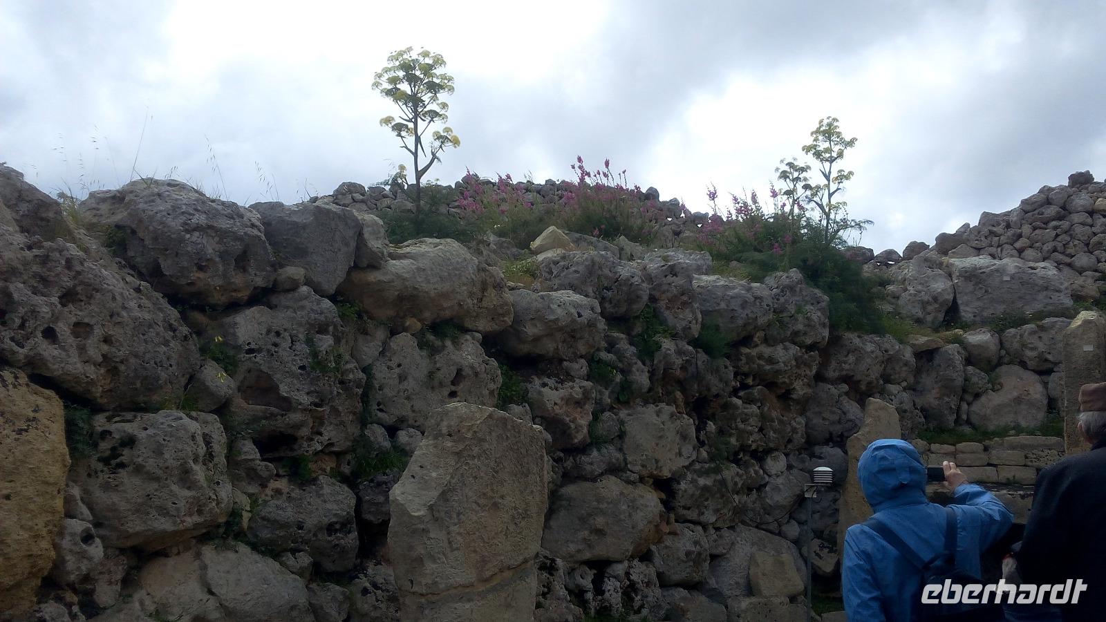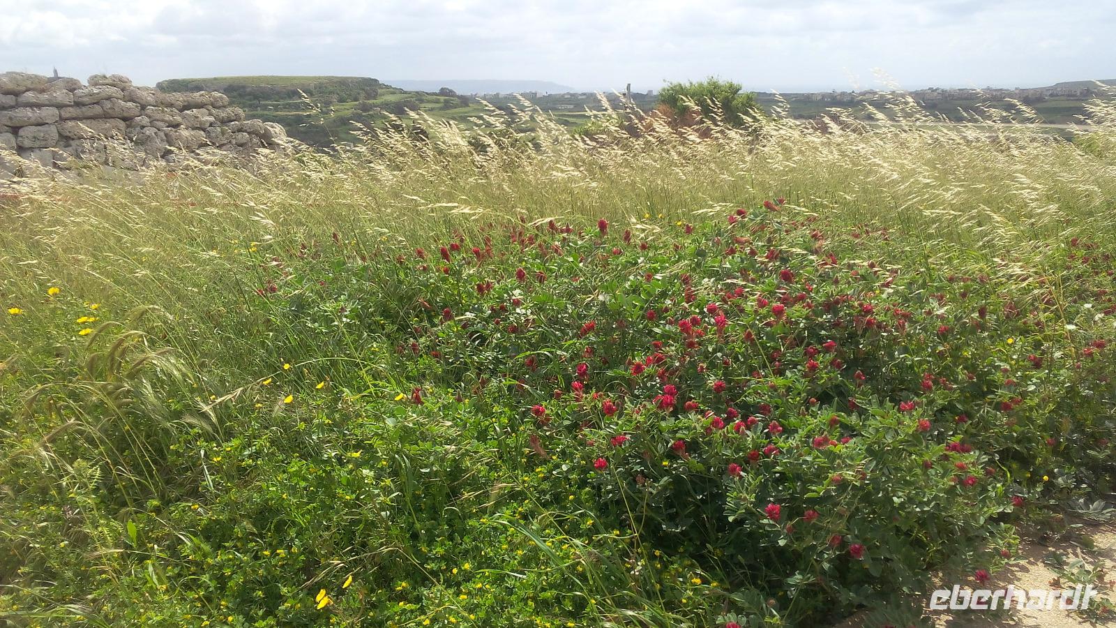 Zum Schutz vor Umwelteinflüssen hat die Anlage eine Zeltkuppel. Wir lauschen Anitas Ausführung und genießen nebenbei den Blick vom Hochplateau aus über das Mittelmeer. Von hieraus sehen wir auch die Insel Filfla, das Helgoland von Malta. Auf dem Weg zum Tempel Mnajdra haben wir bunte Wiesen und sind uns nicht ganz sicher, ob sich neben den unterschiedlichen Blumen auch Orchideen befinden.