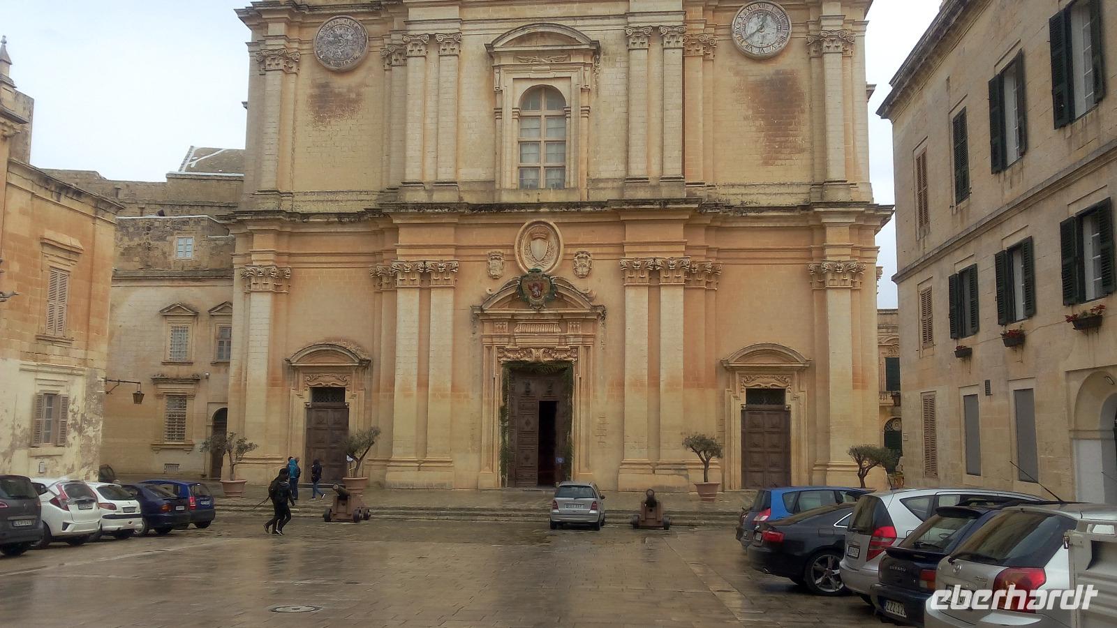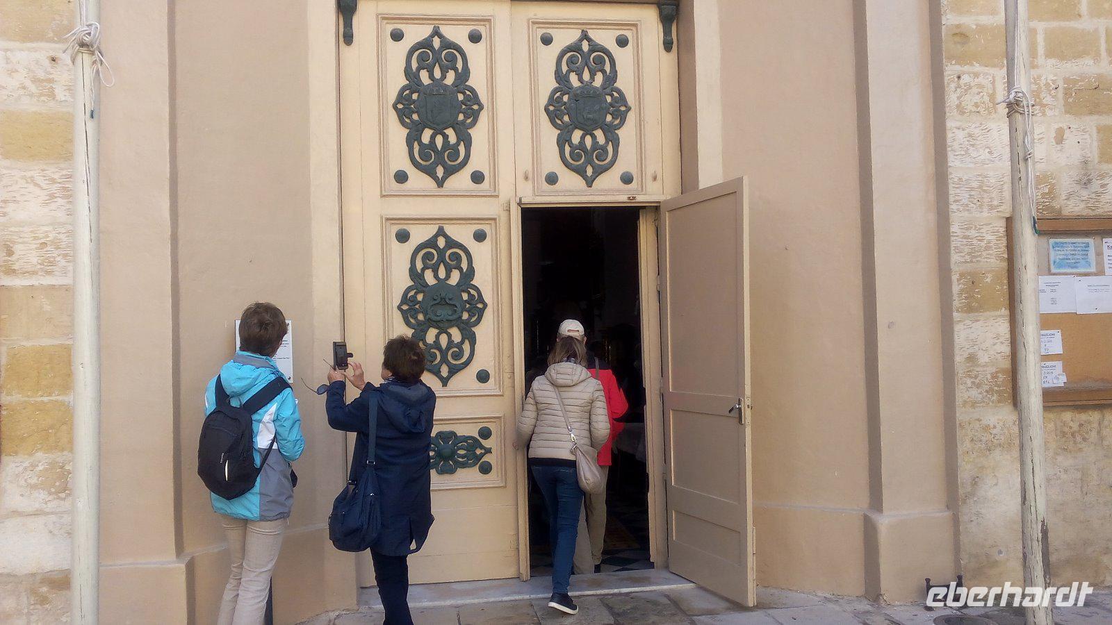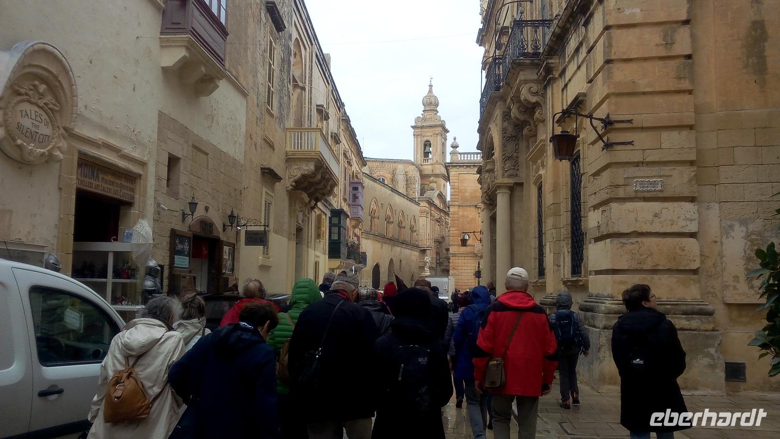 sehen wir uns bei Sonne an. Die felsige Küste, die stellenweise 200 Meter steil in Wasser fällt bestaunen wir von der Kapelle St. Mary Magdalena. Danach fahren wir zurück nach Mdina. Es regnet und regnet. Deshalb besuchen wir den Handwerkerhof und schauen den Glasbläsern bei der Herstellung des Mdina-Glases zu. Der zweite Versuch Mdina trocken zu besichtigen gelingt. Wir kommen in die Altstadt durch das Haupttor und laufen entlang der Mittelachse bis zum Pjazza Tas-Sur. Von hieraus haben wir eine fantastische Sicht auf die Insel. Nun wird es Zeit, eine Mittagspause zu planen. Im Cafe Fontanelle wird der sehr gut schmeckende Schokoladenkuchen probiert. Während dieser Pause haben wir die Gelegenheit, das Cathedral-Museum zu besuchen. Für uns war sehr interessant, dass wir hier Werke von Albrecht Dürer und auch ein Gemälde von Angelika Kauffmann betrachten konnten. Danach führt uns Anita in die Cathedral of St. Peter und Paul.