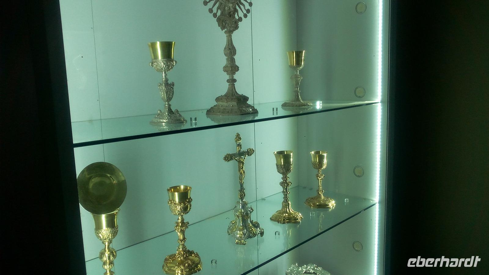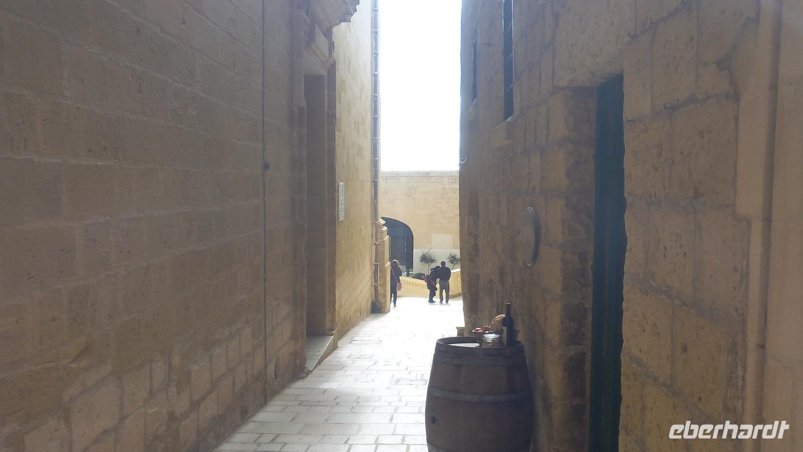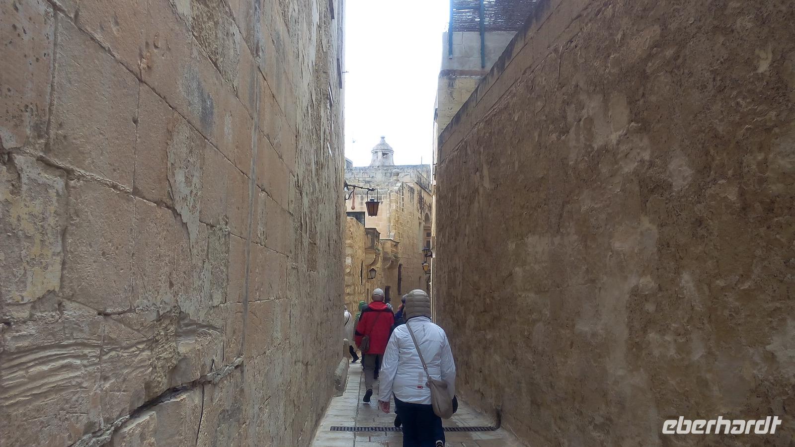 sehen wir uns bei Sonne an. Die felsige Küste, die stellenweise 200 Meter steil in Wasser fällt bestaunen wir von der Kapelle St. Mary Magdalena. Danach fahren wir zurück nach Mdina. Es regnet und regnet. Deshalb besuchen wir den Handwerkerhof und schauen den Glasbläsern bei der Herstellung des Mdina-Glases zu. Der zweite Versuch Mdina trocken zu besichtigen gelingt. Wir kommen in die Altstadt durch das Haupttor und laufen entlang der Mittelachse bis zum Pjazza Tas-Sur. Von hieraus haben wir eine fantastische Sicht auf die Insel. Nun wird es Zeit, eine Mittagspause zu planen. Im Cafe Fontanelle wird der sehr gut schmeckende Schokoladenkuchen probiert. Während dieser Pause haben wir die Gelegenheit, das Cathedral-Museum zu besuchen. Für uns war sehr interessant, dass wir hier Werke von Albrecht Dürer und auch ein Gemälde von Angelika Kauffmann betrachten konnten. Danach führt uns Anita in die Cathedral of St. Peter und Paul.