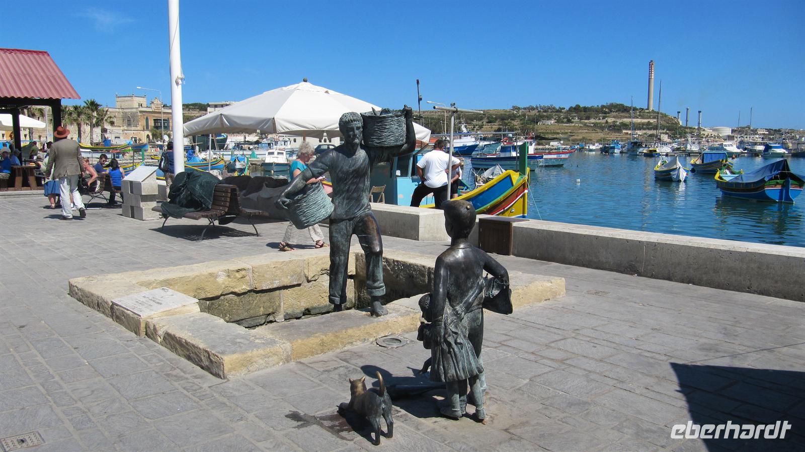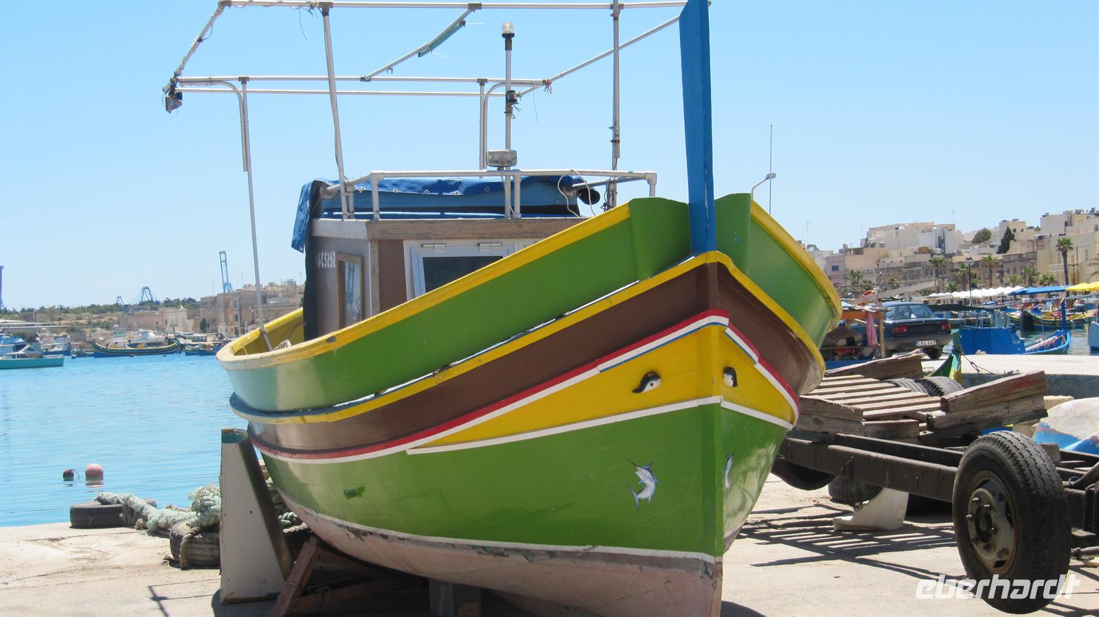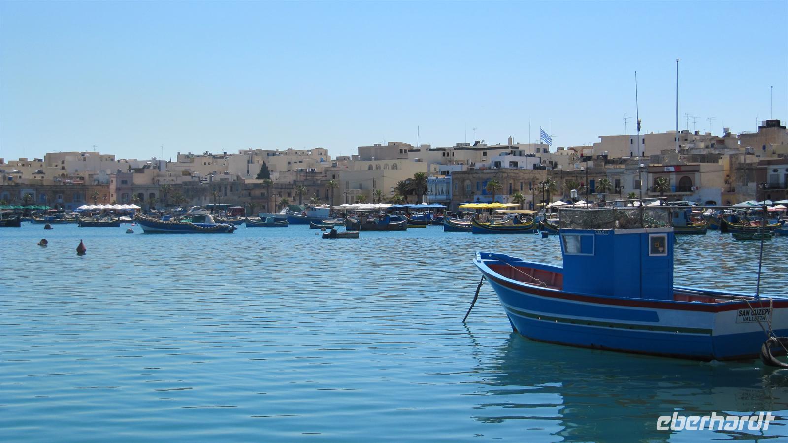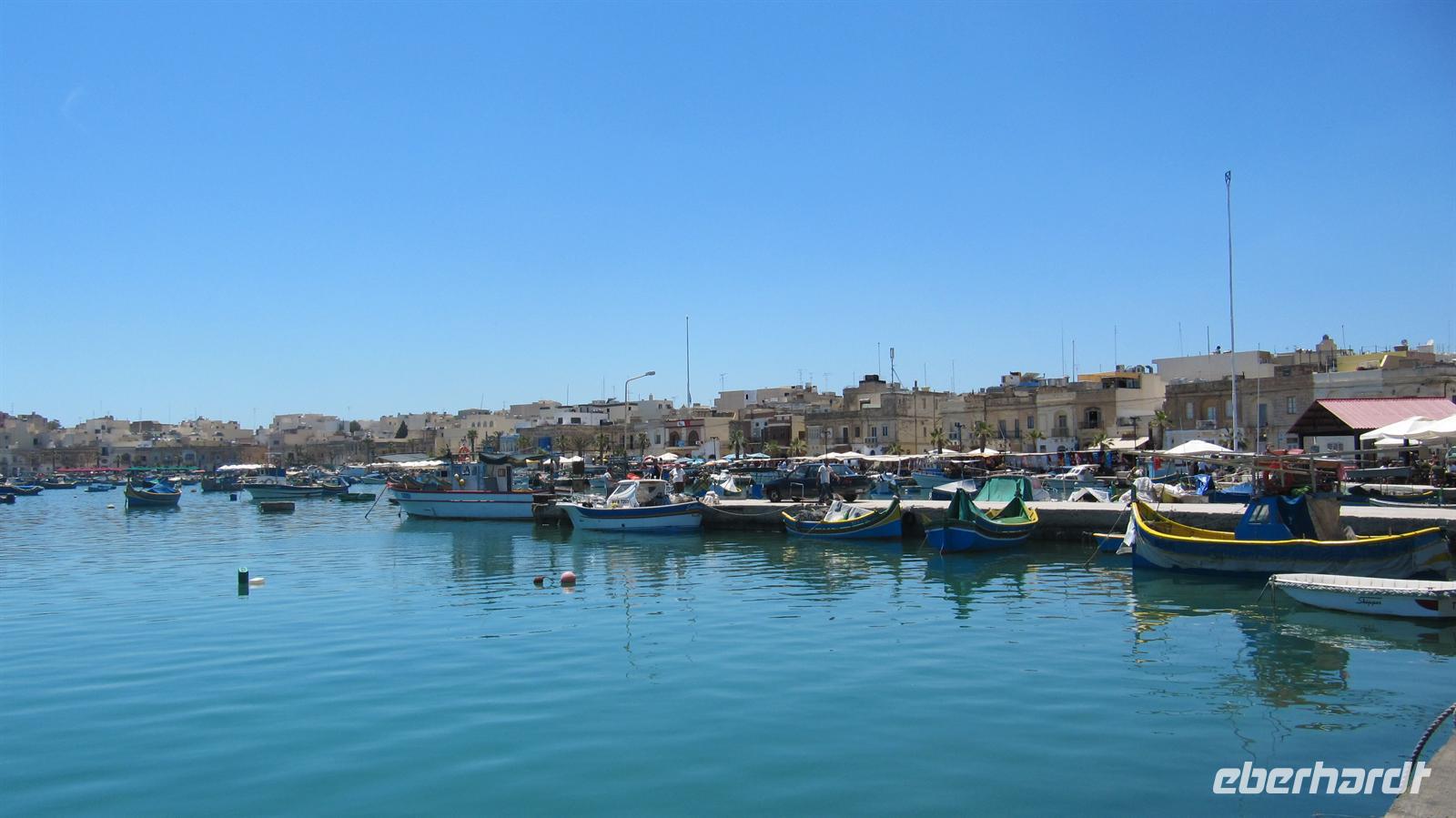 Nun fuhren wir in das kleine Fischerdorf Marsaxlokk. Idyllisch in einer kleinen Bucht gelegen strahlte der kleine Ort viel Charme aus. Kunterbunte Fischerboote lagen im Hafen, alle mit den „Augen zum Schutz vor dem bösen Blick“ bemalt. In einem der netten kleinen Restaurants stärkten wir uns zunächst bevor wir noch über den kleinen Markt spazierten.