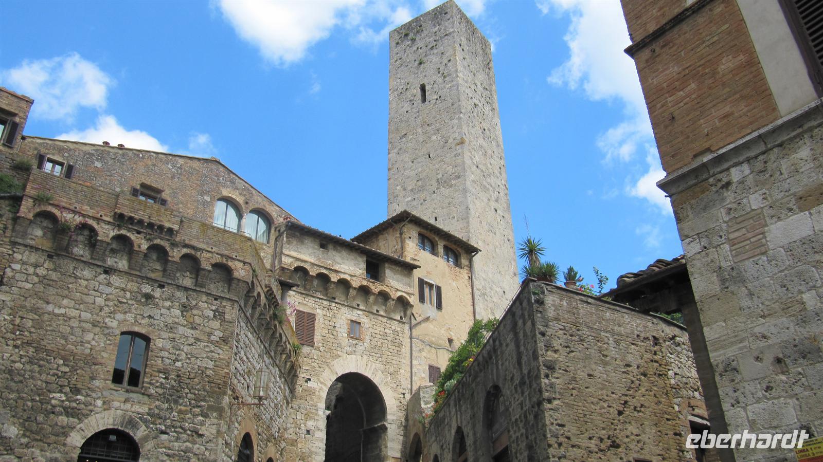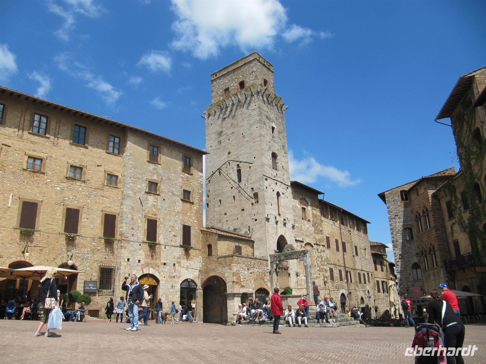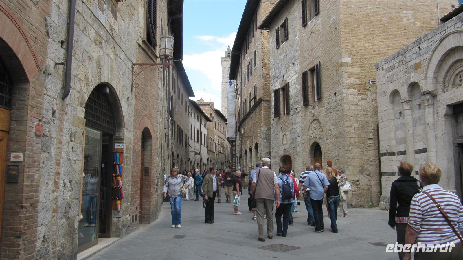 Danach führte uns unsere Reise durch die typische toskanische Landschaft mit Zypressenhainen, Olivenplantagen und hübschen mediterranen Häusern nach San Gimignano. Anna bummelte mit uns durch die Hauptgasse zum Zisternenplatz, dem Hauptplatz des sehr gut erhaltenen mittelalterlichen Ortes. Hohe trutzige Türme prägen das Stadtbild. Diese sind Geschlechtertürme, welche von den ansässigen Familien im Mittelalter errichtet wurden und den Reichtum der Familien symbolisierten. Je höher der Turm war, desto reicher war die Familie. Hier an diesem Platz produziert und verkauft der Weltmeister der Eismacher sein köstliches Eis. Natürlich kamen wir daran nicht vorbei, ohne mal zu kosten. Die Wahl unter den mindestens zwanzig verschiedenen Sorten fiel uns sehr schwer. Nun war es Zeit, die Rückfahrt zum Schiff wiederum durch die liebliche Landschaft der Toskana anzutreten.
