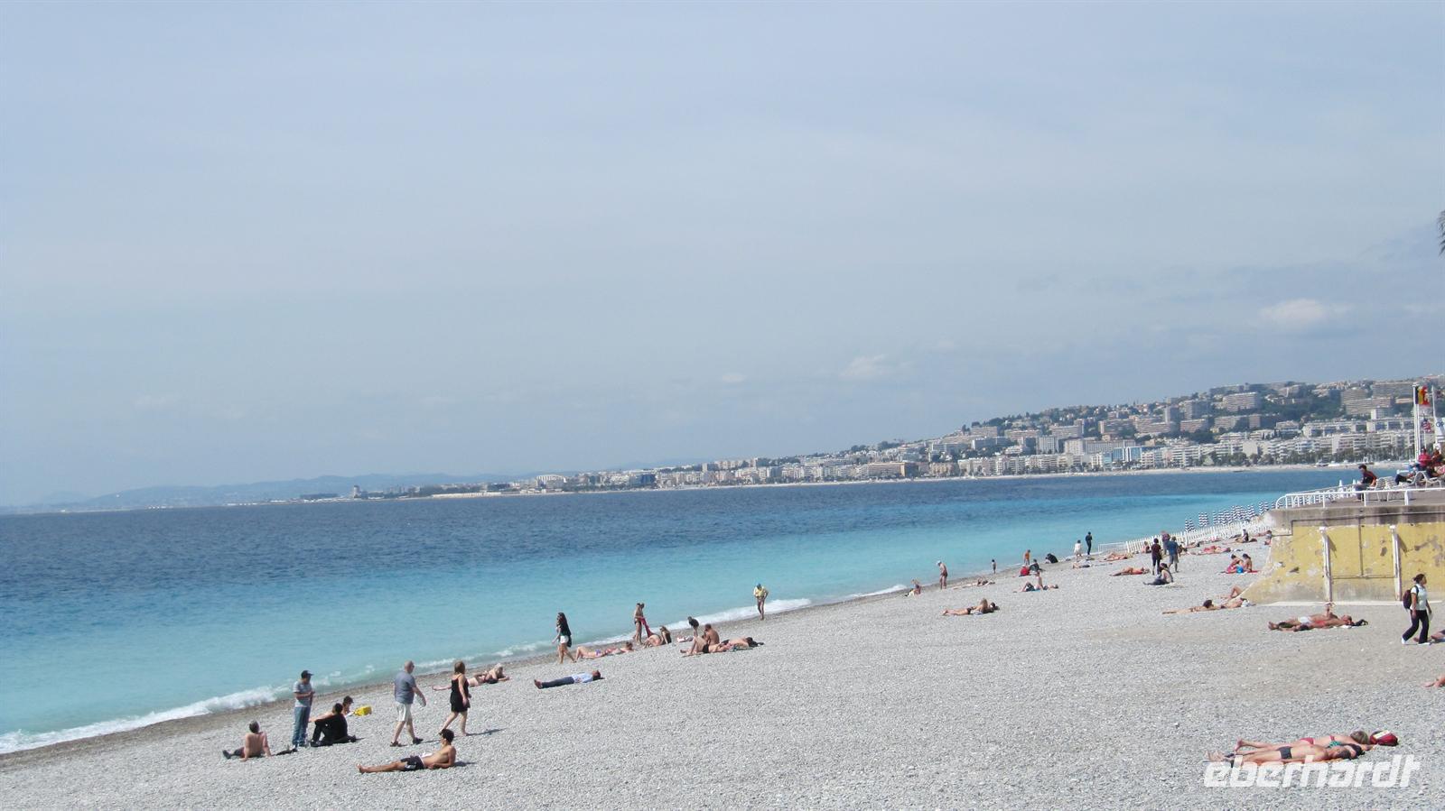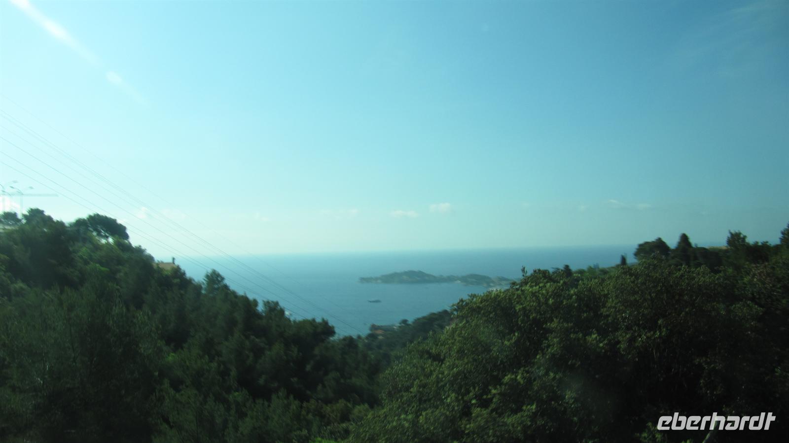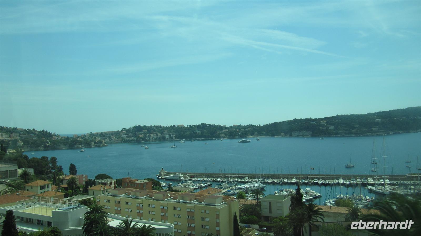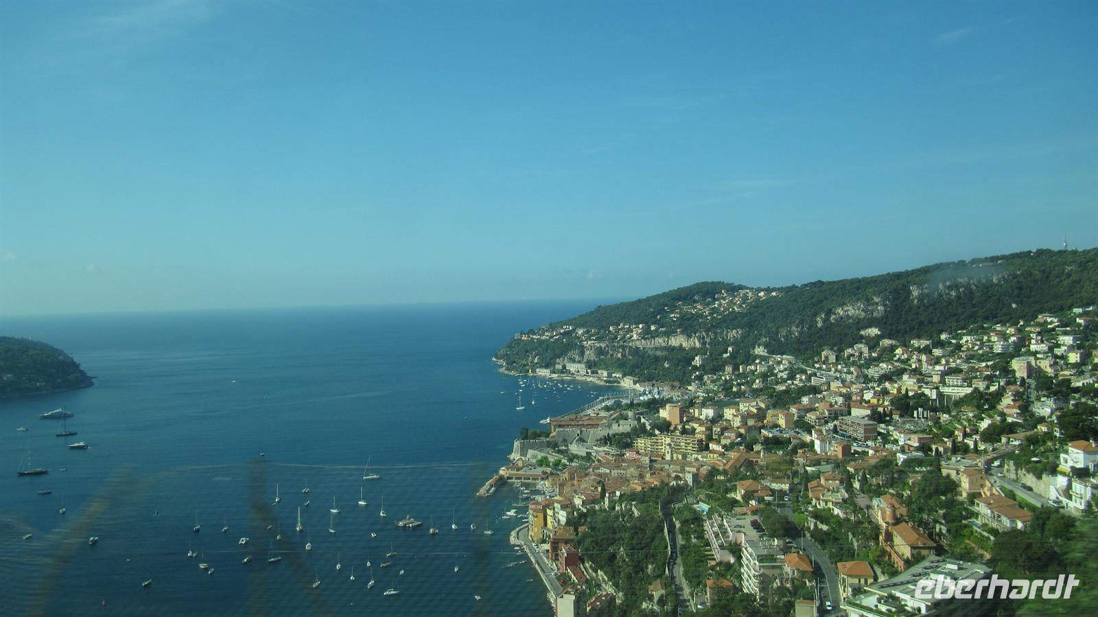 Gespannt begannen wir mit Jutta, unsrer örtlichen Reiseleiterin, unseren Eberhardt-Ausflug. Zunächst fuhren wir auf der mittleren Küstenstraße nach Nizza, welches nur 18 Kilometer von Monaco entfernt liegt. Entlang der Küste ziehen sich drei Küstenstraßen, die untere, die mittlere und die obere Straße. Wir wählten also die mittlere und uns boten sich herrliche Ausblicke über die Buchten und auf die Villen einiger Prominenter, wie zum Beispiel die Villa der Familie Rotschild