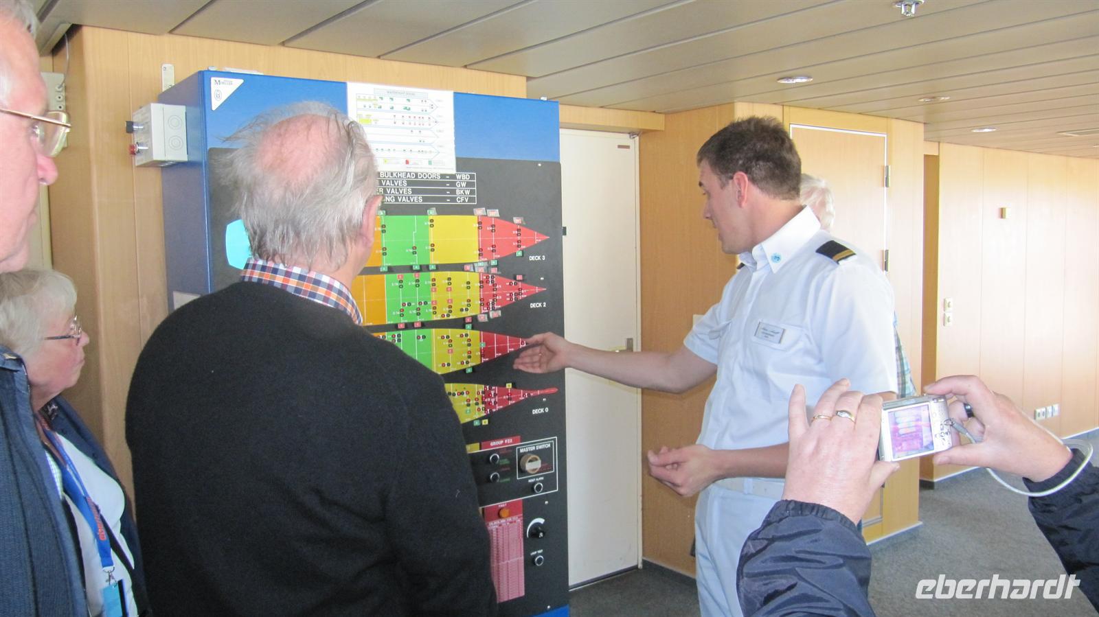 Nun erwartet uns ein ganz besonderes Erlebnis: Wir durften die Brücke des Schiffes besichtigen. Nach einer nochmaligen Sicherheitskontrolle erreichten wir auf Deck 10 die Brücke. Vito, ein Offiziersanwärter, der gerade Dienst hatte, erklärte uns sehr anschaulich alle Instrumente und wie dieses große Schiff mit nur einem kleinen Joy-Stick gesteuert wird. Geduldig beantwortete er jede Frage von uns. Wir waren begeistert, dies sehen zu dürfen.