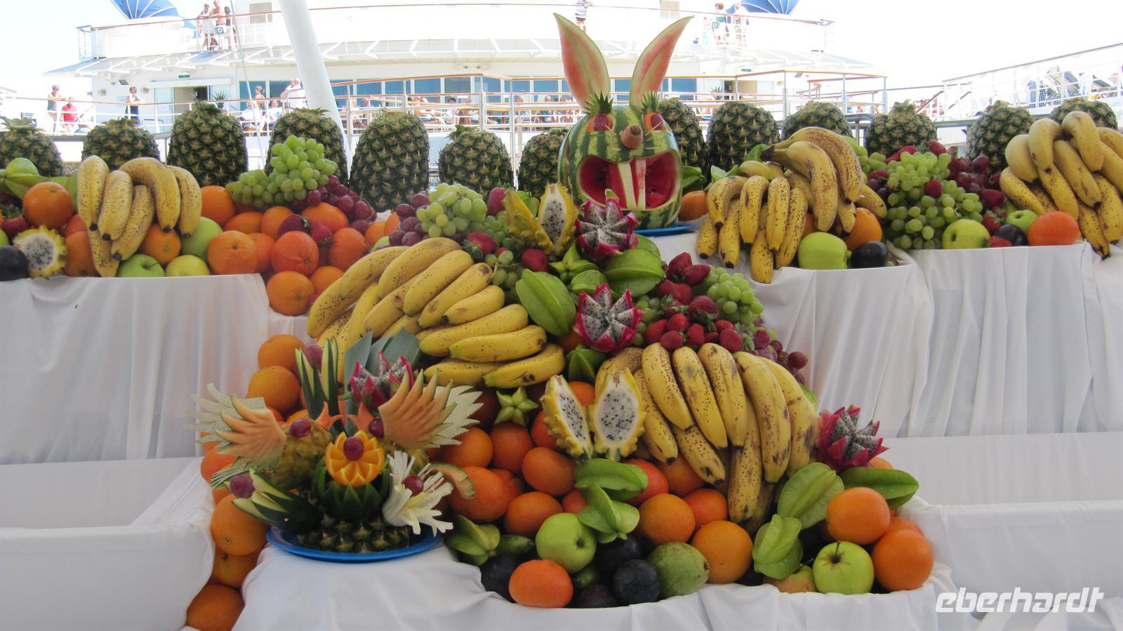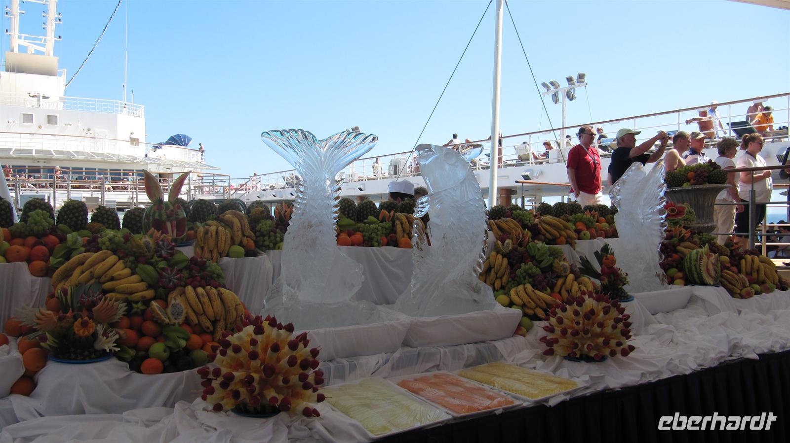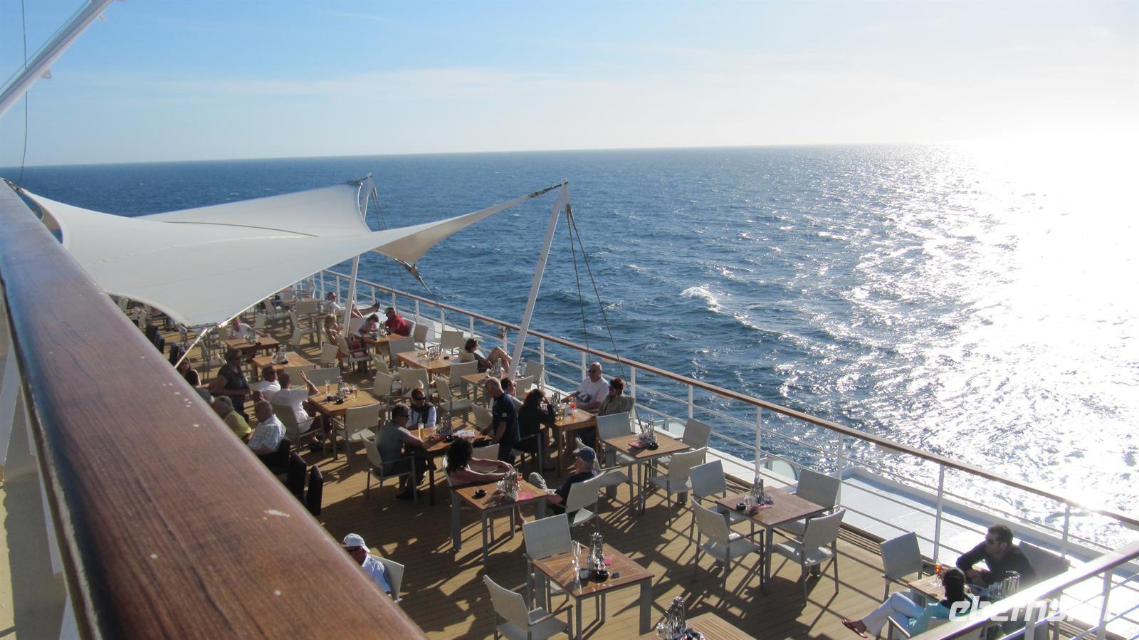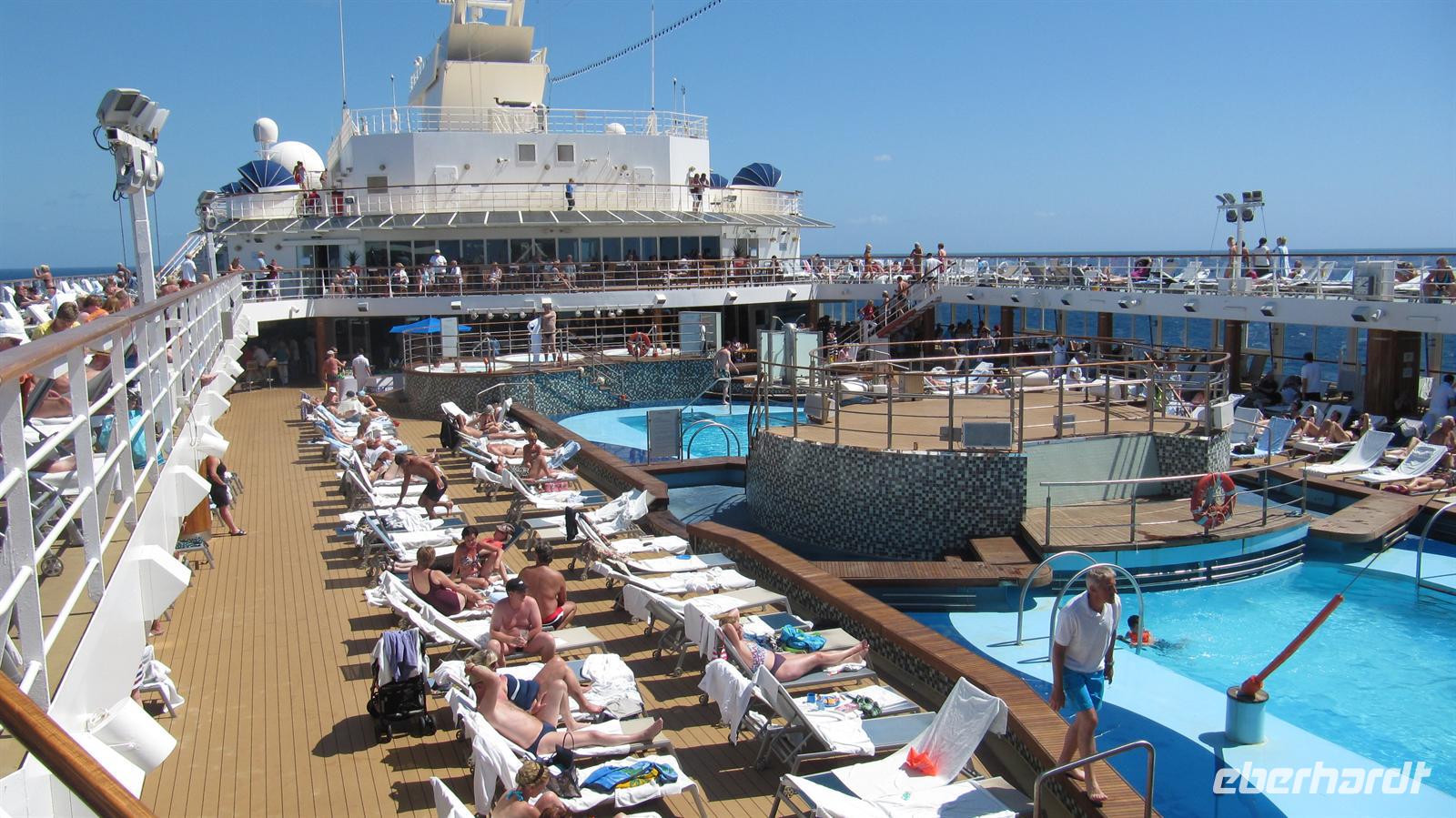 Unser erster wirklicher Tag auf See begann mit Frühstück und Sonnenschein. Den Vormittag nutzten wir zu ersten Entdeckungen auf unserem schwimmenden Hotel. Anschließend genossen wir die Zeit auf dem Sonnendeck, bei sportlichen Aktivitäten oder bei einem Bummel durch die Läden.