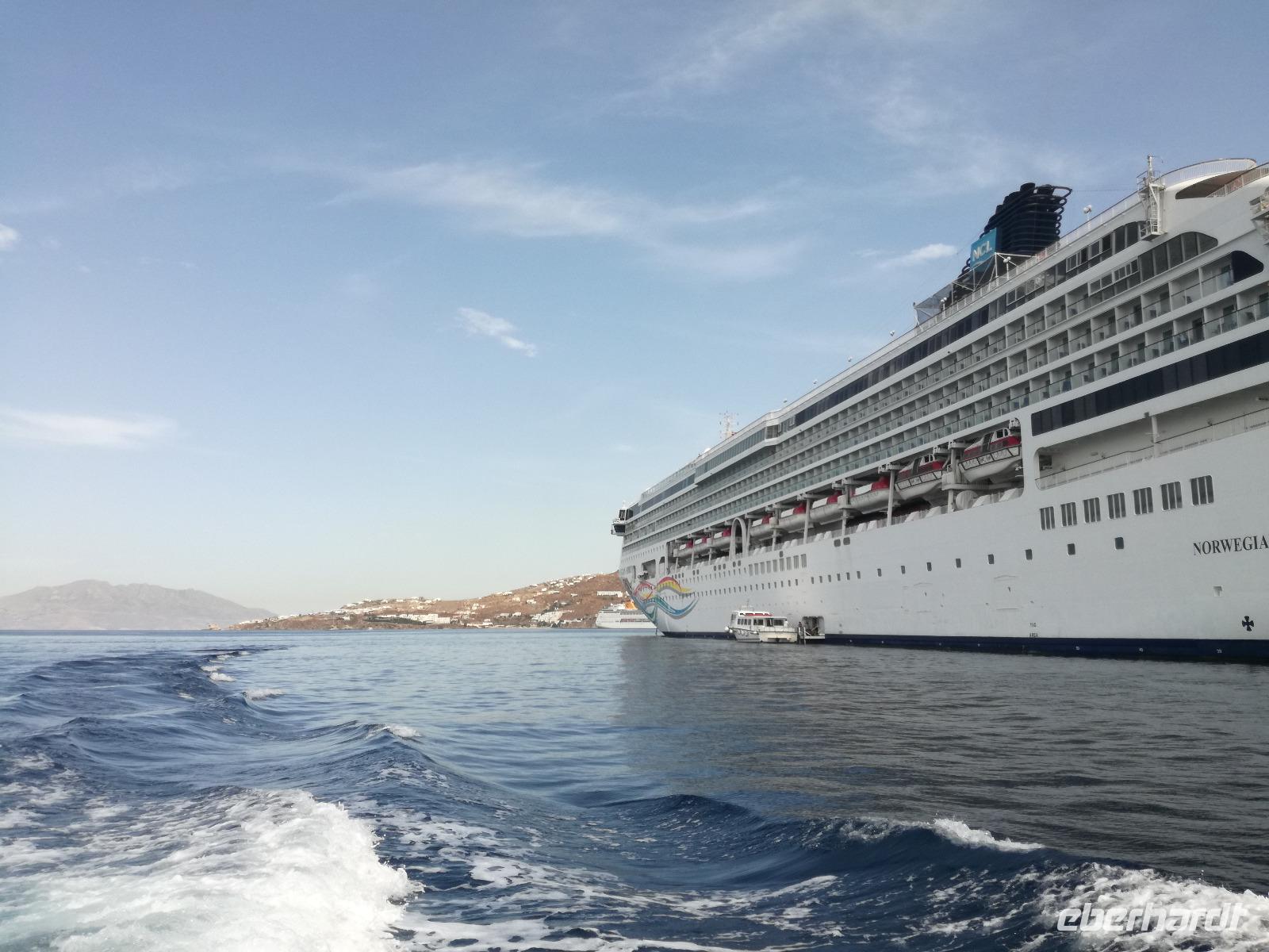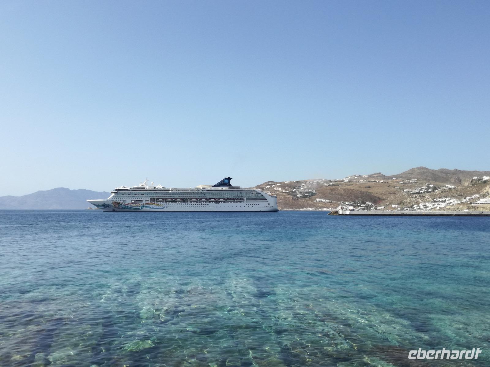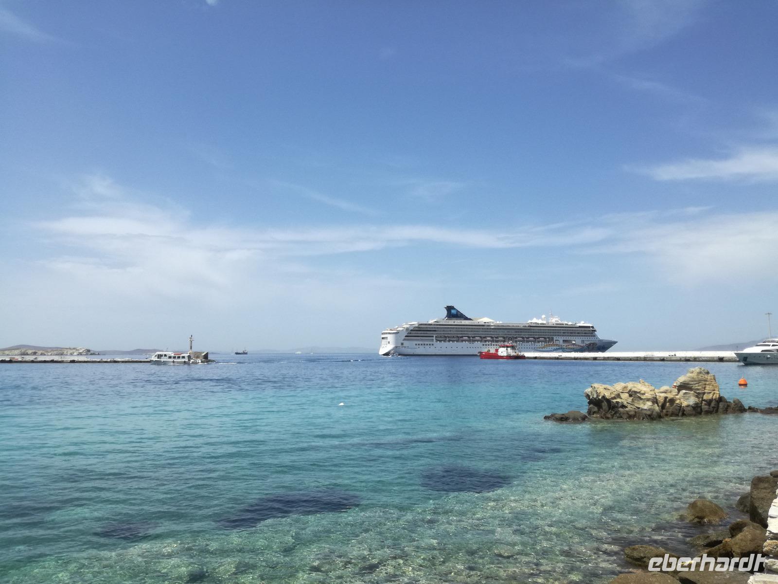 Wir können wieder einmal etwas länger schlafen, auch wenn uns durch die Zeitumstellung eine Stunde Schlaf geraubt wurde. Der Vormittag beginnt entspannt und mit tollem Wetter. Gegen Mittag erreichten wir dann die griechische Insel Mykonos und einige von uns trafen sich für den NCL Ausflug im Theater. Um 12.30 Uhr konnten wir dann mit den Tenderbooten an Land fahren und unseren Ausflug beginnen. Barbara, unsere örtliche, Deutsch sprechende Reiseleiterin empfing uns und gemeinsam liefen wir zum Bus. Durch die heißen Temperaturen auf der Insel waren wir über die Klimaanlage im Bus sehr dankbar und so starteten wir unsere Inselrundfahrt. Bei einigen Fotostopps konnten wir die Schönheit der Insel mit unseren Kameras festhalten. Bei einer kurzen Pause am Strand habe ich es mit natürlich nicht nehmen lassen etwas durch das glasklare Wasser zu laufen - die Wassertemperatur war sehr angenehm und perfekt für eine kurze Erfrischung. Weiter ging es dann zu unserer Mittagspause in Ano Mera, wo wir uns mit einem kleinen Snack und natürlich einem Ouzo (aus Fass Nummer 12?!) stärken konnten. Später fuhren wir dann zurück zum Hafen, wo unsere Inselrundfahrt auch endete. Unsere Reiseleiterin war so nett und zeigte uns noch den Weg zu den Windmühlen - dem berühmten Postkartenmotiv - und erklärte uns auf dem Weg dahin noch einige Interessante Dinge über die kleinen Gassen, durch die wir durchlaufen mussten. Nach einem wunderschönen Nachmittag an Land tenderten wir wieder zurück zum Schiff. Am Abend traf ich mich noch mit ein paar Gästen auf der Raffles Terrasse und es kamen in kurzer Zeit noch einige aus unserer Gruppe dazu, sodass wir den Abend gemütlich mit einem Glas Sekt an Deck ausklingen lassen konnten. Im Hintergrund wurde die Silhouette von Mykonos immer kleiner, während die Sonne am Horizont verschwand.