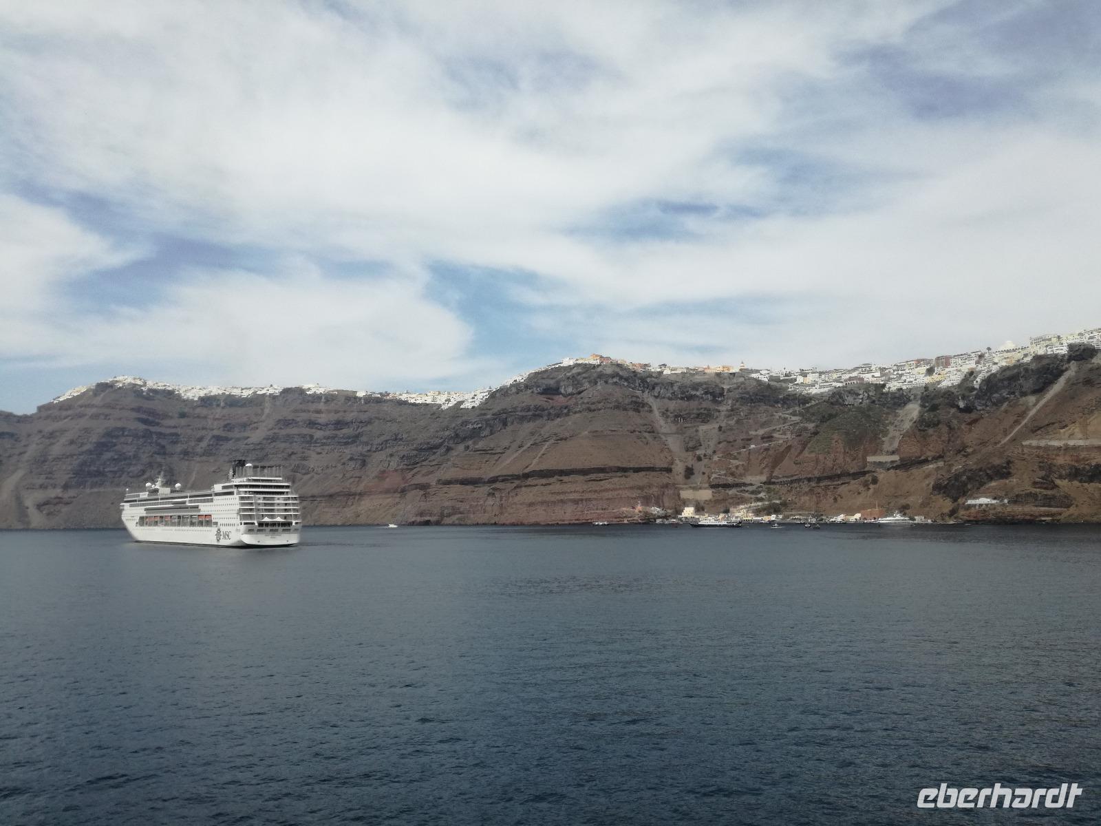 Heute Morgen legten wir vor der wunderschönen Insel Santorini an. Der Name stammt von der Heiligen Sankt Irene - also der Santa Irini. Bereits 08.00 Uhr traf sich der Großteil unserer Gruppe im Theater um am Ausflug nach Oia mit Weingut teilzunehmen. Zunächst tenderten wir an Land und wurden von der Reiseleiterin Andrea herzlich begrüßt und wir fuhren zur Weinkellerei Santo Wines. Dort konnten wir 3 lokale Weine probieren - einen Weißwein, einen Rotwein und noch einen sehr süßen Dessertwein. Dazu wurden kleine Snacks wie Käsehäppchen, Cracker und Oliven gereicht. Bei der wunderschönen Aussicht von der Weinkellerei, schmeckten uns diese Leckereien besonders gut. Danach ging es auch schon weiter in die Ortschaft Oia, wo wir von Andrea ein wenig durch die Stadt geführt wurden und die Stadt aber auch individuell entdecken konnten. Dadurch, dass 4 Kreuzfahrtschiffe vor der Insel lagen, waren die Orte entsprechend überfüllt mit Touristen und so war das Vorankommen sehr beschwerlich. Anschließend trafen wir uns wieder am Busparkplatz und unser Ausflug führte uns weiter in die Hauptstadt Thira, wo der Bus uns absetzte. Nach einem kurzen Spaziergang waren wir dann auch in der Stadt angekommen und somit auch mitten im Gewusel. Die Stadt platzte vor lauter Touristen aus allen Nähten. Demnach war das runterkommen zum Hafen auch eine Aufgabe für sich. Allein an der Seilbahn musste man ca. 1 ½ Stunden warten um in eine Gondel zu kommen. Aber mit ein wenig Geduld und sehr starken Nerven erreichten wir dann endlich den Hafen und konnten zurück zum Schiff tendern. Gegen 17.00 Uhr legten wir ab und fuhren weiter durch die Ägäis in Richtung Kreta. Am Abend lud das Entertainment Team zur White Hot Party auf dem Pooldeck ein. Aber Achtung: Morgen müssen wir wieder um 07.15 Uhr für unseren Ausflug bereit sein! :)