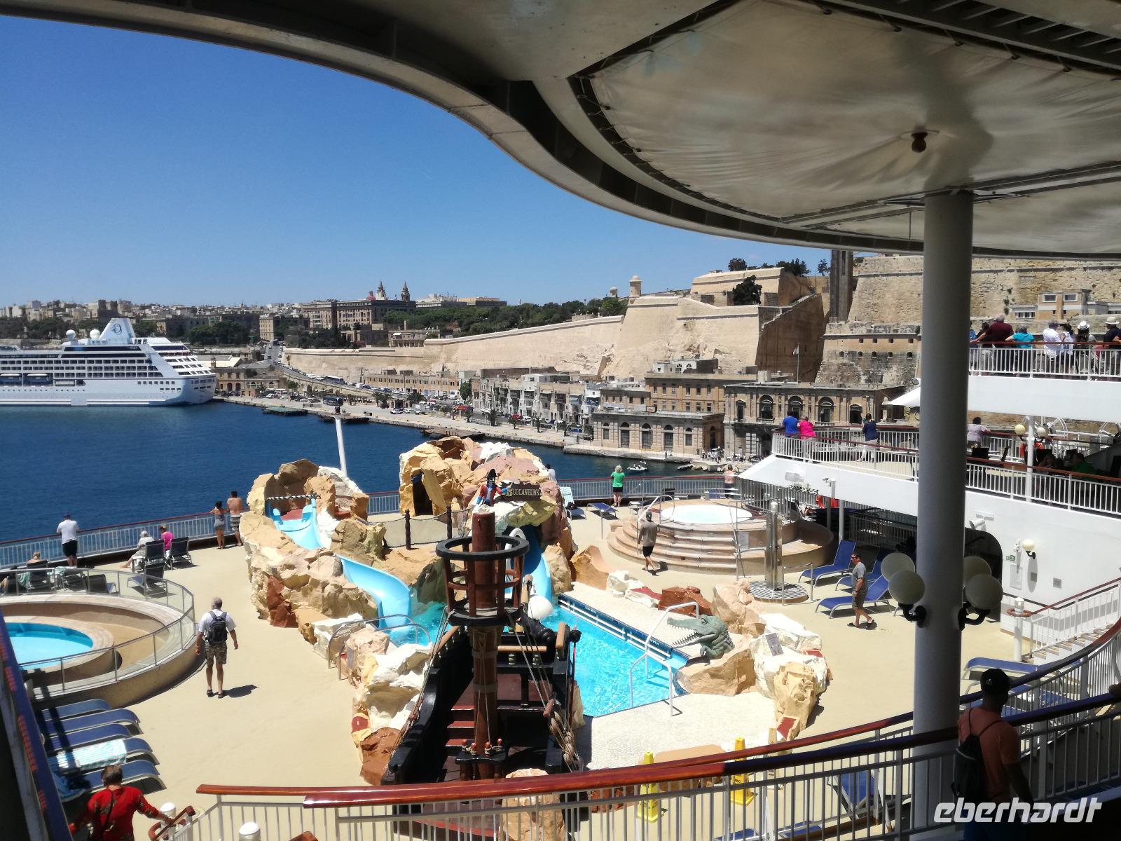 Als wir heute aufwachten scheint bereits die Sonne, denn wir können ausschlafen und die Uhr wieder eine Stunde zurück stellen. Am Vormittag konnte man sich die Zeit gut an Deck vertreiben, denn es wurde am Pool Musik gespielt und es gab ein Barbeque. Aber wir konnten es natürlich kaum erwarten bis das Schiff nun endlich am heutigen Ziel angekommen ist - Valletta, Malta. Nach einer kleinen Verzögerung beim Anlegen konnten wir dann 13.20 Uhr endlich vom Schiff, doch wir mussten erst einmal mit den vielen anderen Gästen durch das Hafenterminal. Als wir es dann endlich nach draußen geschafft haben, begrüßte und schon unsere Reiseleiterin Maria und unser Ausflug in Valletta und Mdina konnte beginnen. Zuerst fuhren wir hinauf in den Garten von Valletta, von wo wir einen wunderschönen Blick über den Hafen hatten. Weiter ging es durch die sehr gepflegte Altstadt zur St. John's Co Cathedrale, die wir auch von innen besichtigen, während uns Maria die vielen Besonderheiten erklärt. Später liefen wir ganz gemütlich die Einkaufsstraße zum Busparkplatz entlang, um den Bus zu erreichen, der uns zum botanischen Garten fuhr. Dort angekommen, bummelten wir durch den Garten mit wunderschönen Blumen und Pflanzen. Der letzte Stopp unseres Ausflugs soll die ehemalige Hauptstadt Maltas sein - Mdina. Auch hier sind wir erstaunt, wie sauber und gepflegt es ist. Wir kommen an einem kleinen Restaurant vorbei - dem Fontanella und haben von hier eine wunderbare Aussicht auf Valletta und die Küste Maltas. Nach etwas Freizeit in Mdina ging es wieder zurück zum Schiff, wo unser Ausflug endete. Geschafft aber voller neuer Eindrücke kommen wir wieder an Bord. Am Abend traf ich mich noch mit einigen Gästen zum gemeinsamen Abendessen, bis wir schließlich aus dem Restaurant quasi geworfen wurden.