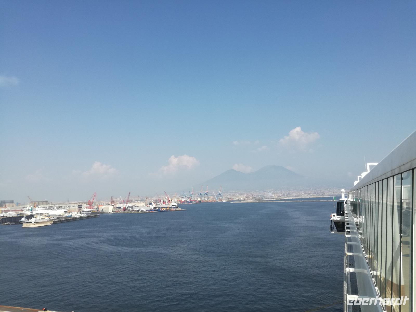 Neapel begrüßte uns mit einem wunderschönen Postkarten-Wetter. Sonne, blauer Himmel und es war schon morgens sehr warm. Gegen 10.00 Uhr machte ich mich mit einigen Gästen auf den Weg in die Stadt und als wir aus dem Hafenterminal heraus gekommen waren, wurden wir schon belagert mit den vielen Taxifahrern, die uns eine Fahrt nach Pompeij oder zum Vesuv andrehen wollten. Wir entschieden uns dann eher für die klassische Variante - eine Stadtrundfahrt mit dem Bus. Also sind wir in den nächsten Hop-on Hop-off Bus gestiegen und fuhren zunächst die rote Linie ab - wir fuhren durch die Stadt und kamen an den wichtigsten Plätzen und Gebäuden vorbei und haben in der einen Stunde viel von der Stadt sehen konnen. Als wir wieder am Busterminal ankamen, stiegen wir um in die blaue Linie, die immer die Küste entlang fuhr. Bei einem kurzen Fotostopp konnten wir die wunderschöne Aussicht auf Neapel genießen. Wir fuhren dann wieder zurück in die Stadt und natürlich lies ich mir es nicht nehmen, in der ältesten Pizzeria eine Pizza zu essen - wer wollte, konnte mich gern begleiten. Nach einem schönen Spaziergang zurück zum Schiff, traf ich an Bord auch einige aus unserer Gruppe wieder, aber viele waren mit packen beschäftigt, was auch noch auf mich zukommen sollte. Am Abend traf ich mich mit dem Großteil unserer Gruppe zum letzten, gemeinsamen Abendessen an Bord im Restaurant Windows. Wir genossen ein letztes Mal noch die Leckereien, die uns aufgetischt wurden und ließen den Abend mit einem leckeren Cocktail ausklingen.