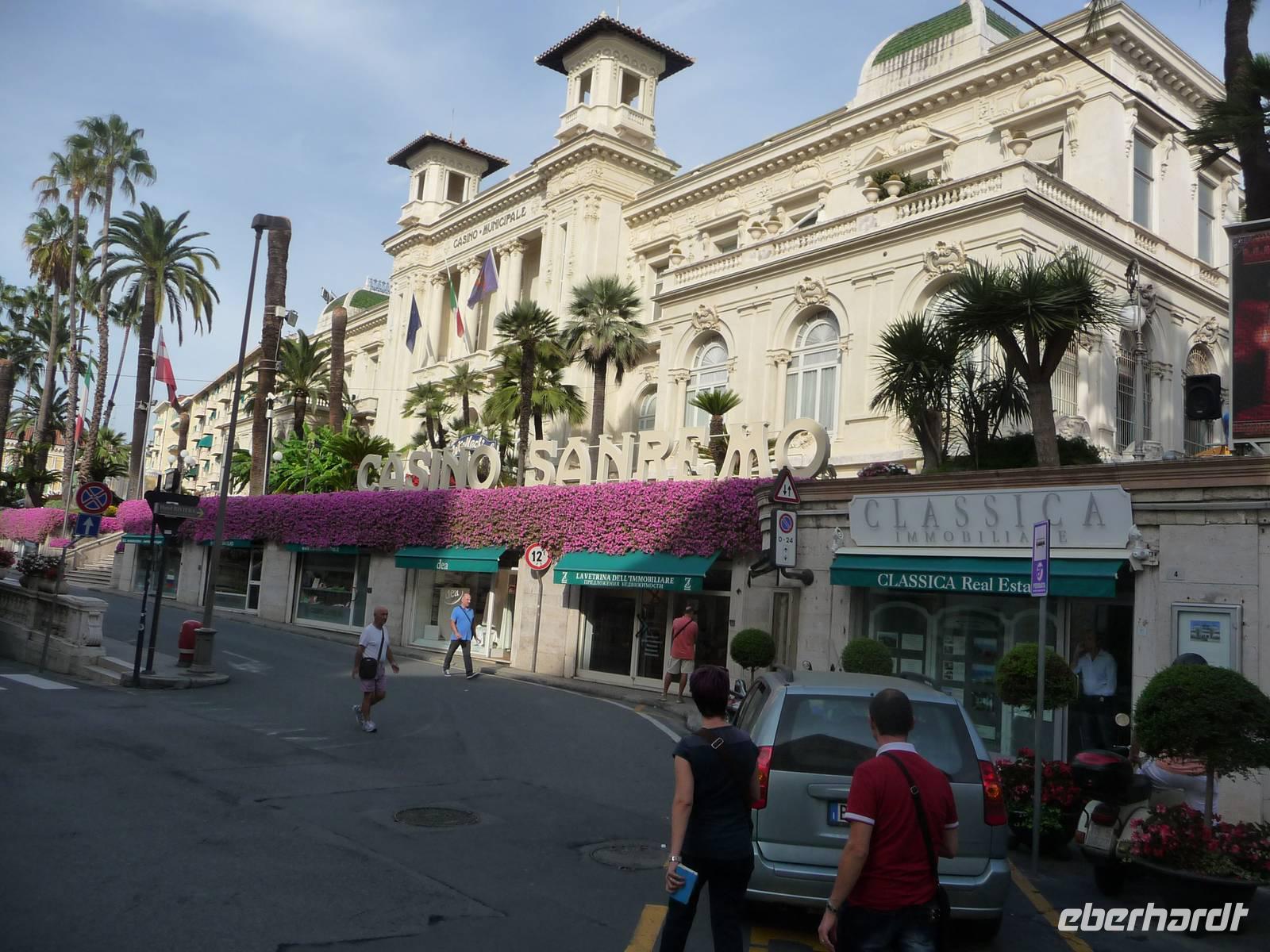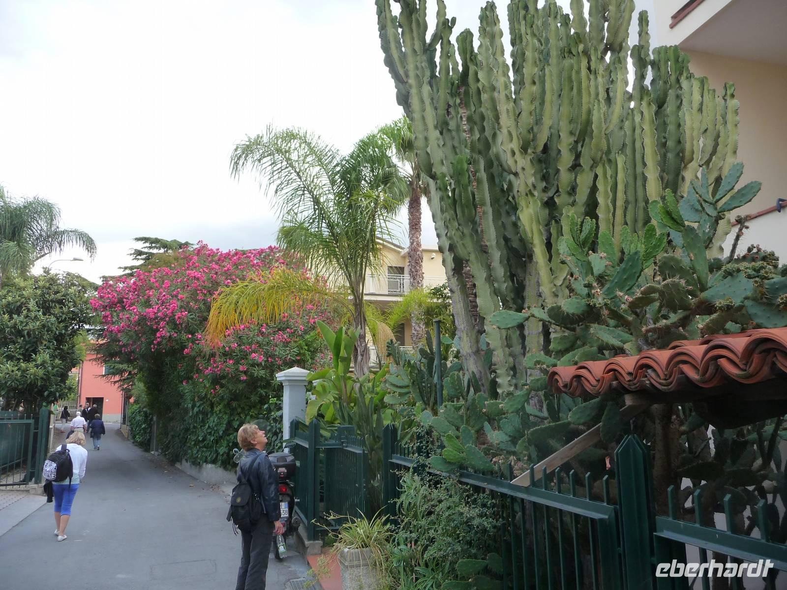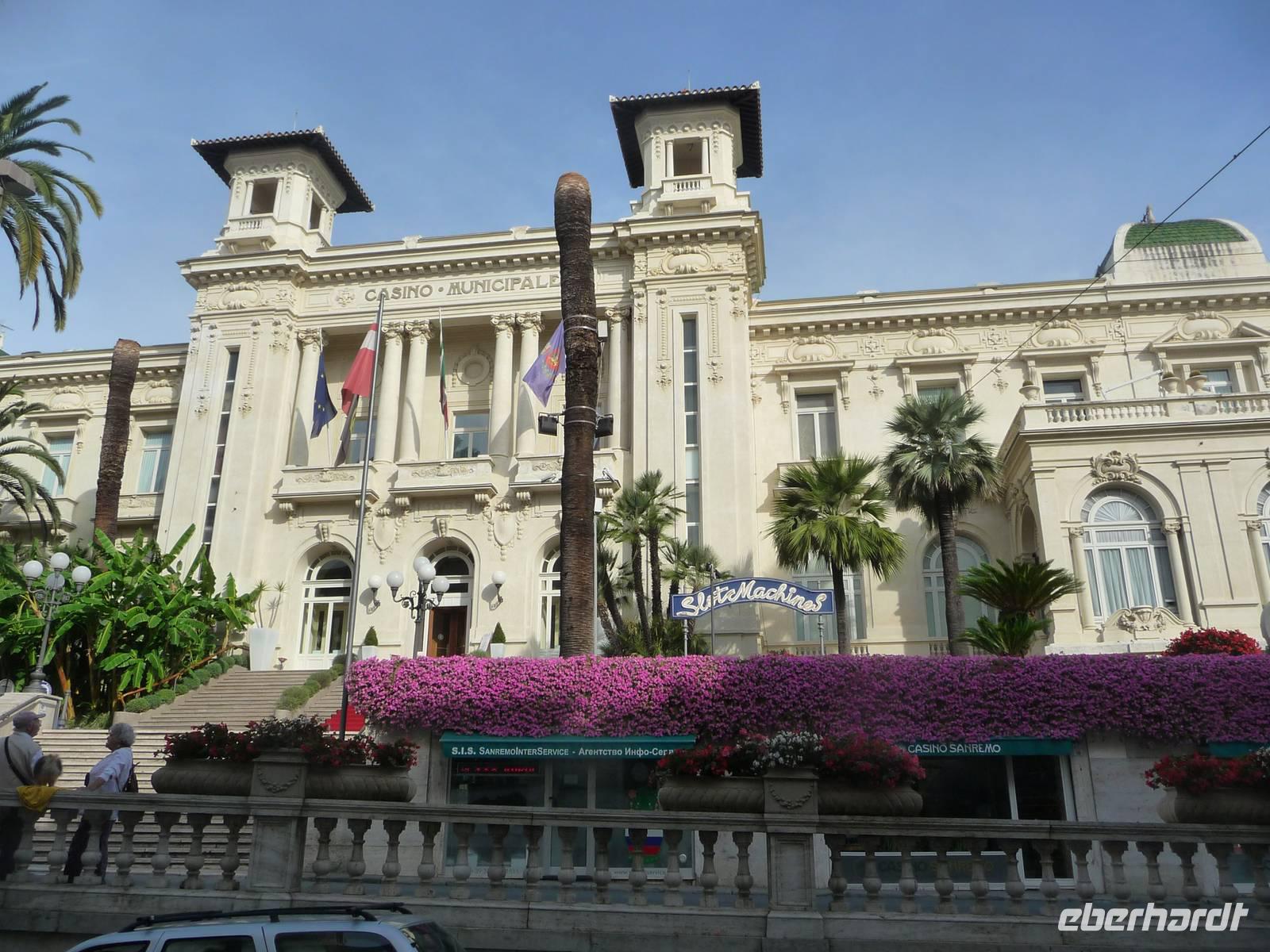 Am Hotel werden wir von Cinzia unserer Stadtführerin mit viel italienischem Temperament pünktlich abgeholt und wir fahren nach Sanremo, dem Hauptort der Blumenriviera. Die Stadt wird auch "Blumenstadt" genannt, nicht zuletzt wegen der Blumen- und Pflanzenzucht, der Sanremo seinen wirtschaftlichen Wohlstand verdankt. Bei wunderbarem Wetter, nicht zuletzt durch die geschützte Lage der nahen ligurischen Seealpen, laufen wir sehr bald an der berühmten Spielbank, dem Casino di Sanremo, vorbei, wo seit den 50er Jahren das berühmte Sanremo - Musikfestival stattfindet. Wir schauen auf Villen aus der Zeit der Belle Epoque, die von reichen Kunstmäzenen Ende des 19.Jh. erworben und im neugotischen Stil umgebaut wurden. Wir erfahren vom ältesten Stadtteil "Pigna", der auf einem steilen Hügel liegt mit ebenso steilen Sträßchen, mit überdeckten Durchgängen in denen es auch am Tage so dunkel ist, dass man die Laternen rund um die Uhr brennen lassen muß.