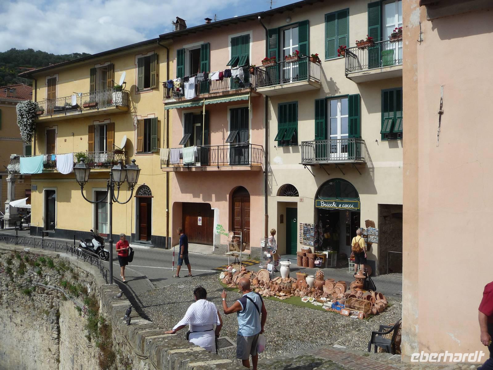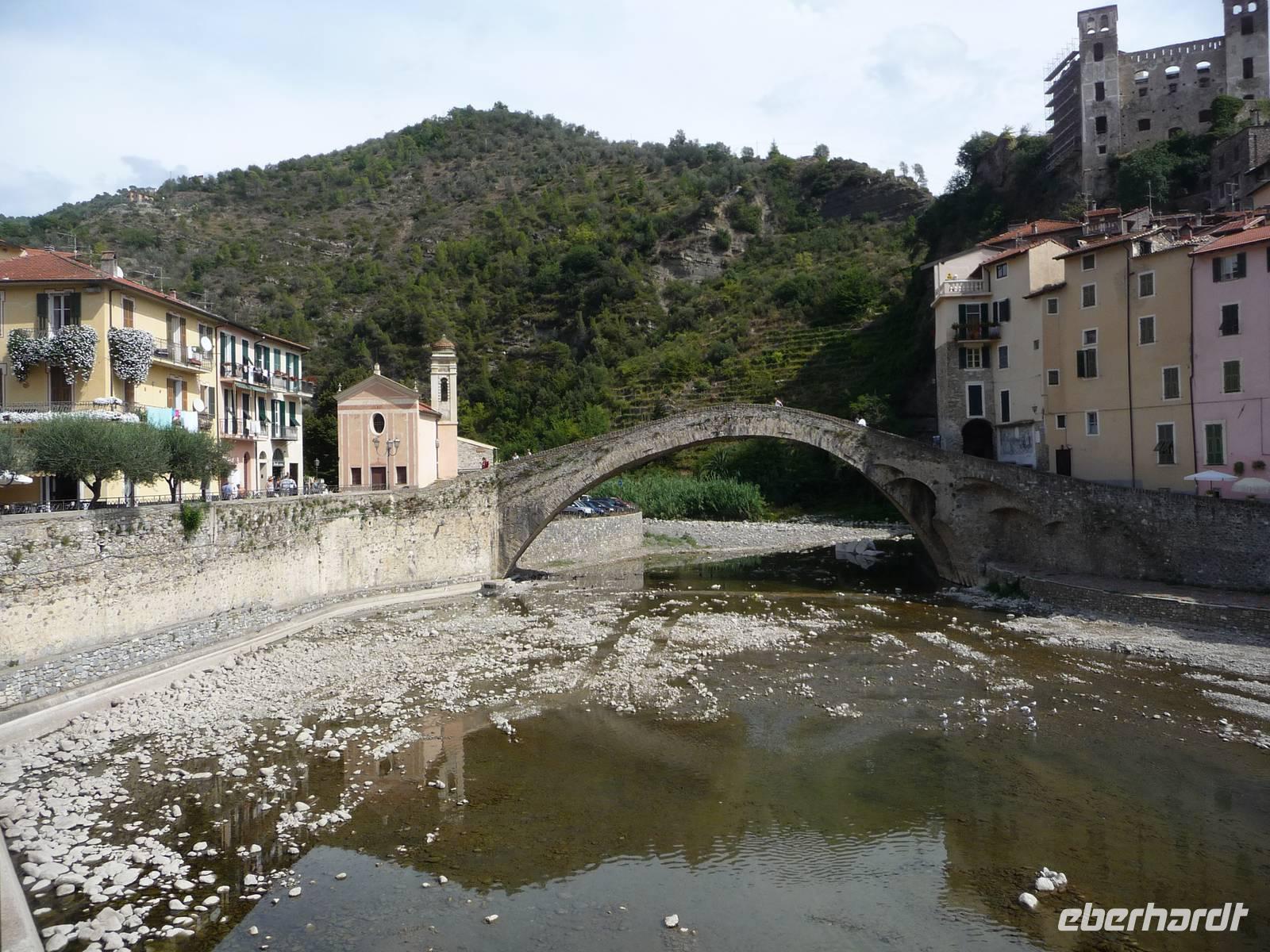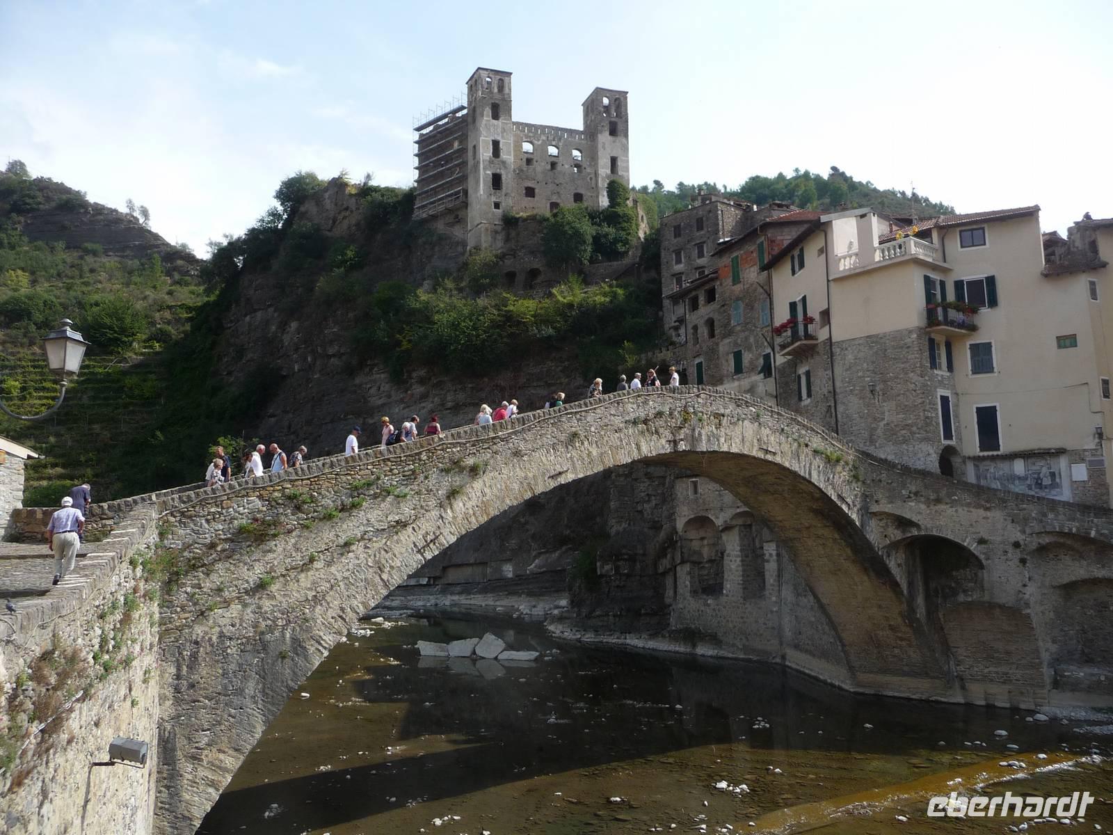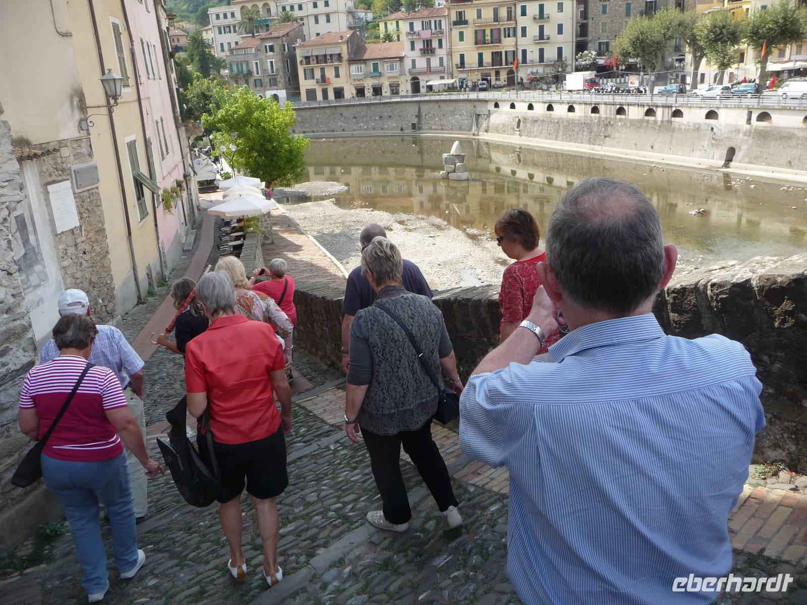 Weiter geht unsere Busfahrt ins Hinterland der "Riviera di Ponente" nach Dolceacqua. Das Dorf wird überragt vom "Castello dei Doria", das man erreicht, wenn man vom "Unterdorf" aus über die berühmte Brücke "Ponte Vecchio di Dolceacqua" auf steil nach oben gehenden Sträßchen wandert. Diese Brücke hat Weltruhm dadurch erlangt, dass der impressionistische, französische Maler Claude Monet ein Gemälde von der Brücke gemalt hat, dem er den Namen "Juwel der Leichtigkeit" gab. An pittoresken Häuschen mit Boutiquen und Galerien von aktuellen Malern vorbei gelangen wir mit einiger Anstrengeung bis an den Fuß des Schlosses, um nach kurzer Verweildauer wieder den nun nicht mehr ganz so anstrengenden Weg nach unten anzutreten.