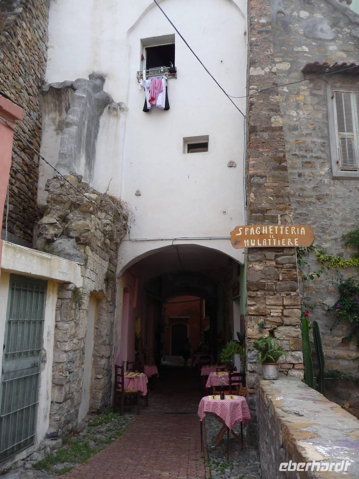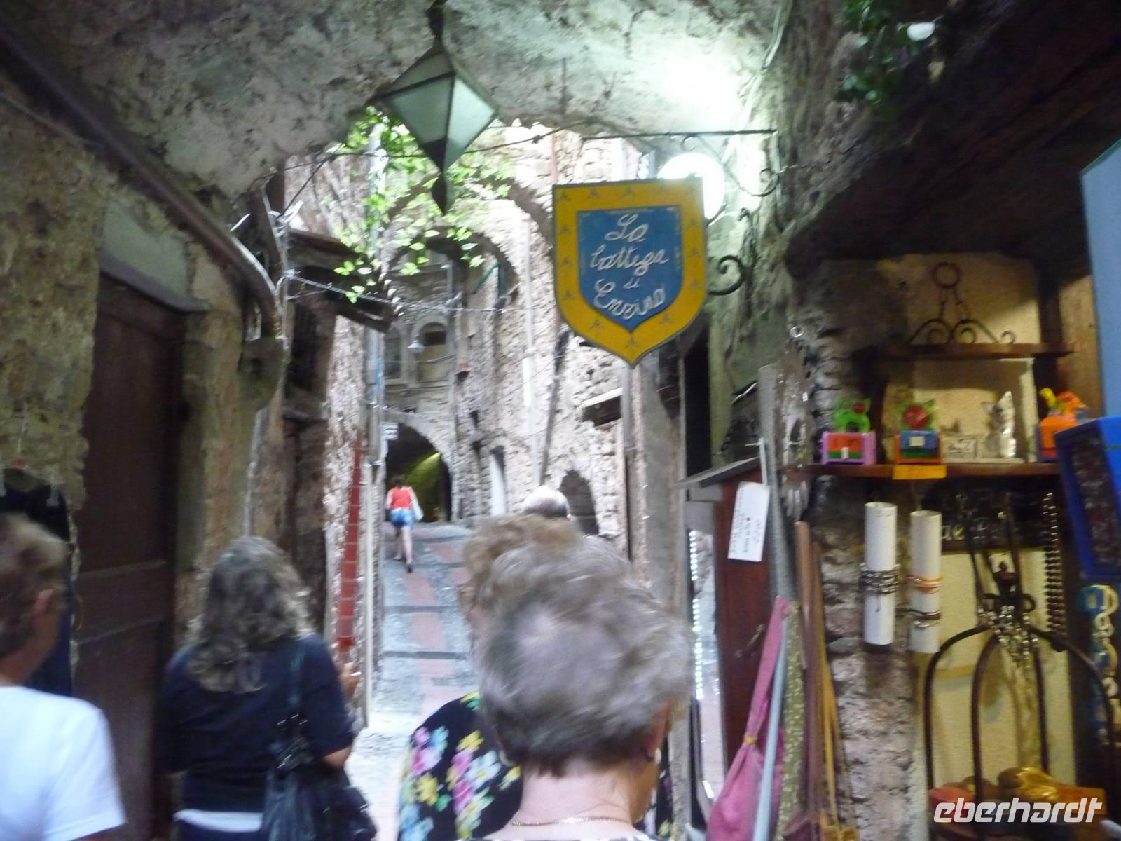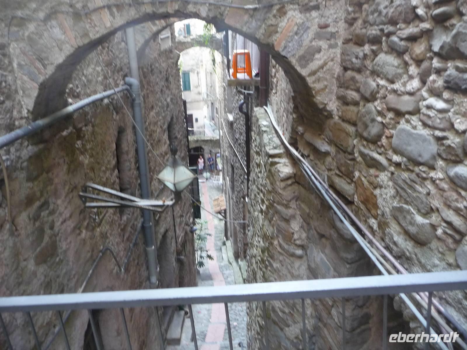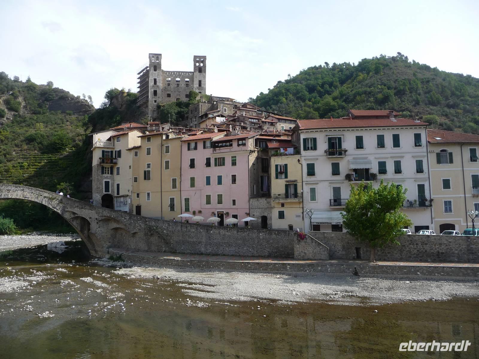 Weiter geht unsere Busfahrt ins Hinterland der "Riviera di Ponente" nach Dolceacqua. Das Dorf wird überragt vom "Castello dei Doria", das man erreicht, wenn man vom "Unterdorf" aus über die berühmte Brücke "Ponte Vecchio di Dolceacqua" auf steil nach oben gehenden Sträßchen wandert. Diese Brücke hat Weltruhm dadurch erlangt, dass der impressionistische, französische Maler Claude Monet ein Gemälde von der Brücke gemalt hat, dem er den Namen "Juwel der Leichtigkeit" gab. An pittoresken Häuschen mit Boutiquen und Galerien von aktuellen Malern vorbei gelangen wir mit einiger Anstrengeung bis an den Fuß des Schlosses, um nach kurzer Verweildauer wieder den nun nicht mehr ganz so anstrengenden Weg nach unten anzutreten.