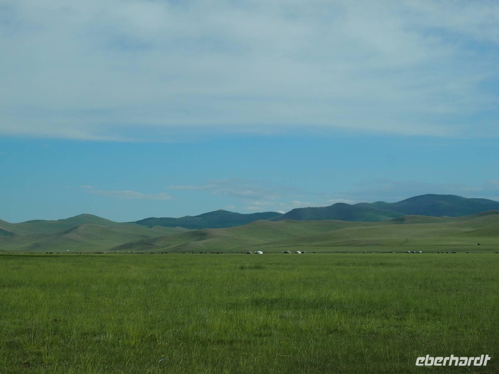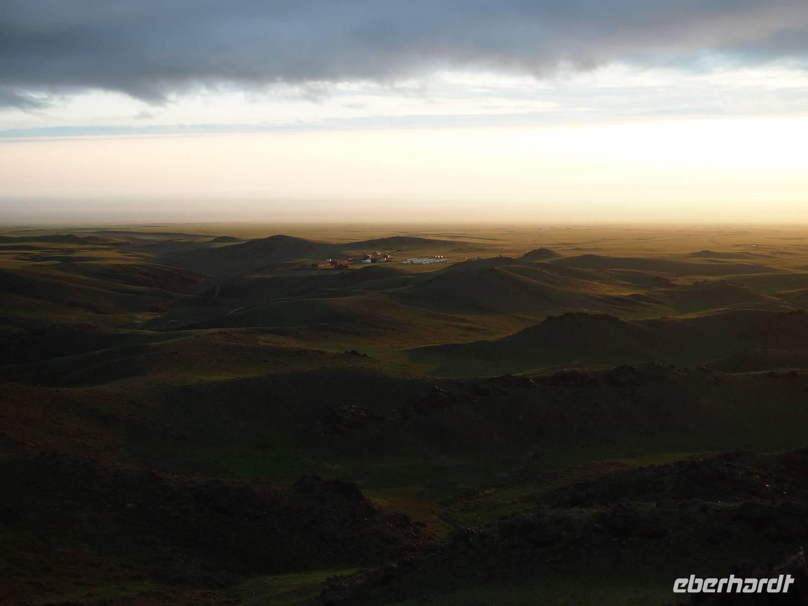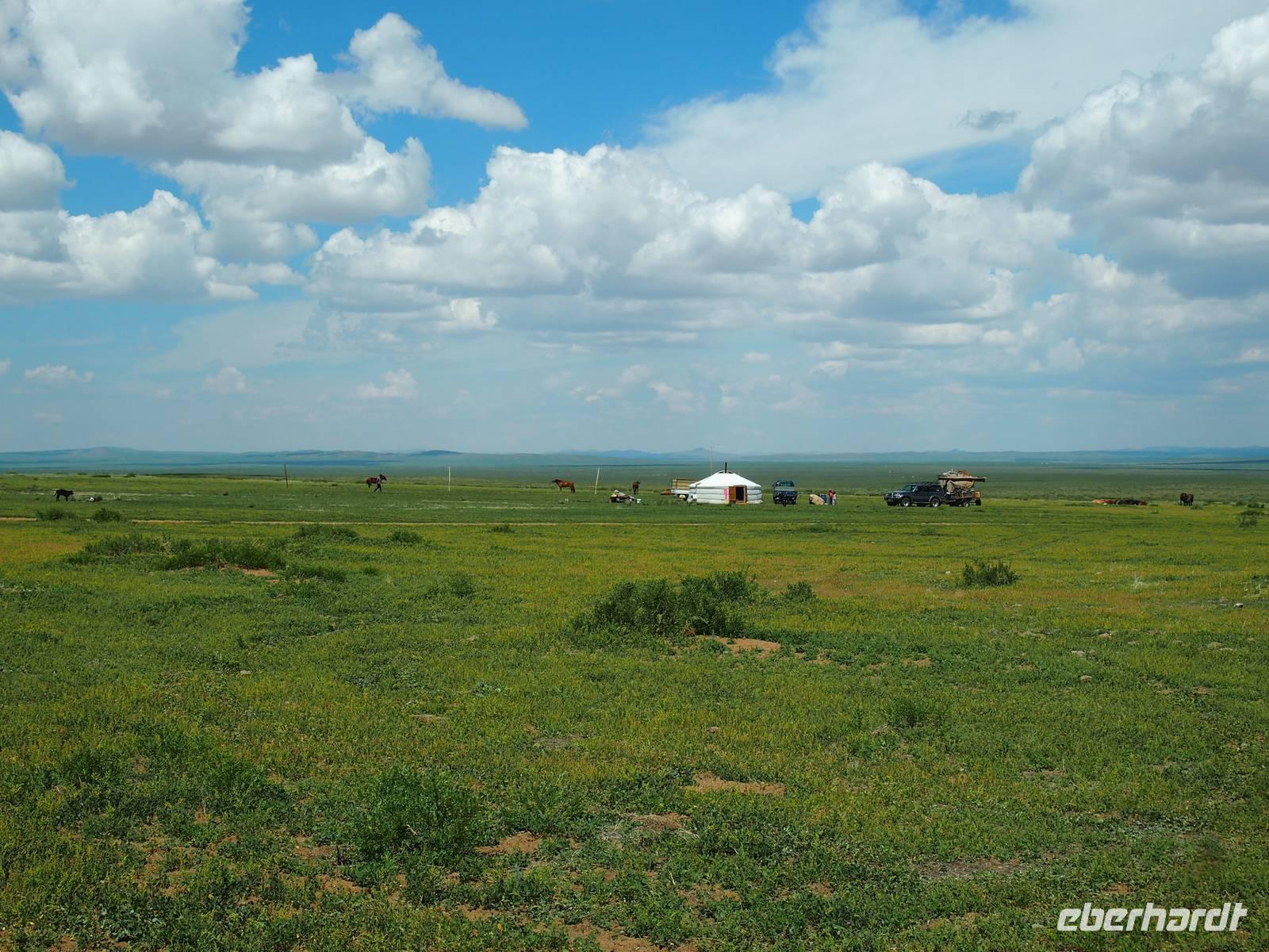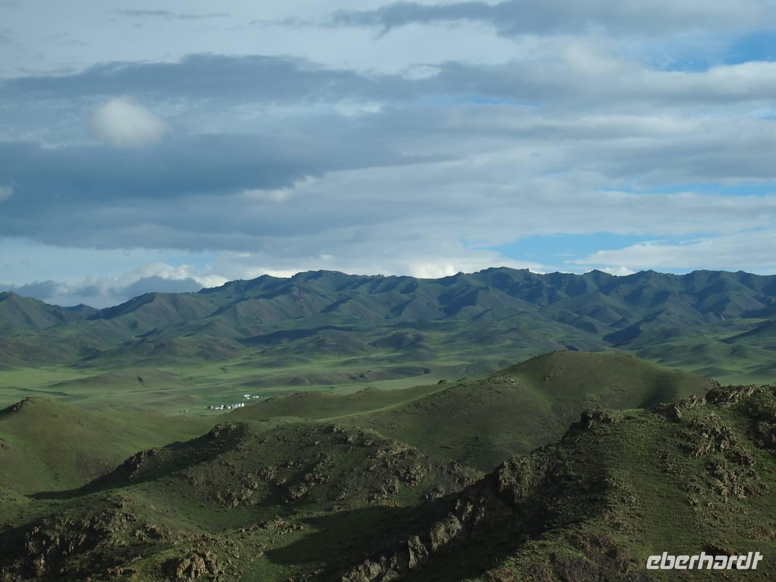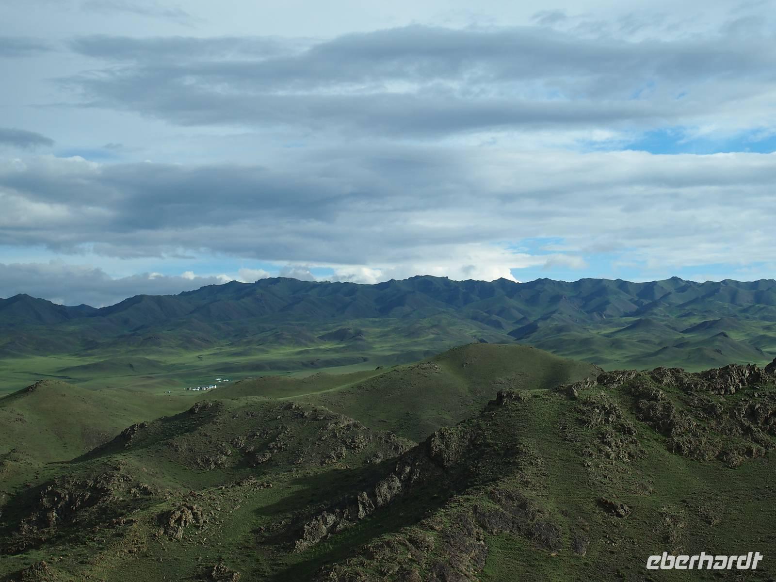 Besonders faszinierend war auch heute wieder zu beobachten, wie sich die Landschaft von Stunde zu Stunde veränderte. Kurz vor unserem heutigen Tagesziel haben wir noch einen kurzen Halt in Danslagad gemacht, um noch ein paar Kleinigkeiten einzukaufen. Dabei schauten wir links und rechts in die Läden. So besuchten wir u.a. auch eine Fleischerei, die in ihrer Art und Weise in Deutschland nicht vorstellbar wäre. Nach ein paar kleinen Einkäufen fuhren wir weiter zu unserem Camp. Obwohl das Wetter uns nicht ganz wohlgesonnen war, hat es viele von uns nicht abgeschreckt, die Gegend zu erkunden. So wurden schnell die Regenjacken rausgeholt und wir bestiegen die Hügel in der Umgebung. Die Aussicht war herrlich und die Wolken ließen nur erahnen, was sich in der Ferne noch alles verbirgt. Doch Petrus stimmte sich schnell milde und ließ die Sonne wieder scheinen. Nach dem Abendbrot ging es nach einer warmen Dusche für alle zeitig ins Bett, wobei der Regen noch lange leise auf die Dächer der Jurten tropfte.