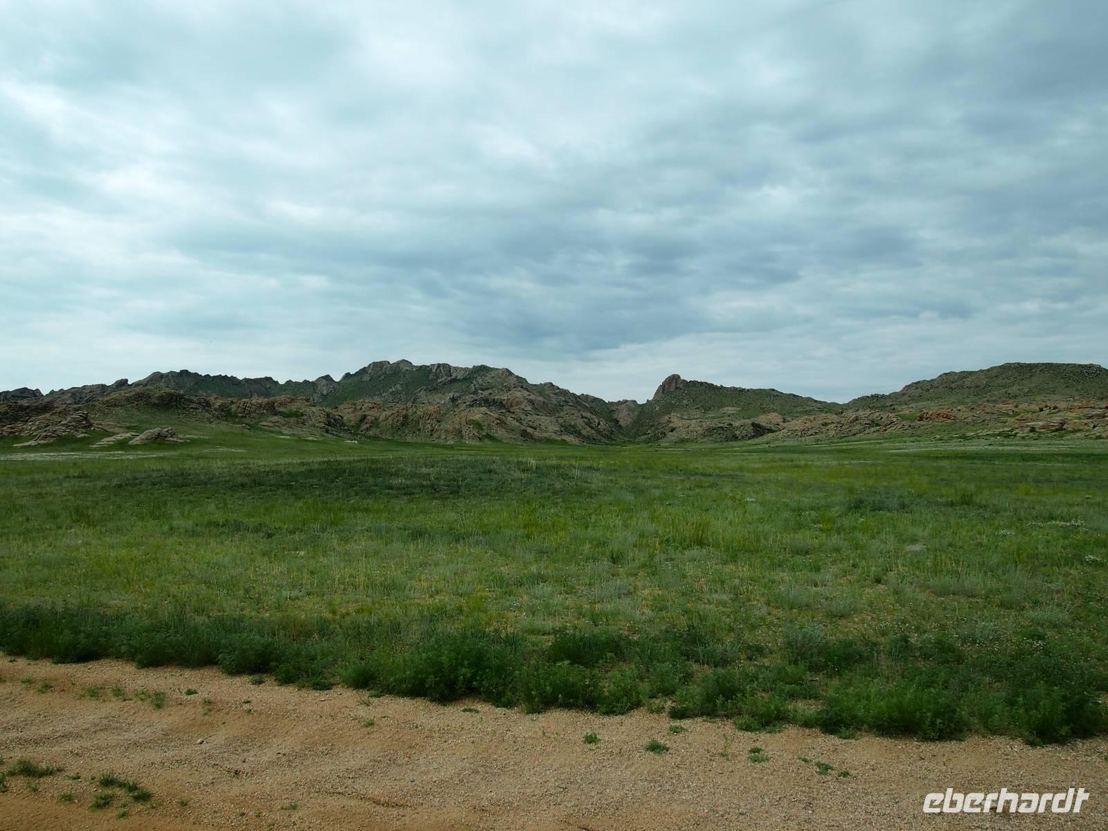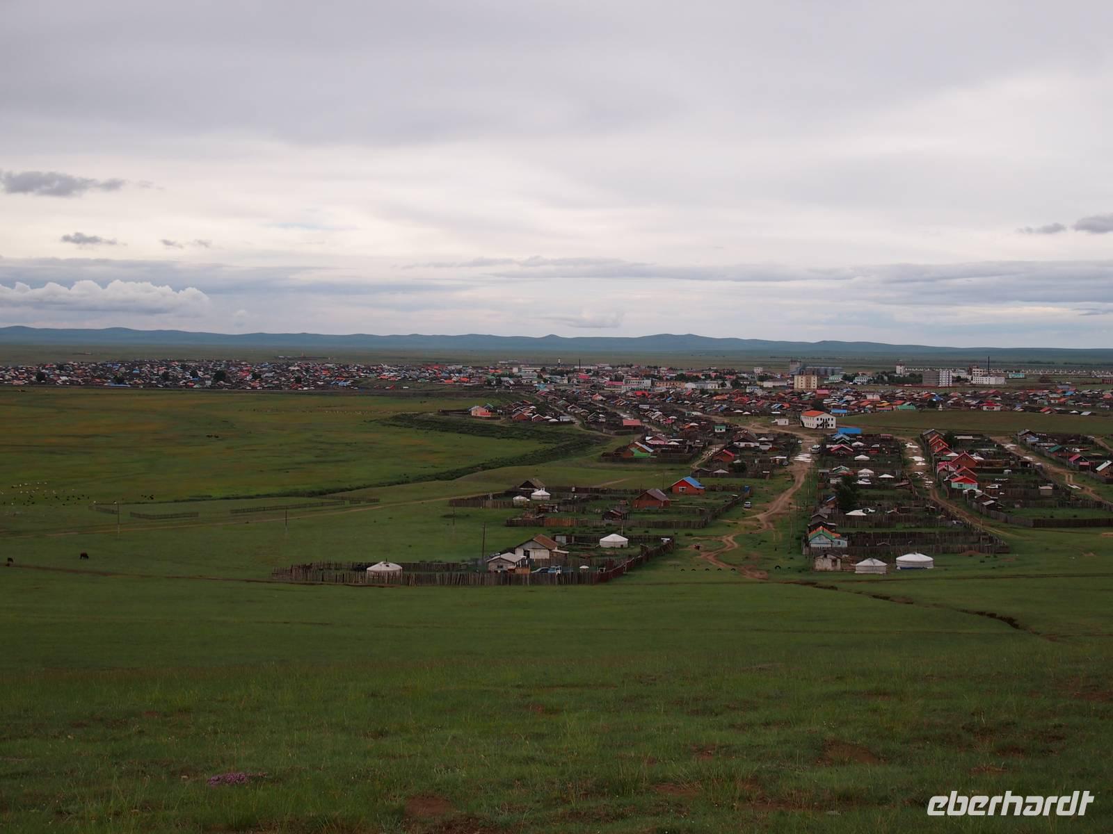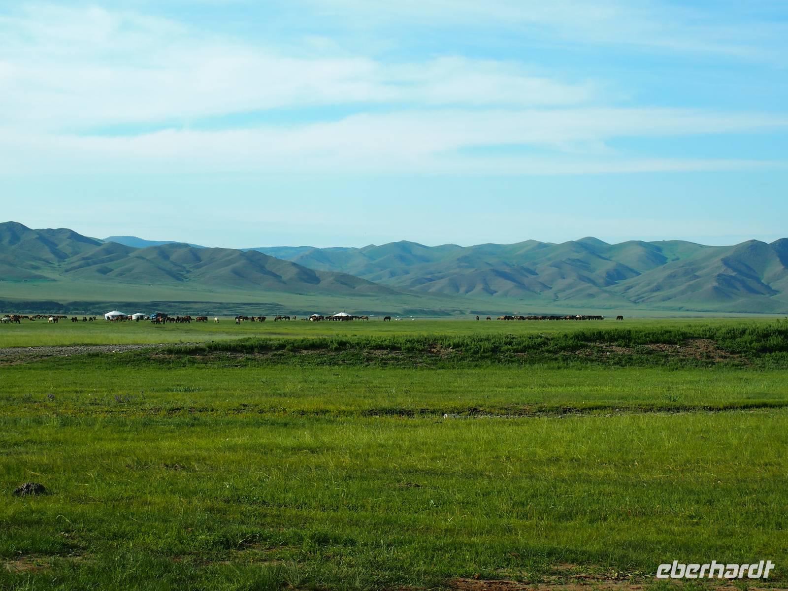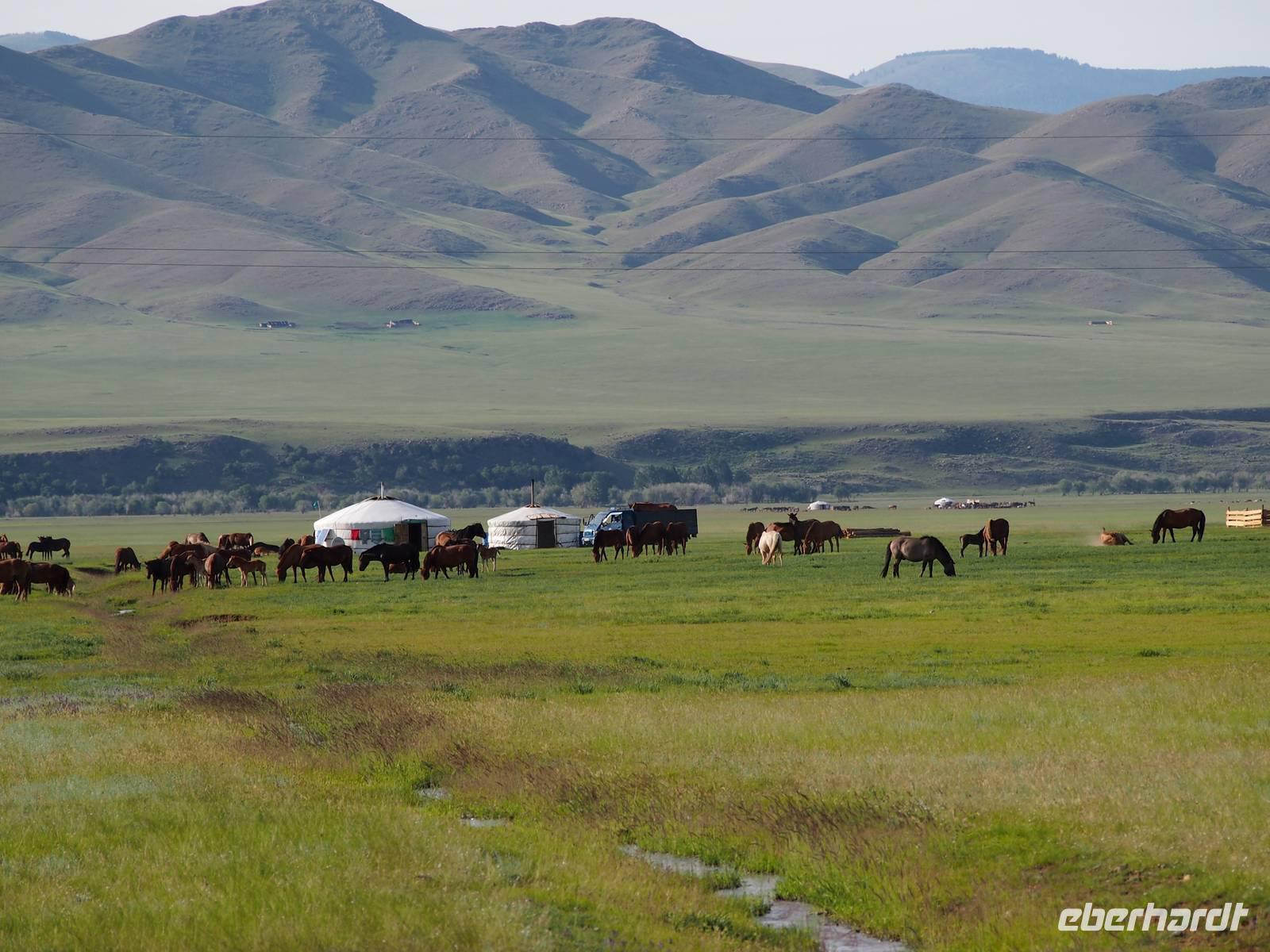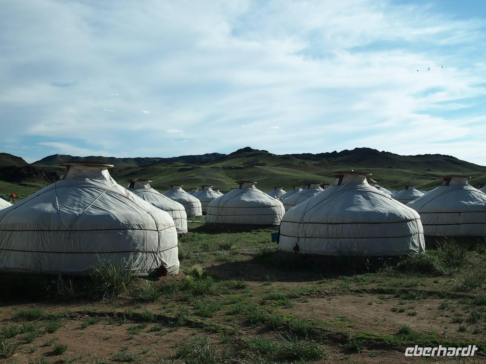 Besonders faszinierend war auch heute wieder zu beobachten, wie sich die Landschaft von Stunde zu Stunde veränderte. Kurz vor unserem heutigen Tagesziel haben wir noch einen kurzen Halt in Danslagad gemacht, um noch ein paar Kleinigkeiten einzukaufen. Dabei schauten wir links und rechts in die Läden. So besuchten wir u.a. auch eine Fleischerei, die in ihrer Art und Weise in Deutschland nicht vorstellbar wäre. Nach ein paar kleinen Einkäufen fuhren wir weiter zu unserem Camp. Obwohl das Wetter uns nicht ganz wohlgesonnen war, hat es viele von uns nicht abgeschreckt, die Gegend zu erkunden. So wurden schnell die Regenjacken rausgeholt und wir bestiegen die Hügel in der Umgebung. Die Aussicht war herrlich und die Wolken ließen nur erahnen, was sich in der Ferne noch alles verbirgt. Doch Petrus stimmte sich schnell milde und ließ die Sonne wieder scheinen. Nach dem Abendbrot ging es nach einer warmen Dusche für alle zeitig ins Bett, wobei der Regen noch lange leise auf die Dächer der Jurten tropfte.