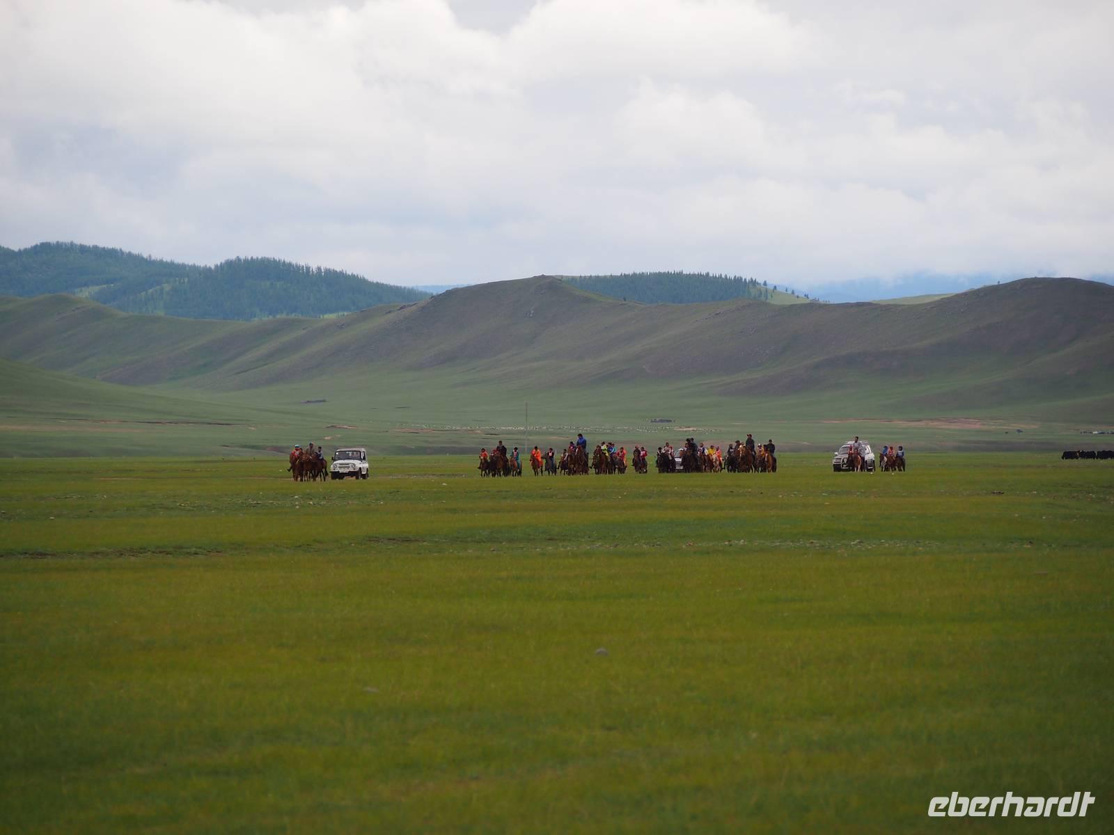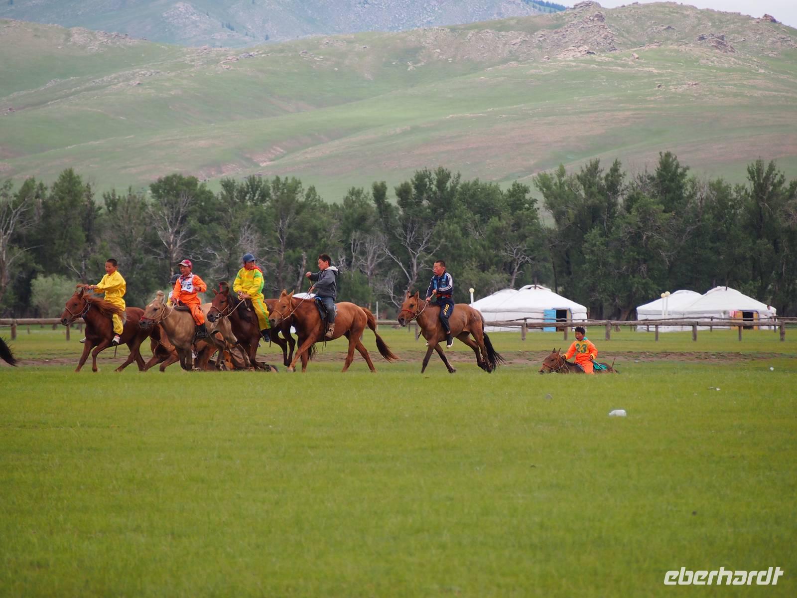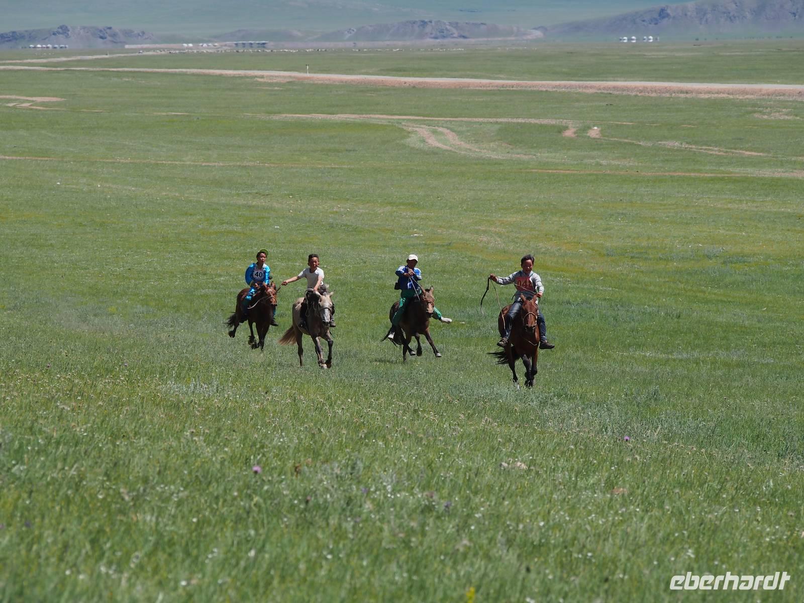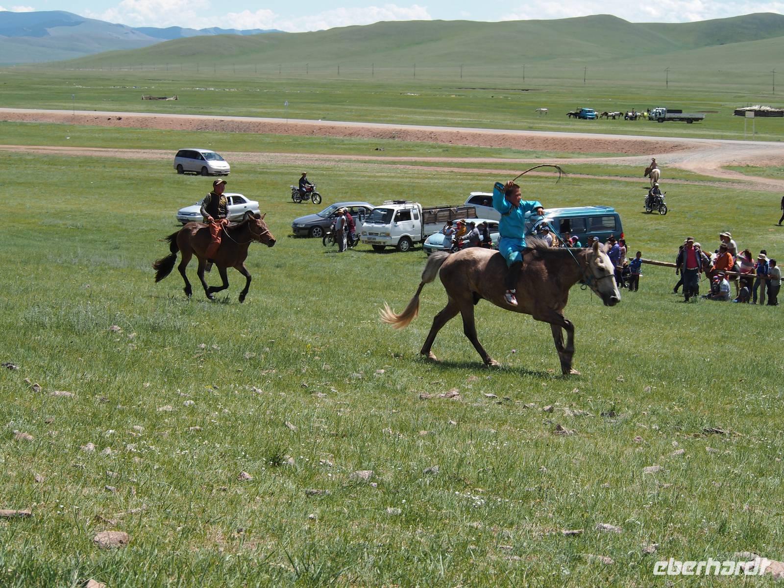 Die Nacht war für viele sehr kalt und deshalb begannen einige den Tag mit einem Bad in den heißen Quellen. Nach dem Frühstück ging es zu unserem heutigen Ziel, dem Nationalpark Chrogo direkt an den Terchin-Zagaan-See. Auf dem Weg dahin warteten gleich zwei Highlights auf uns. Eines davon haben wir durch Zufall entdeckt. Wir konnten unser Glück kaum fassen, eine kleine Gemeinde feierte vorab schon ihr eigenes kleines Naadamfest. Als wir aus dem Auto stiegen, war das bunte Treiben schon in vollem Gange. Um uns waren unzählig viele Kinder, die auf Pferden saßen und sich auf das Rennen vorbereiteten. Da die Reiter in Gruppen aufgeteilt sind, hatten wir sogar das Glück eine Gruppe zu sehen, die gerade durch das Ziel ritt. Die Zuschauer platzierten sich auf dem Berg und jubelten und grölten, als die jungen Reiter durch das Ziel kamen. Am Rande des Festes gab es kleine Stände, an denen man Speisen und Getränke kaufen konnte. Außerdem konnte man mit Dartpfeilen auf Luftballons schießen, später kam es auch noch zum Ringkampf. Die Zeit ließ es leider nicht zu, dem Spektakel länger zuzusehen, aber die Ankunft der Reiter und das ganze Treiben Drumherum war schon spannend genug. Faszinierend waren auch die vielen Adler, die über dem Gelände flogen.