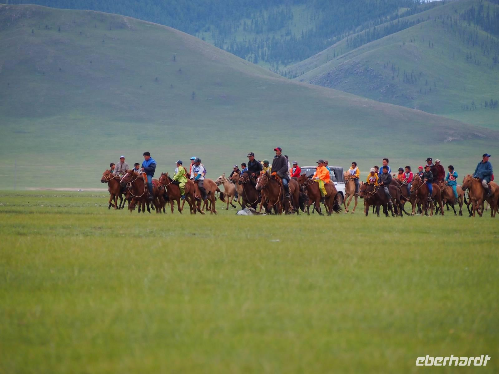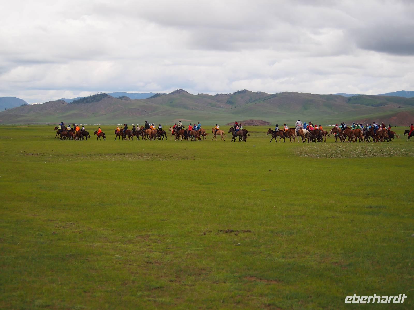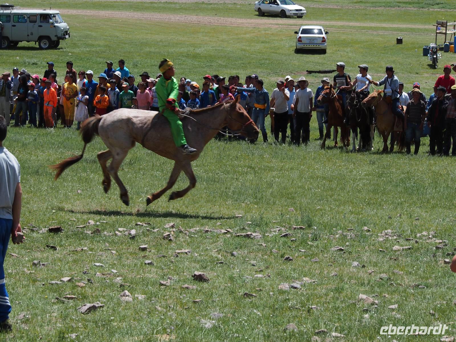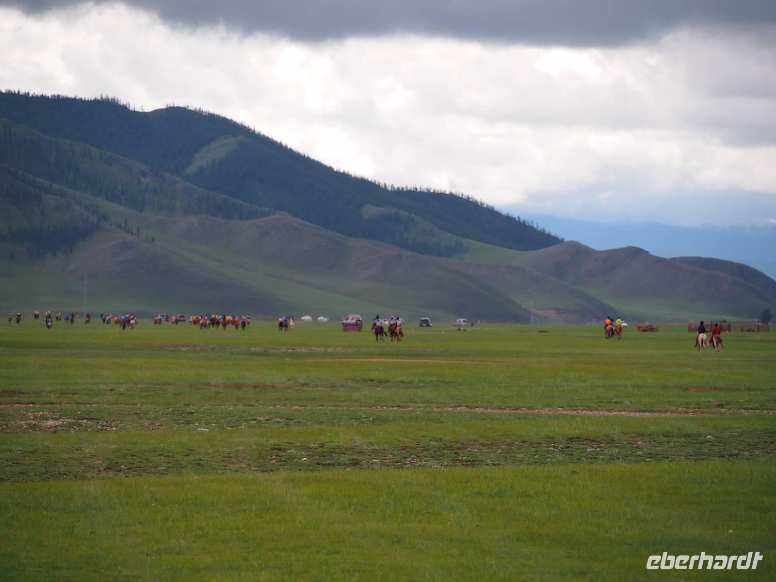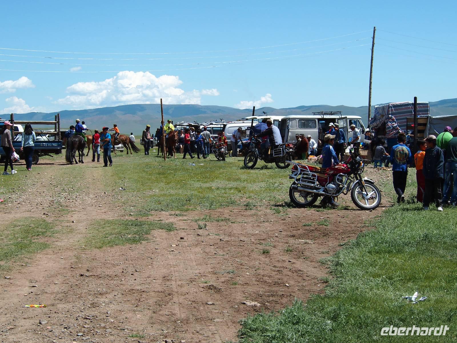 Die Nacht war für viele sehr kalt und deshalb begannen einige den Tag mit einem Bad in den heißen Quellen. Nach dem Frühstück ging es zu unserem heutigen Ziel, dem Nationalpark Chrogo direkt an den Terchin-Zagaan-See. Auf dem Weg dahin warteten gleich zwei Highlights auf uns. Eines davon haben wir durch Zufall entdeckt. Wir konnten unser Glück kaum fassen, eine kleine Gemeinde feierte vorab schon ihr eigenes kleines Naadamfest. Als wir aus dem Auto stiegen, war das bunte Treiben schon in vollem Gange. Um uns waren unzählig viele Kinder, die auf Pferden saßen und sich auf das Rennen vorbereiteten. Da die Reiter in Gruppen aufgeteilt sind, hatten wir sogar das Glück eine Gruppe zu sehen, die gerade durch das Ziel ritt. Die Zuschauer platzierten sich auf dem Berg und jubelten und grölten, als die jungen Reiter durch das Ziel kamen. Am Rande des Festes gab es kleine Stände, an denen man Speisen und Getränke kaufen konnte. Außerdem konnte man mit Dartpfeilen auf Luftballons schießen, später kam es auch noch zum Ringkampf. Die Zeit ließ es leider nicht zu, dem Spektakel länger zuzusehen, aber die Ankunft der Reiter und das ganze Treiben Drumherum war schon spannend genug. Faszinierend waren auch die vielen Adler, die über dem Gelände flogen.