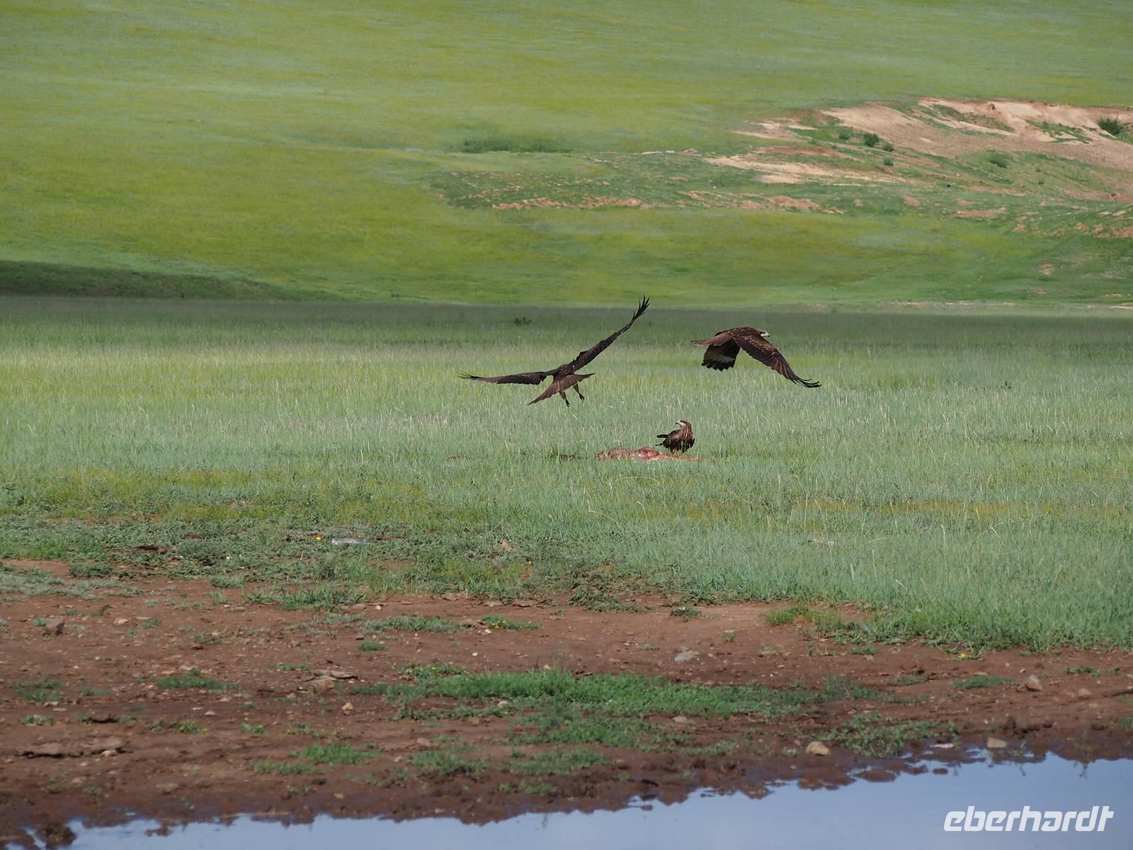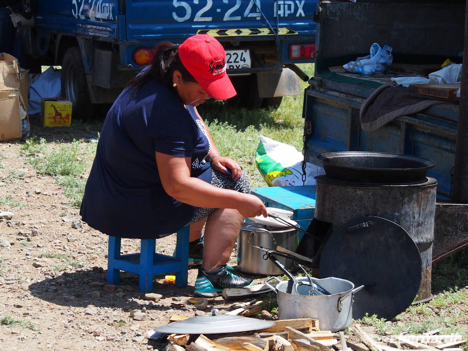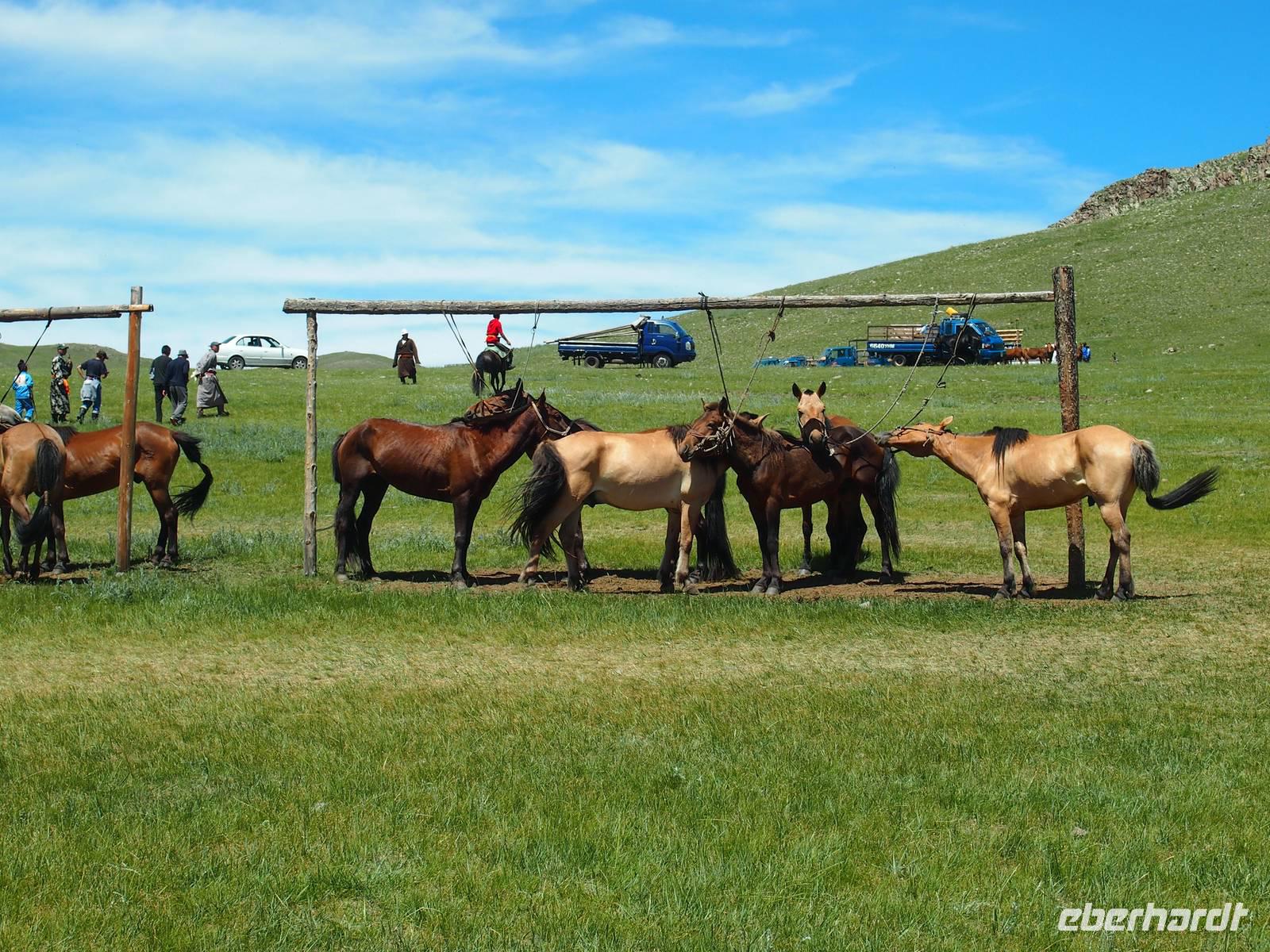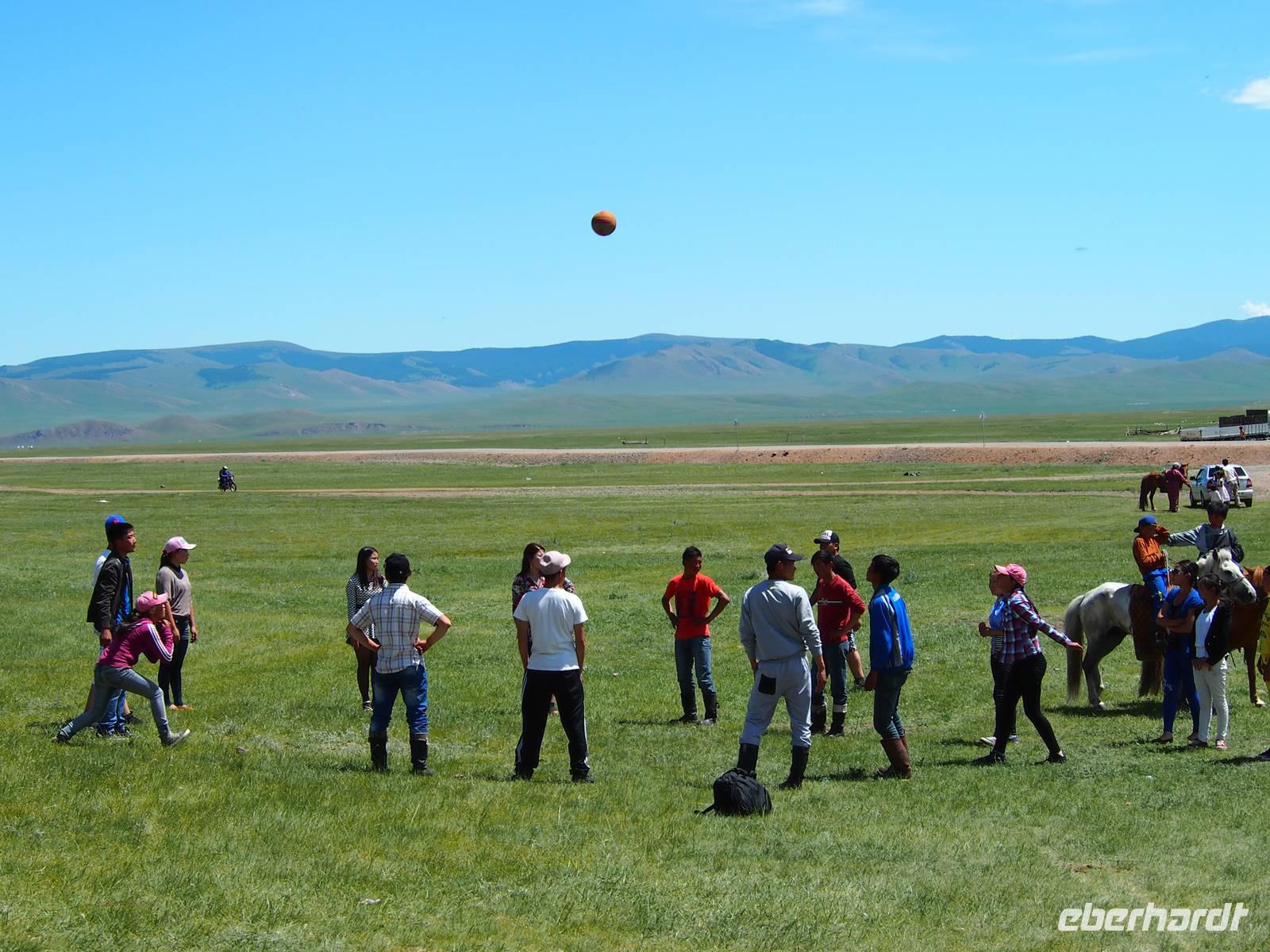 Die Nacht war für viele sehr kalt und deshalb begannen einige den Tag mit einem Bad in den heißen Quellen. Nach dem Frühstück ging es zu unserem heutigen Ziel, dem Nationalpark Chrogo direkt an den Terchin-Zagaan-See. Auf dem Weg dahin warteten gleich zwei Highlights auf uns. Eines davon haben wir durch Zufall entdeckt. Wir konnten unser Glück kaum fassen, eine kleine Gemeinde feierte vorab schon ihr eigenes kleines Naadamfest. Als wir aus dem Auto stiegen, war das bunte Treiben schon in vollem Gange. Um uns waren unzählig viele Kinder, die auf Pferden saßen und sich auf das Rennen vorbereiteten. Da die Reiter in Gruppen aufgeteilt sind, hatten wir sogar das Glück eine Gruppe zu sehen, die gerade durch das Ziel ritt. Die Zuschauer platzierten sich auf dem Berg und jubelten und grölten, als die jungen Reiter durch das Ziel kamen. Am Rande des Festes gab es kleine Stände, an denen man Speisen und Getränke kaufen konnte. Außerdem konnte man mit Dartpfeilen auf Luftballons schießen, später kam es auch noch zum Ringkampf. Die Zeit ließ es leider nicht zu, dem Spektakel länger zuzusehen, aber die Ankunft der Reiter und das ganze Treiben Drumherum war schon spannend genug. Faszinierend waren auch die vielen Adler, die über dem Gelände flogen.