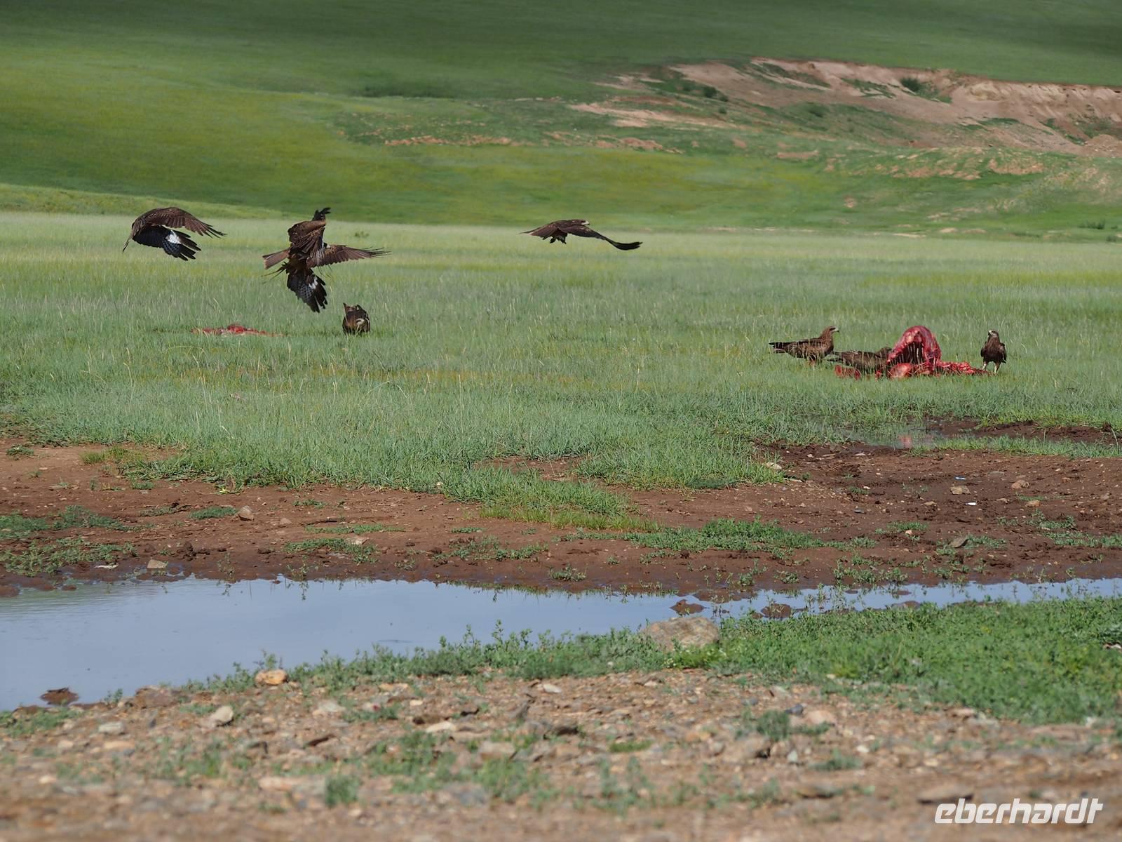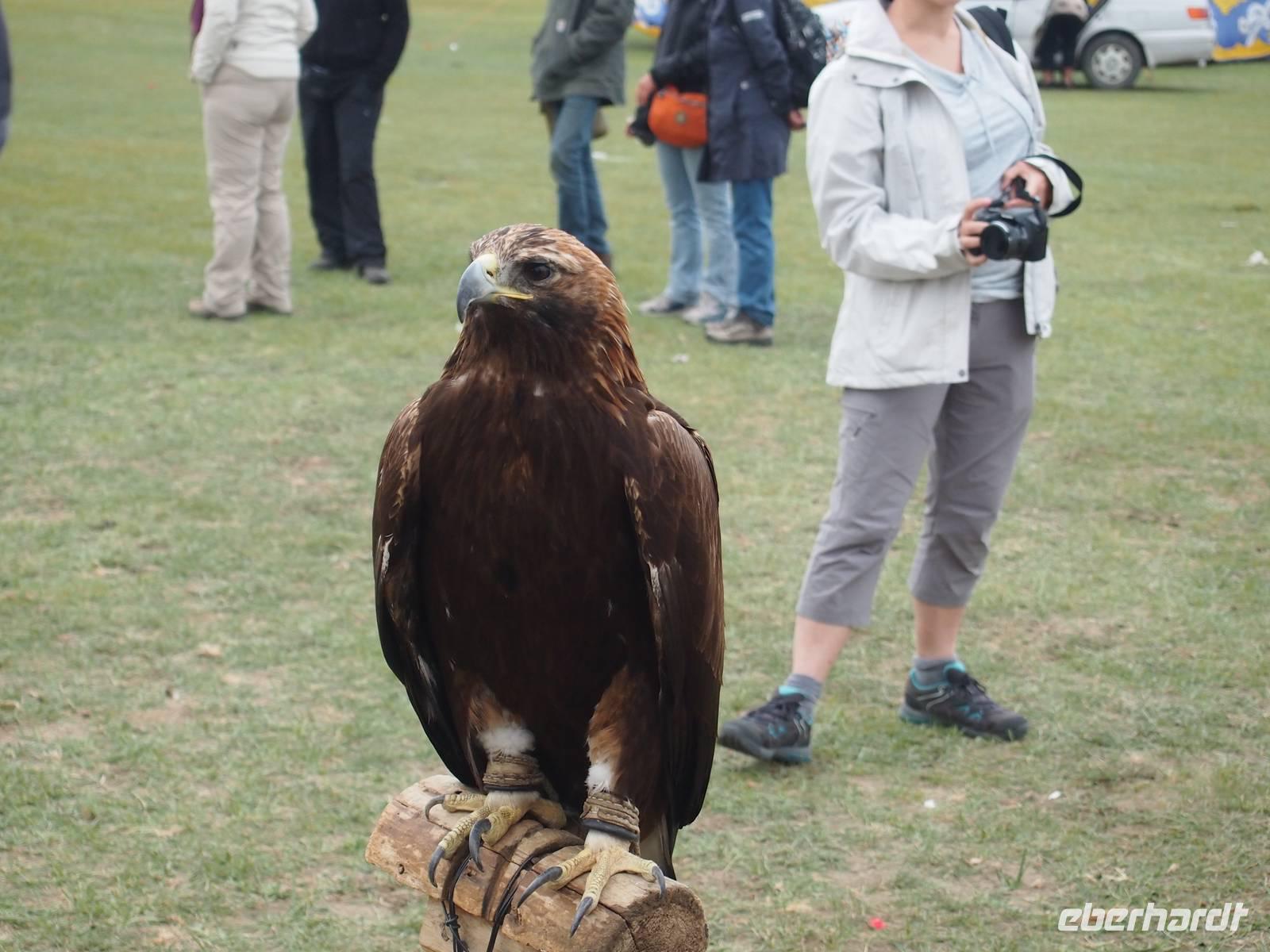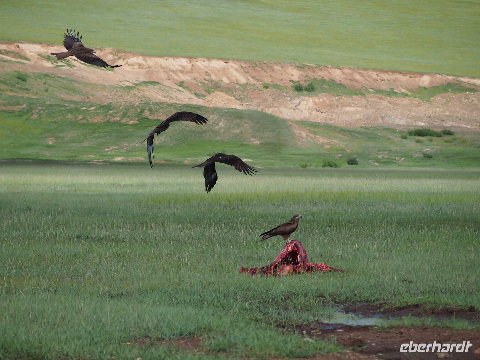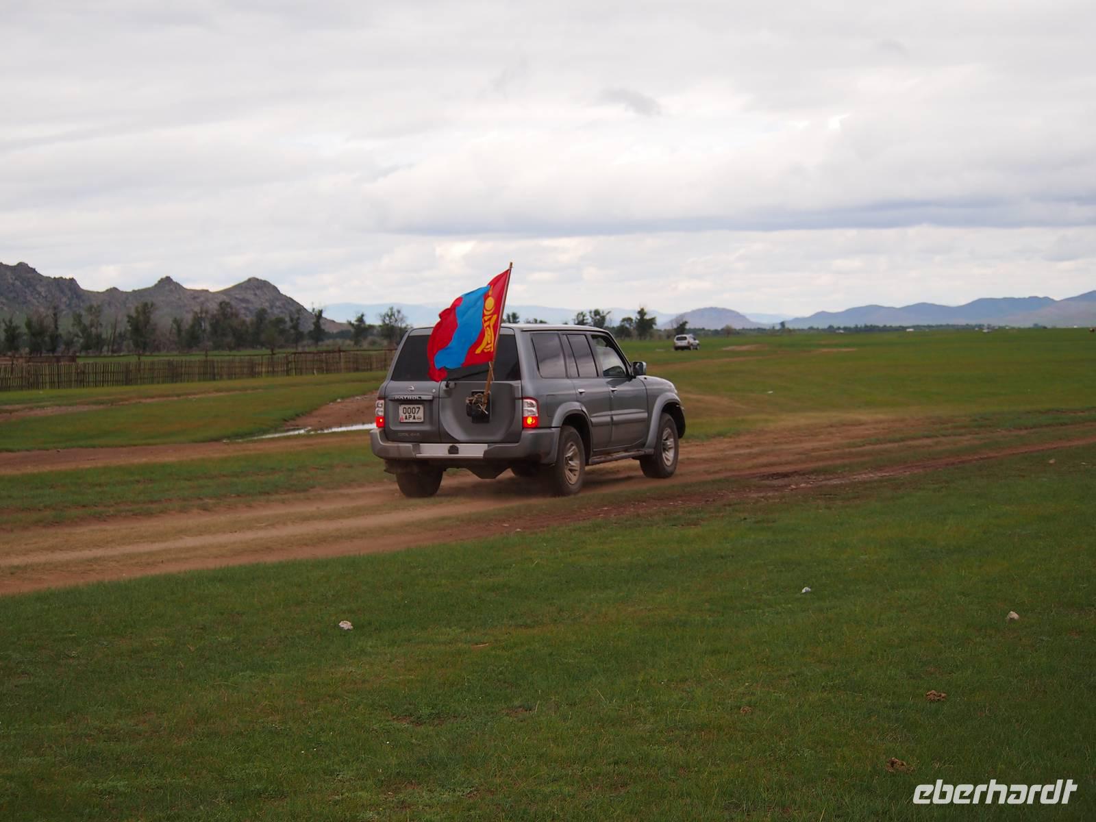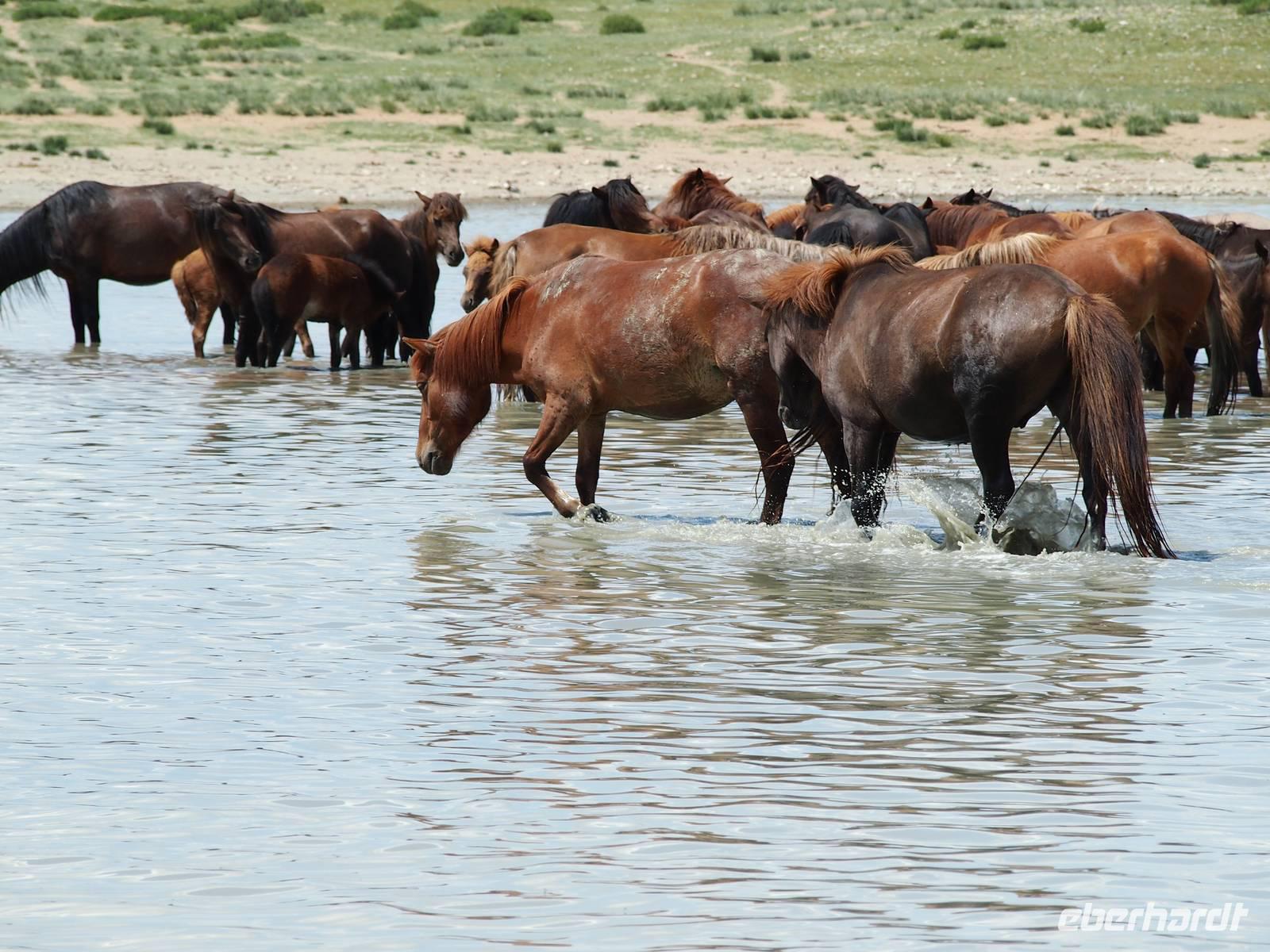 Die Nacht war für viele sehr kalt und deshalb begannen einige den Tag mit einem Bad in den heißen Quellen. Nach dem Frühstück ging es zu unserem heutigen Ziel, dem Nationalpark Chrogo direkt an den Terchin-Zagaan-See. Auf dem Weg dahin warteten gleich zwei Highlights auf uns. Eines davon haben wir durch Zufall entdeckt. Wir konnten unser Glück kaum fassen, eine kleine Gemeinde feierte vorab schon ihr eigenes kleines Naadamfest. Als wir aus dem Auto stiegen, war das bunte Treiben schon in vollem Gange. Um uns waren unzählig viele Kinder, die auf Pferden saßen und sich auf das Rennen vorbereiteten. Da die Reiter in Gruppen aufgeteilt sind, hatten wir sogar das Glück eine Gruppe zu sehen, die gerade durch das Ziel ritt. Die Zuschauer platzierten sich auf dem Berg und jubelten und grölten, als die jungen Reiter durch das Ziel kamen. Am Rande des Festes gab es kleine Stände, an denen man Speisen und Getränke kaufen konnte. Außerdem konnte man mit Dartpfeilen auf Luftballons schießen, später kam es auch noch zum Ringkampf. Die Zeit ließ es leider nicht zu, dem Spektakel länger zuzusehen, aber die Ankunft der Reiter und das ganze Treiben Drumherum war schon spannend genug. Faszinierend waren auch die vielen Adler, die über dem Gelände flogen.
