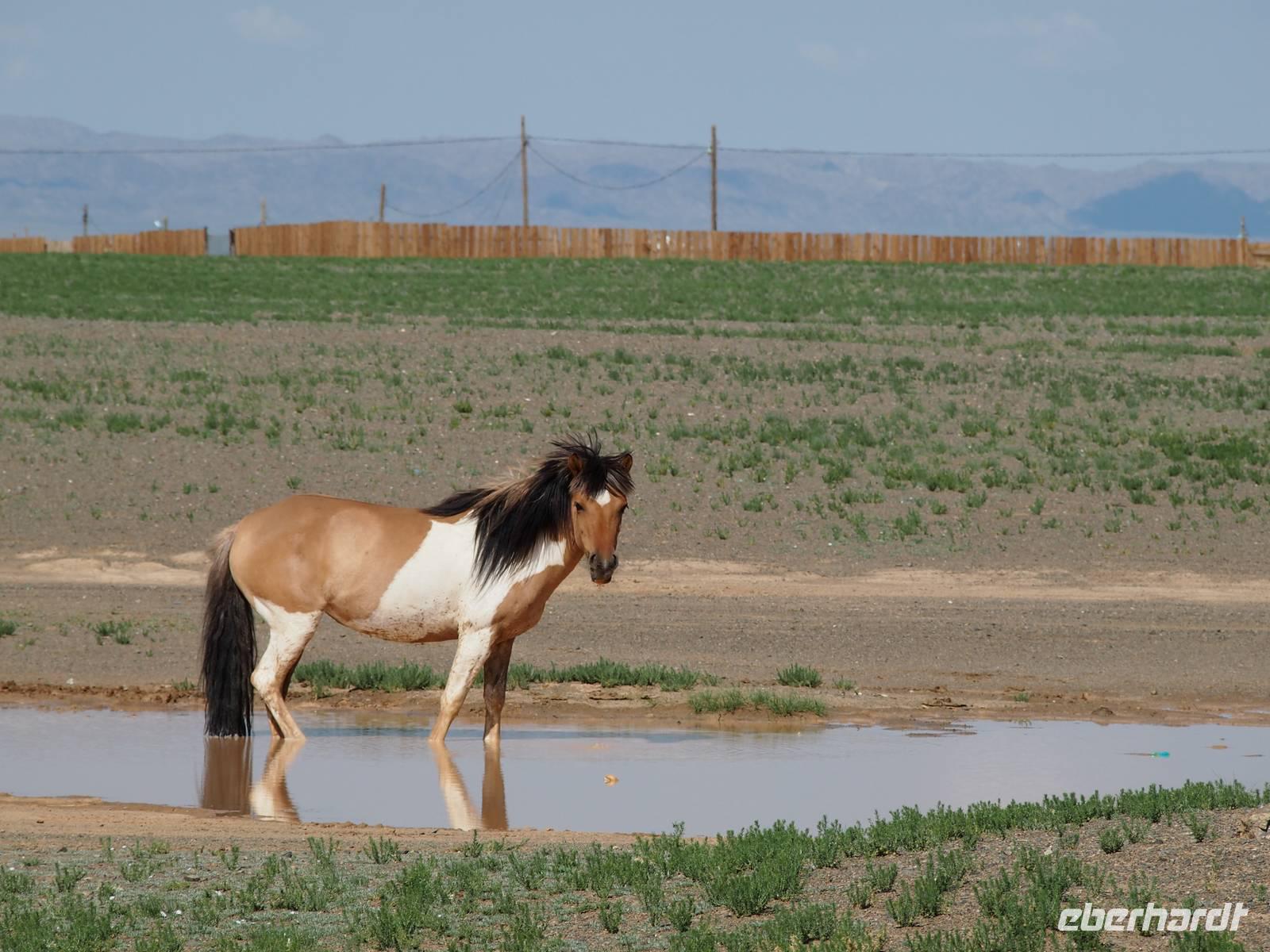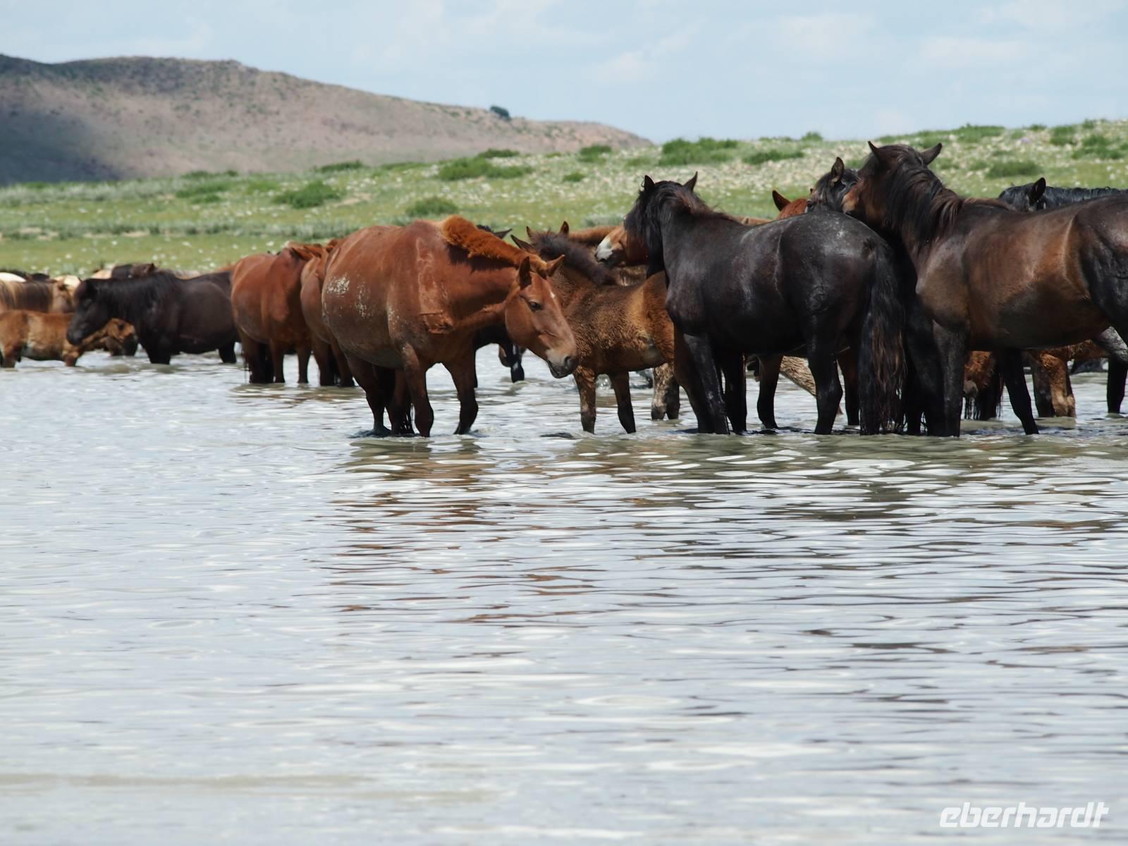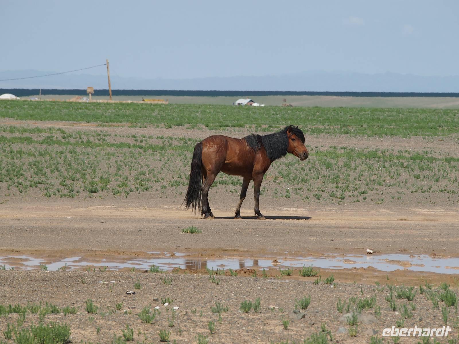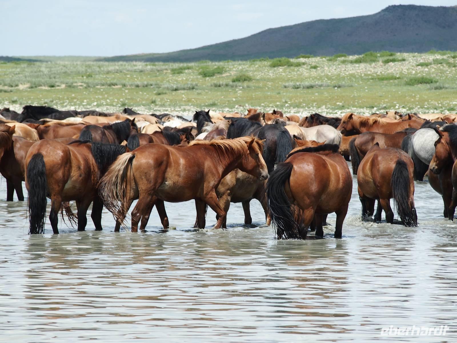 Die Nacht war für viele sehr kalt und deshalb begannen einige den Tag mit einem Bad in den heißen Quellen. Nach dem Frühstück ging es zu unserem heutigen Ziel, dem Nationalpark Chrogo direkt an den Terchin-Zagaan-See. Auf dem Weg dahin warteten gleich zwei Highlights auf uns. Eines davon haben wir durch Zufall entdeckt. Wir konnten unser Glück kaum fassen, eine kleine Gemeinde feierte vorab schon ihr eigenes kleines Naadamfest. Als wir aus dem Auto stiegen, war das bunte Treiben schon in vollem Gange. Um uns waren unzählig viele Kinder, die auf Pferden saßen und sich auf das Rennen vorbereiteten. Da die Reiter in Gruppen aufgeteilt sind, hatten wir sogar das Glück eine Gruppe zu sehen, die gerade durch das Ziel ritt. Die Zuschauer platzierten sich auf dem Berg und jubelten und grölten, als die jungen Reiter durch das Ziel kamen. Am Rande des Festes gab es kleine Stände, an denen man Speisen und Getränke kaufen konnte. Außerdem konnte man mit Dartpfeilen auf Luftballons schießen, später kam es auch noch zum Ringkampf. Die Zeit ließ es leider nicht zu, dem Spektakel länger zuzusehen, aber die Ankunft der Reiter und das ganze Treiben Drumherum war schon spannend genug. Faszinierend waren auch die vielen Adler, die über dem Gelände flogen.