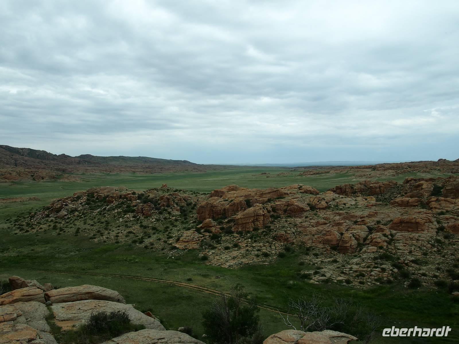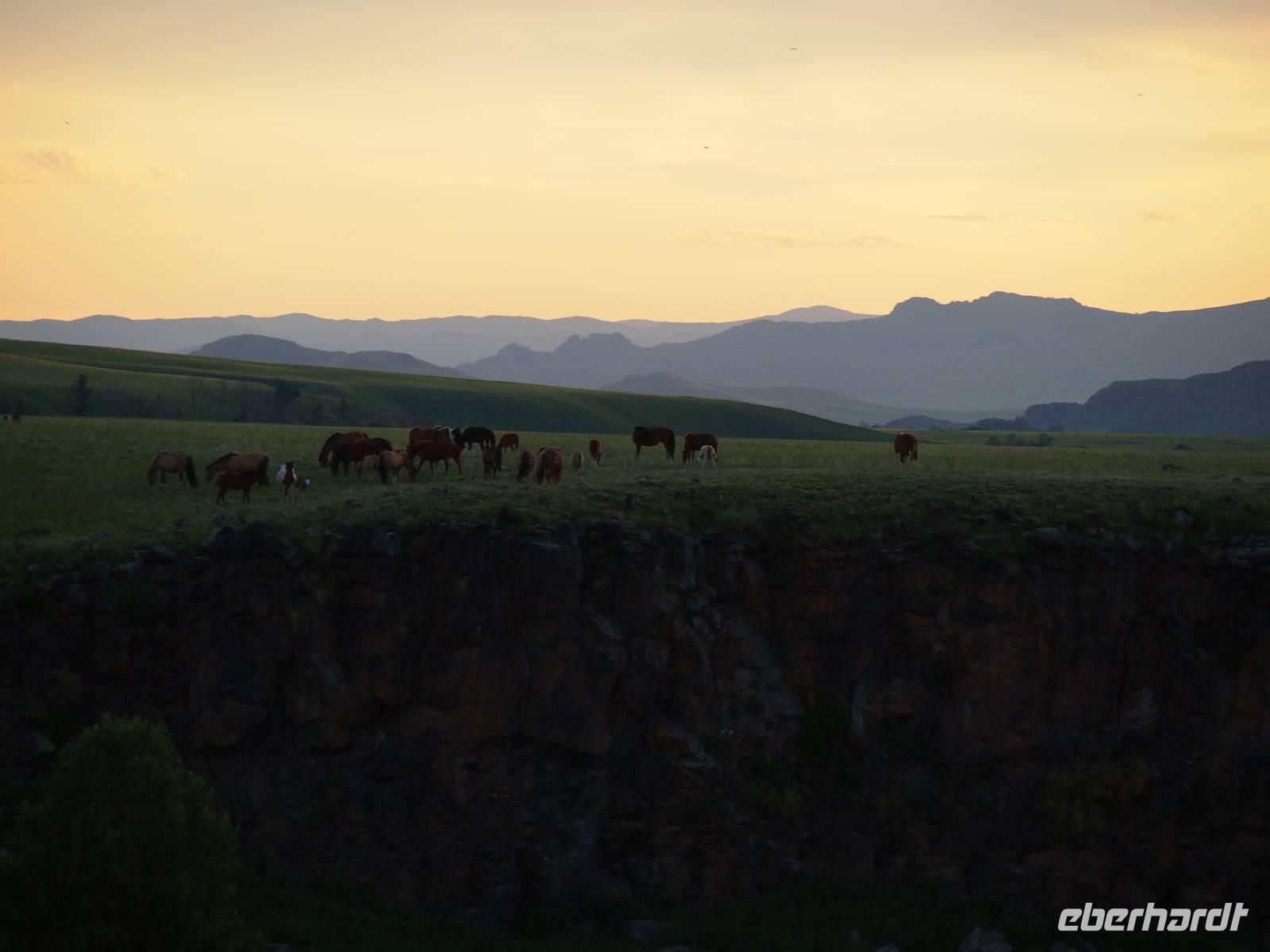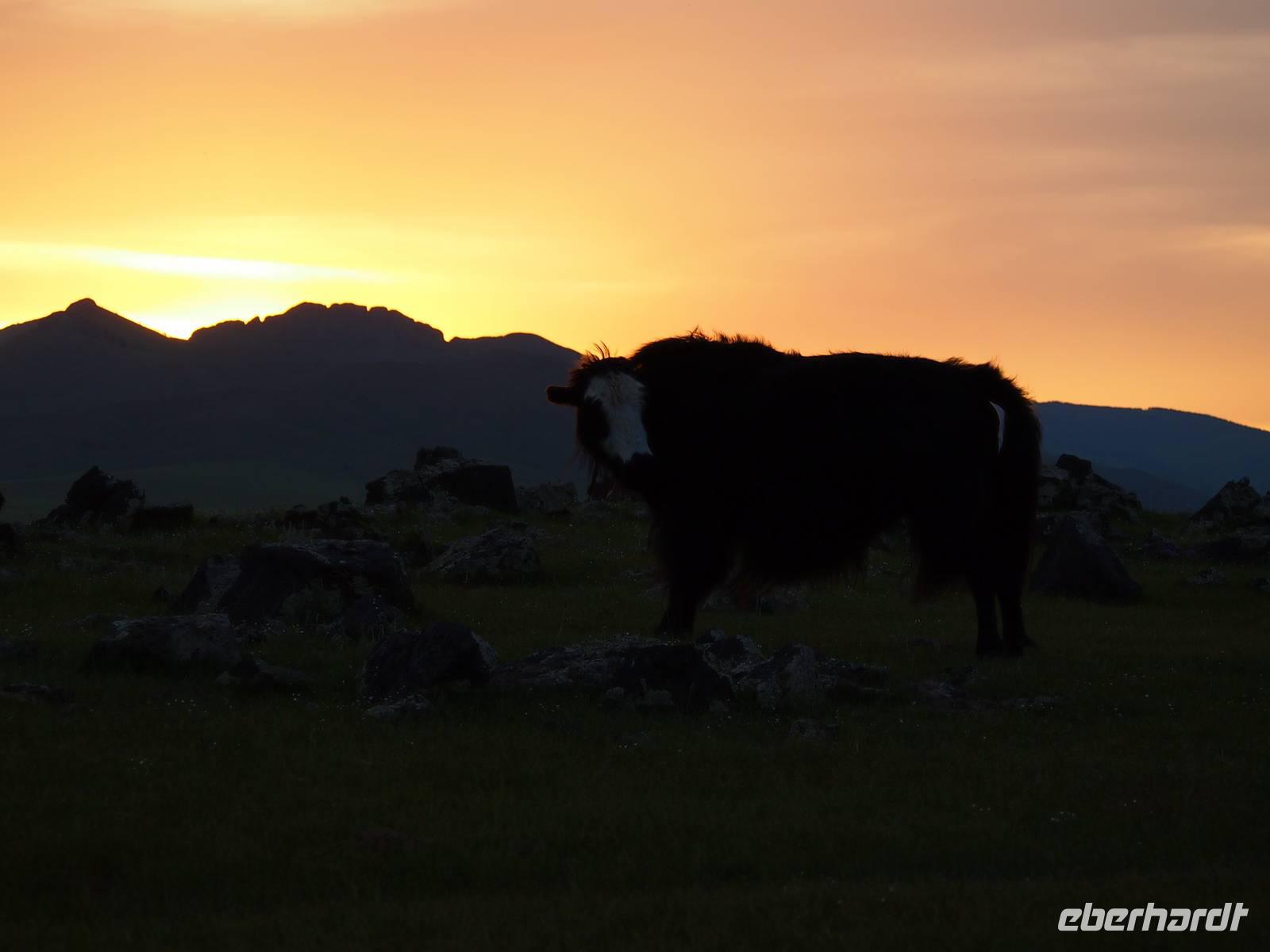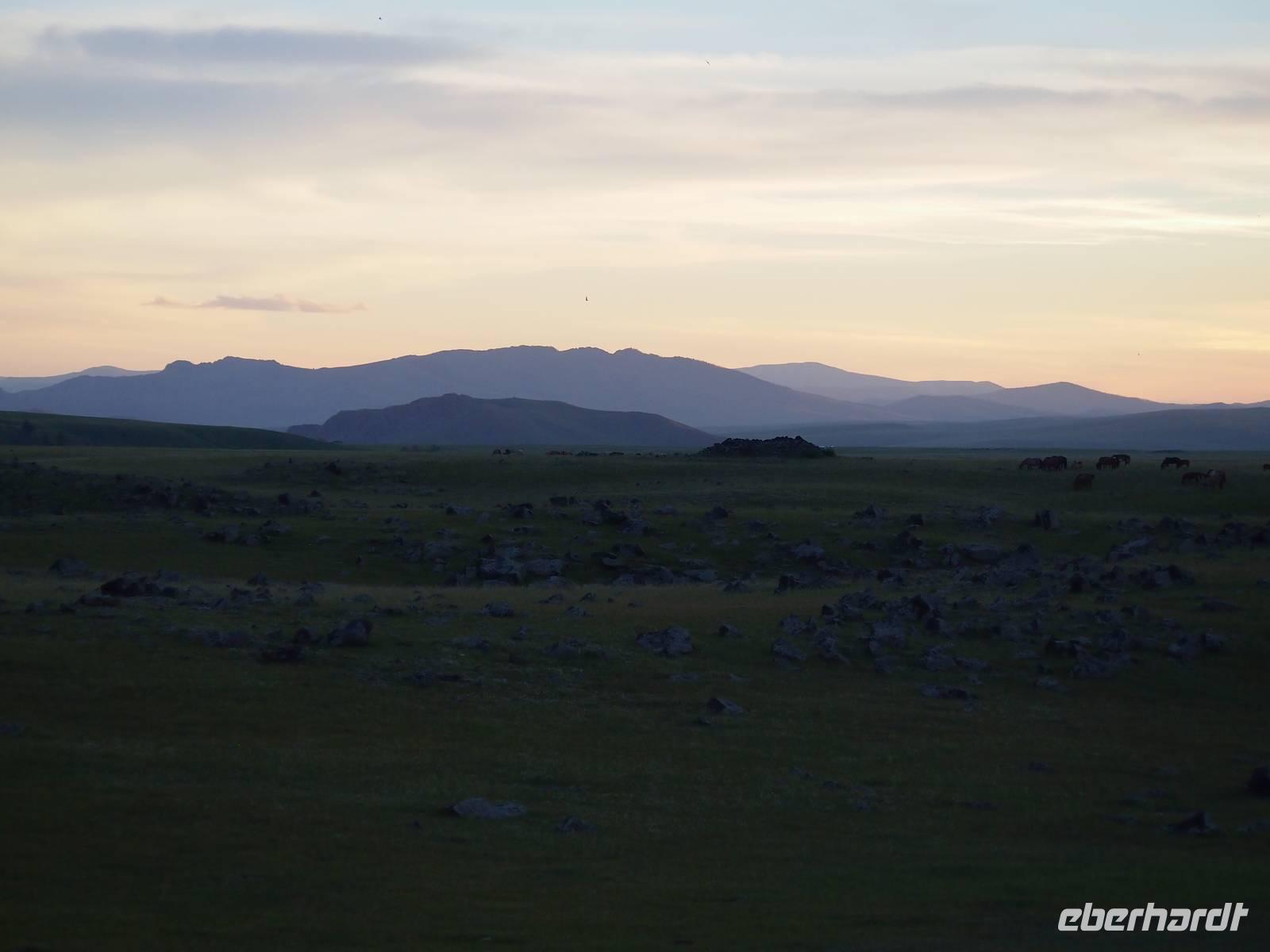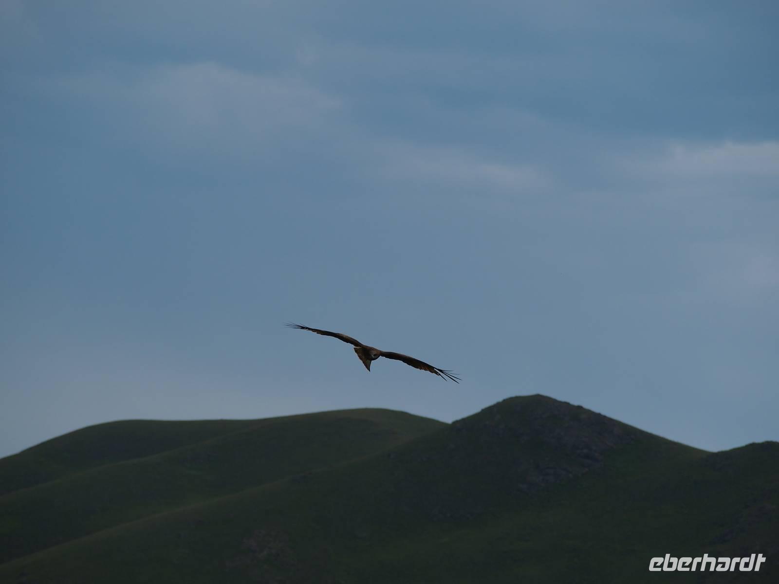 Unsere Mittagspause legten wir wieder in der unendlichen Weite ein. Sensationell war dabei zu sehen, wie ein Adler über uns hinweg flog. Auf unserer weiteren Fahrt sahen wir noch viele weitere Adler. Die Landschaft wurde immer idyllischer und faszinierender. Dieses saftige Grün der Wiesen und die leicht blauen Berge in der Ferne. Auf den Wiesen sah man sehr viele Pferde, Rinder und unsere ersten Yaks auf der Reise. Unser Camp erreichten wir erst am Abend. Nach dem Essen erkundeten einige noch die nähere Umgebung und sahen so neben der hervorragenden Aussicht auch noch Felszeichnungen. Nach einem doch etwas anstrengenden Tag ging es heute für uns zeitig ins Bett.