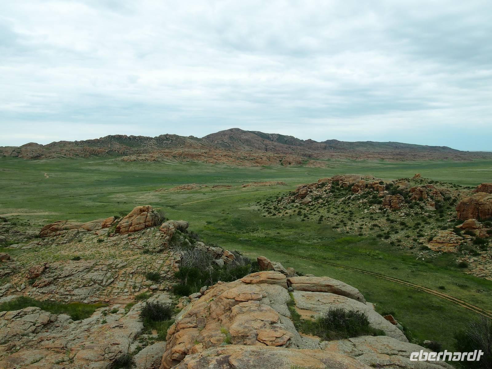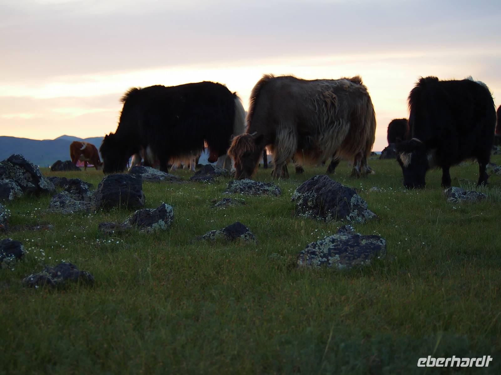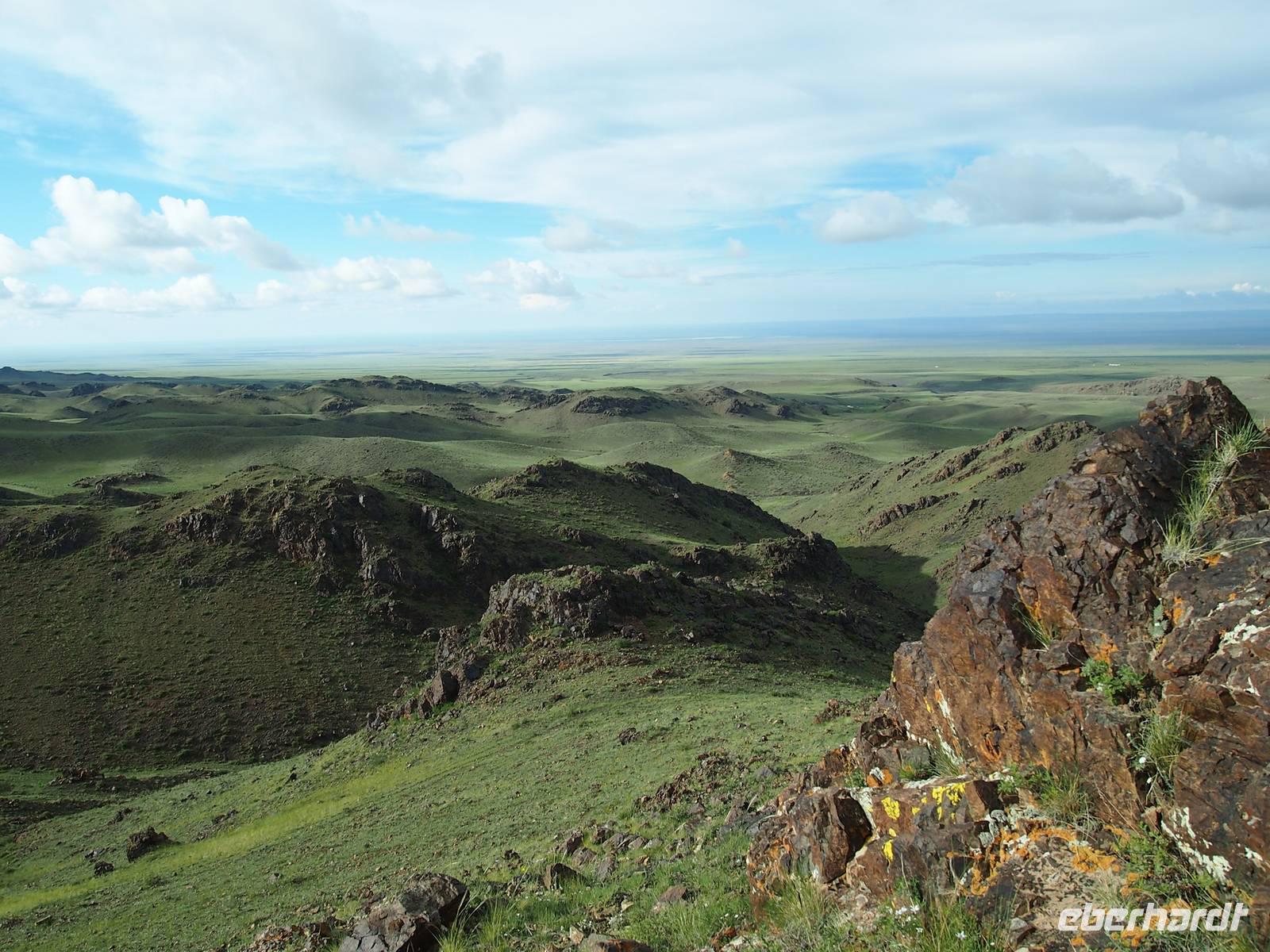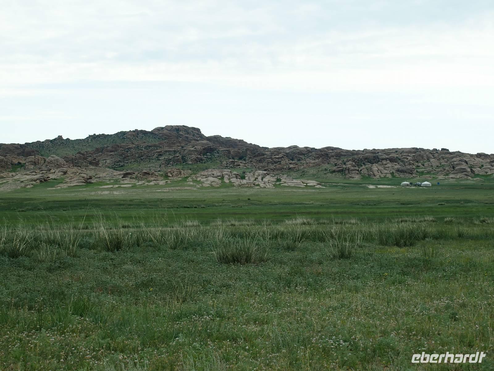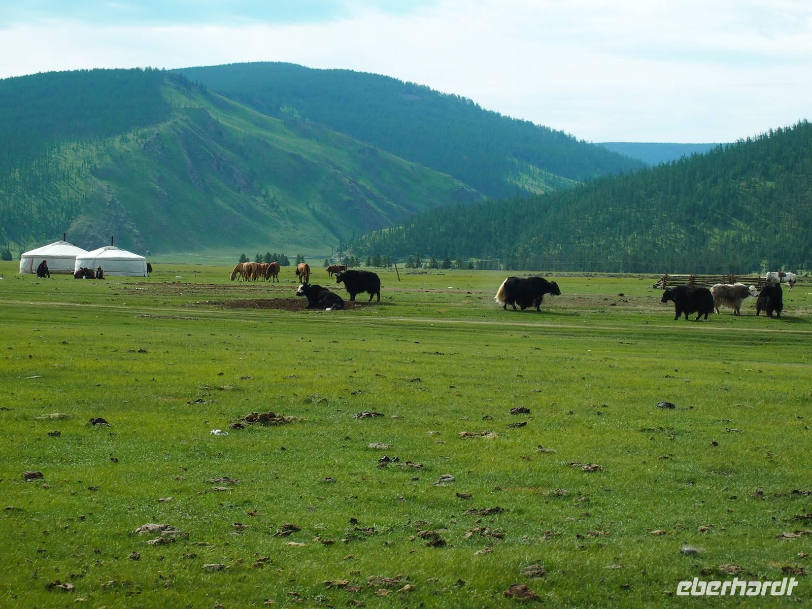 Unsere Mittagspause legten wir wieder in der unendlichen Weite ein. Sensationell war dabei zu sehen, wie ein Adler über uns hinweg flog. Auf unserer weiteren Fahrt sahen wir noch viele weitere Adler. Die Landschaft wurde immer idyllischer und faszinierender. Dieses saftige Grün der Wiesen und die leicht blauen Berge in der Ferne. Auf den Wiesen sah man sehr viele Pferde, Rinder und unsere ersten Yaks auf der Reise. Unser Camp erreichten wir erst am Abend. Nach dem Essen erkundeten einige noch die nähere Umgebung und sahen so neben der hervorragenden Aussicht auch noch Felszeichnungen. Nach einem doch etwas anstrengenden Tag ging es heute für uns zeitig ins Bett.