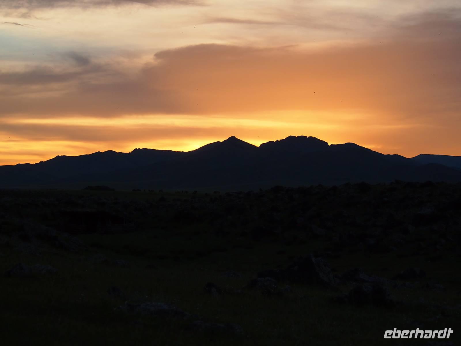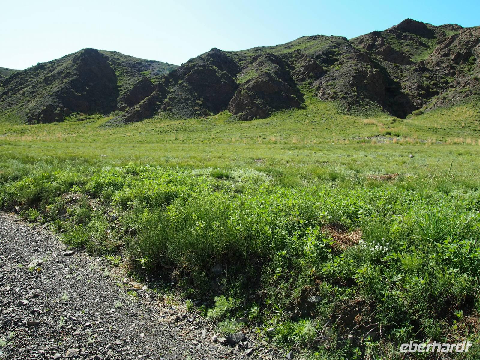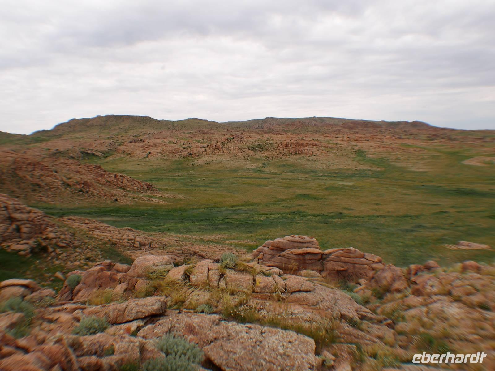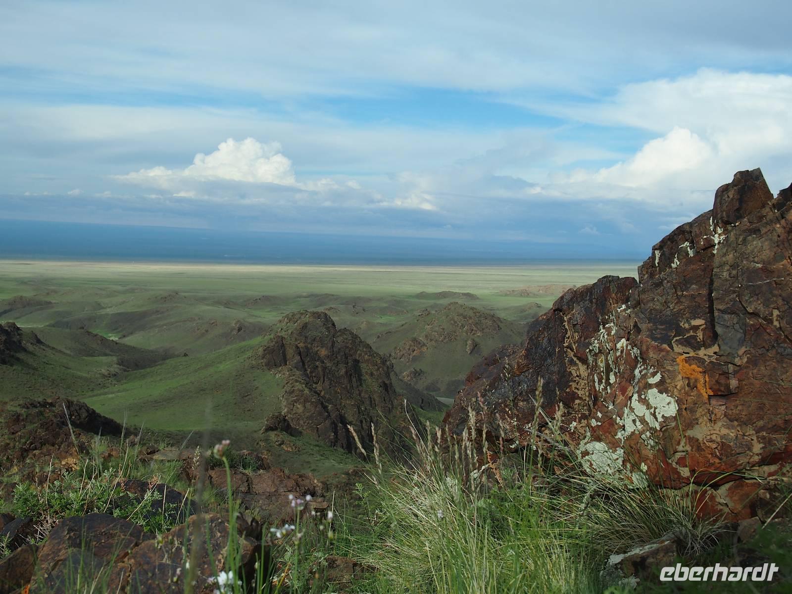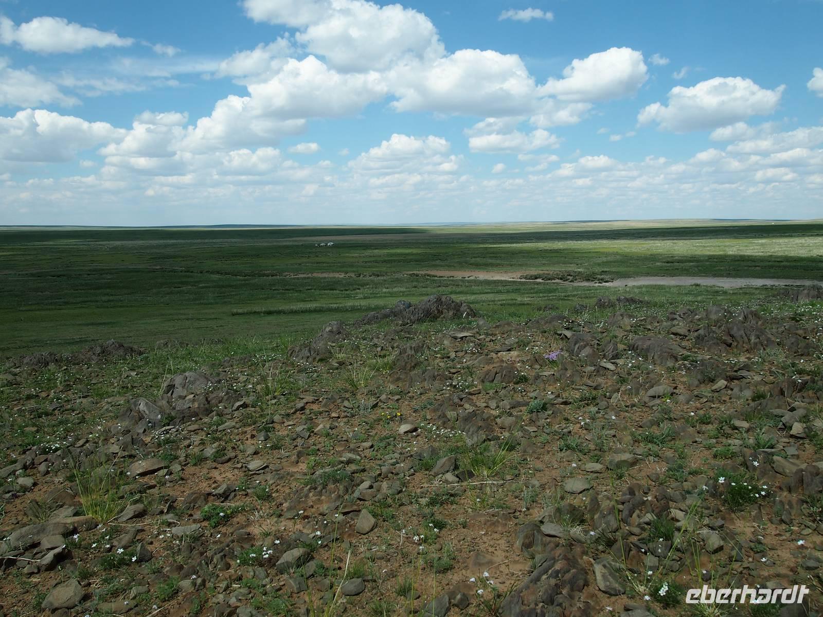Unsere Mittagspause legten wir wieder in der unendlichen Weite ein. Sensationell war dabei zu sehen, wie ein Adler über uns hinweg flog. Auf unserer weiteren Fahrt sahen wir noch viele weitere Adler. Die Landschaft wurde immer idyllischer und faszinierender. Dieses saftige Grün der Wiesen und die leicht blauen Berge in der Ferne. Auf den Wiesen sah man sehr viele Pferde, Rinder und unsere ersten Yaks auf der Reise. Unser Camp erreichten wir erst am Abend. Nach dem Essen erkundeten einige noch die nähere Umgebung und sahen so neben der hervorragenden Aussicht auch noch Felszeichnungen. Nach einem doch etwas anstrengenden Tag ging es heute für uns zeitig ins Bett.