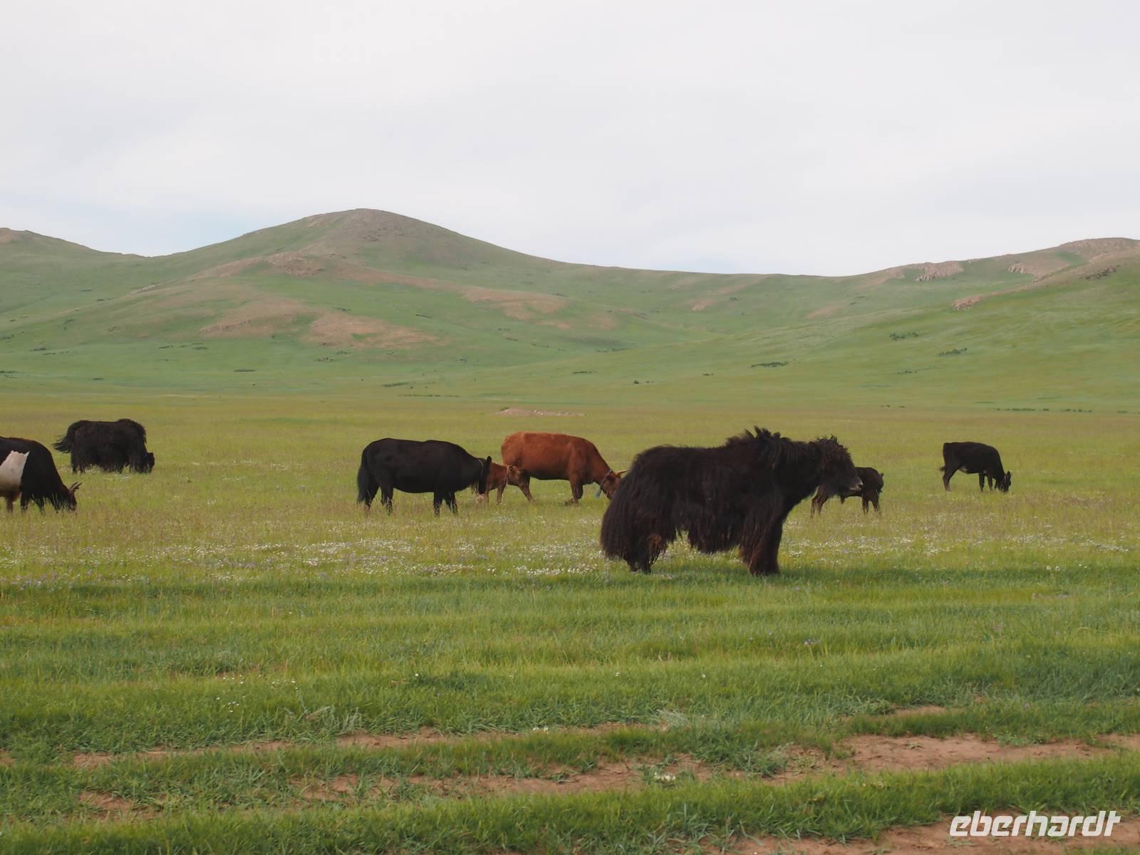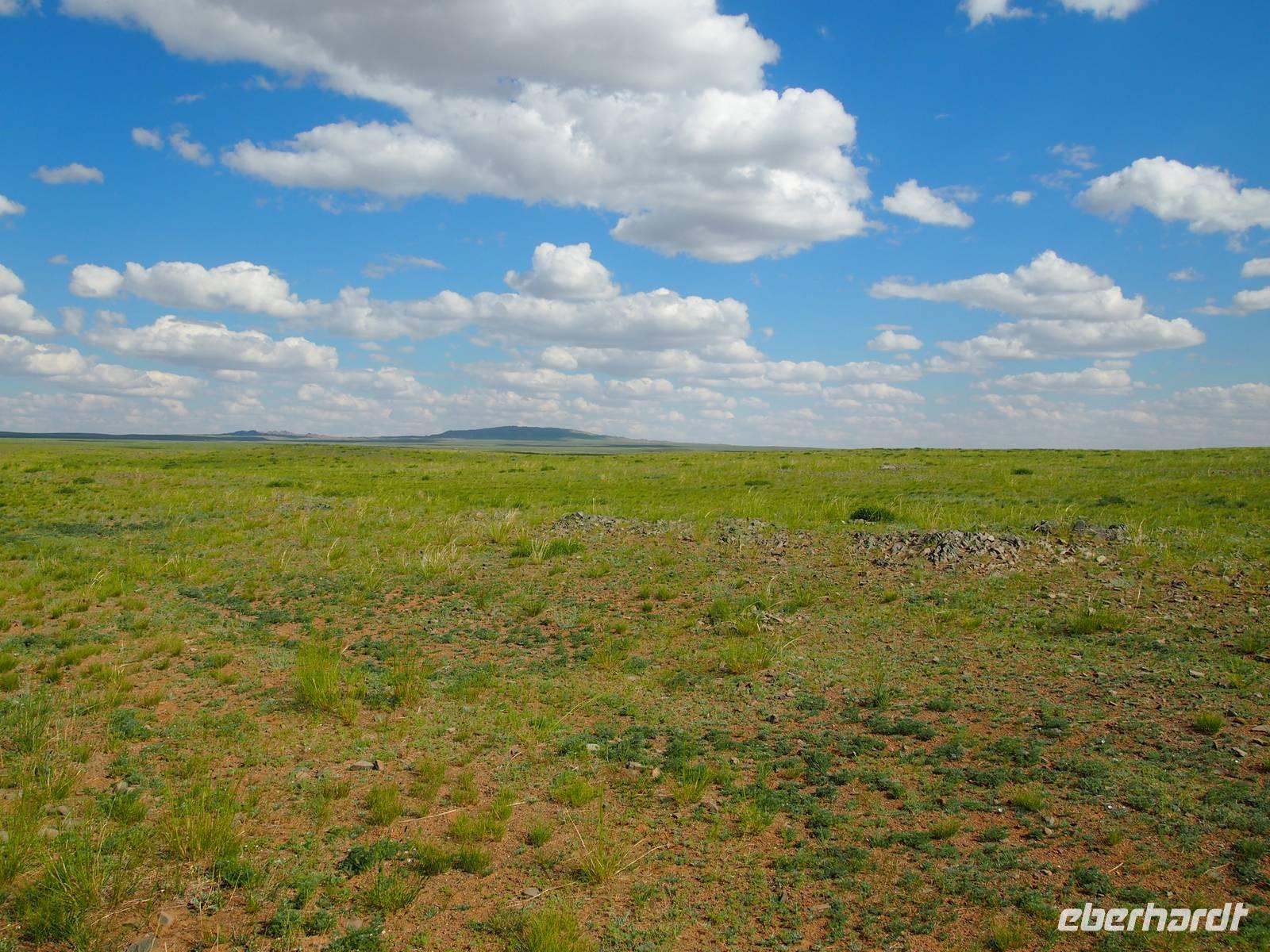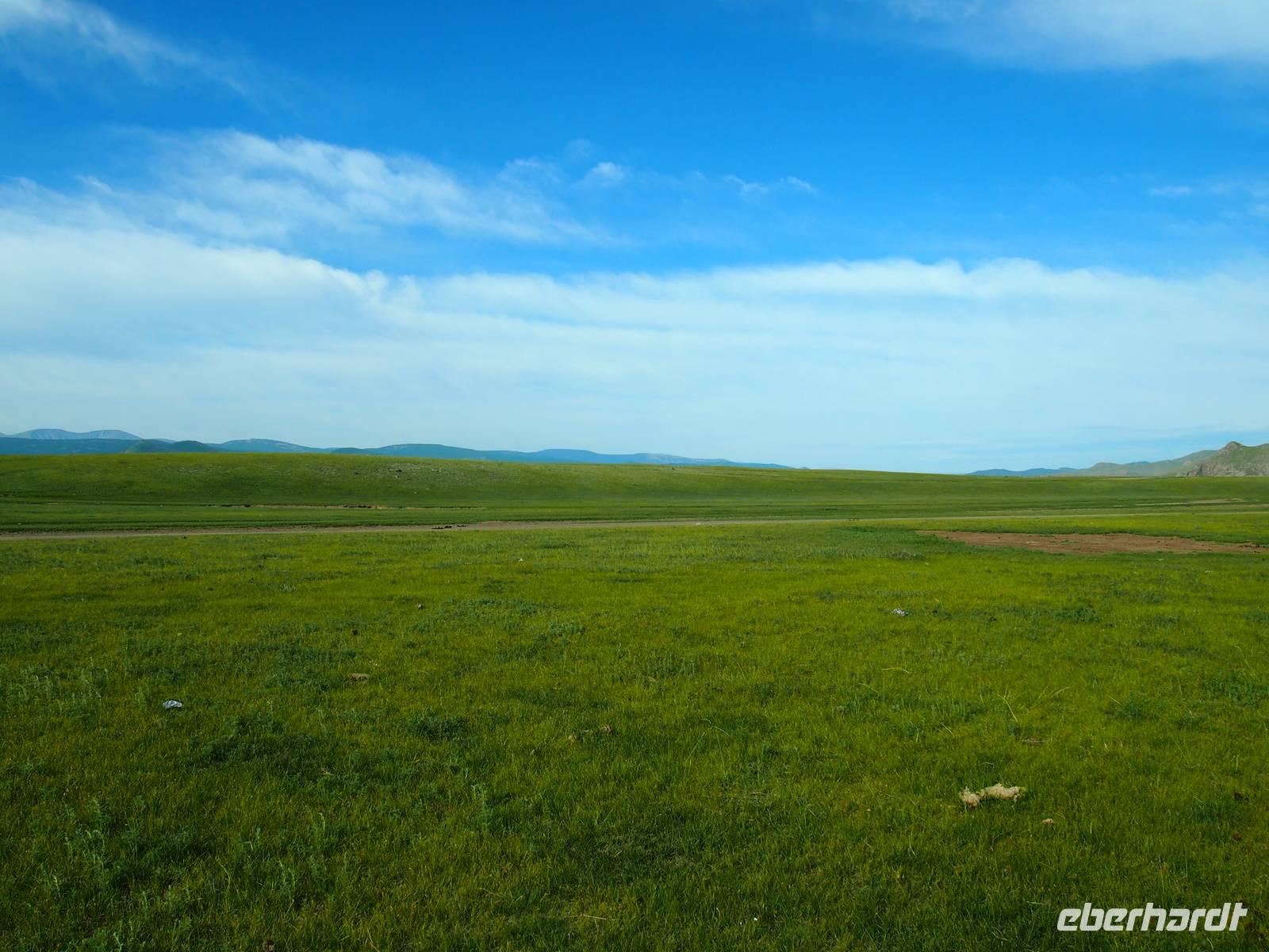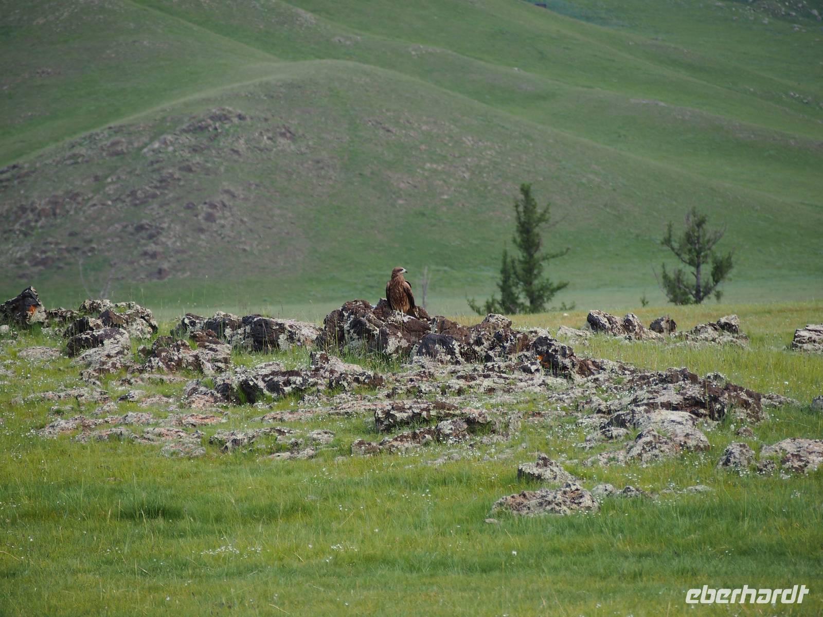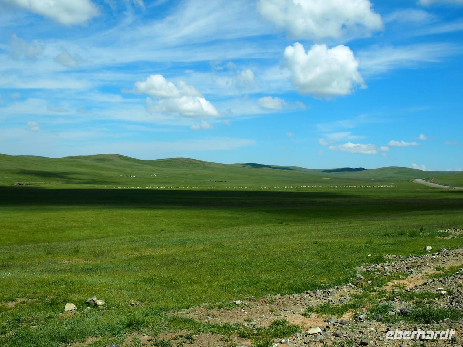 Unsere Mittagspause legten wir wieder in der unendlichen Weite ein. Sensationell war dabei zu sehen, wie ein Adler über uns hinweg flog. Auf unserer weiteren Fahrt sahen wir noch viele weitere Adler. Die Landschaft wurde immer idyllischer und faszinierender. Dieses saftige Grün der Wiesen und die leicht blauen Berge in der Ferne. Auf den Wiesen sah man sehr viele Pferde, Rinder und unsere ersten Yaks auf der Reise. Unser Camp erreichten wir erst am Abend. Nach dem Essen erkundeten einige noch die nähere Umgebung und sahen so neben der hervorragenden Aussicht auch noch Felszeichnungen. Nach einem doch etwas anstrengenden Tag ging es heute für uns zeitig ins Bett.