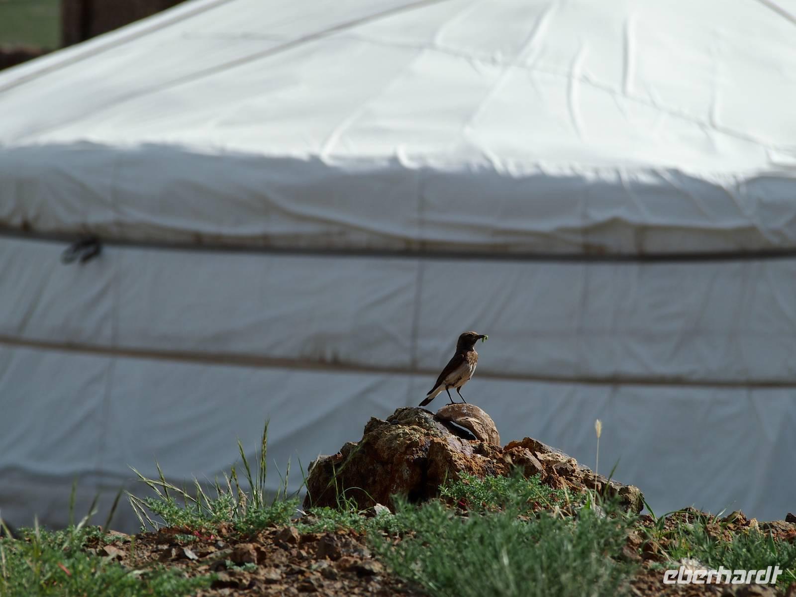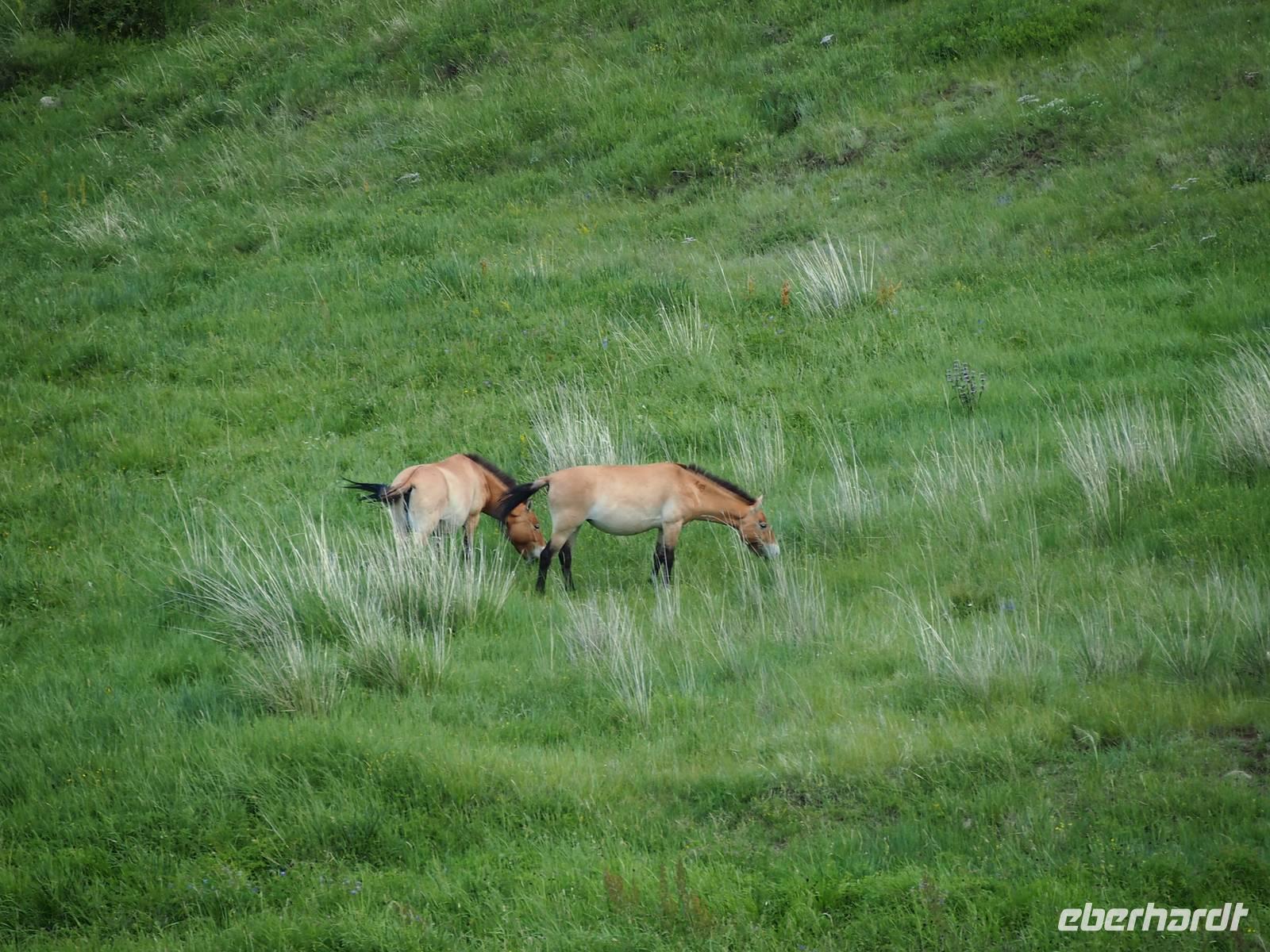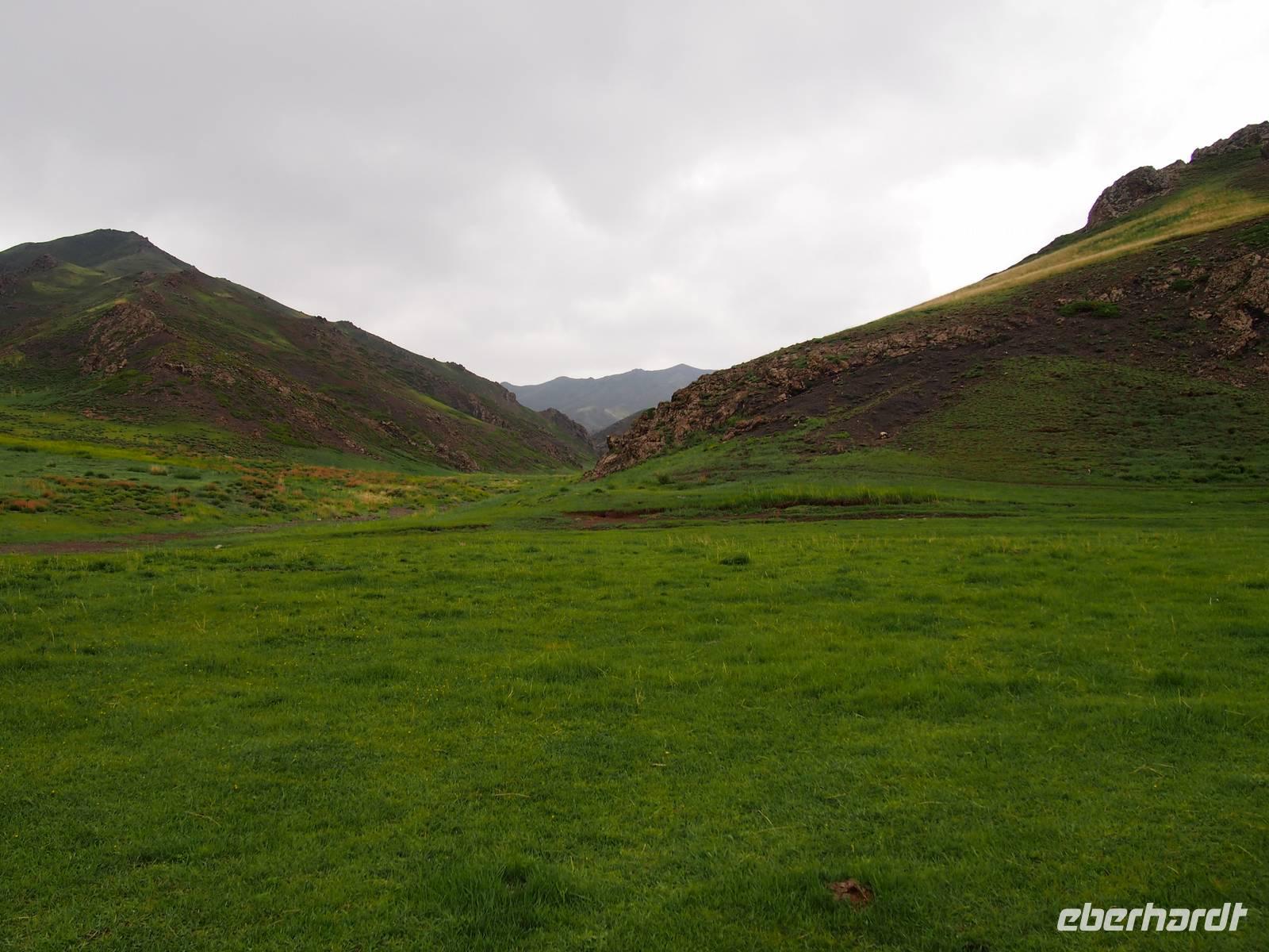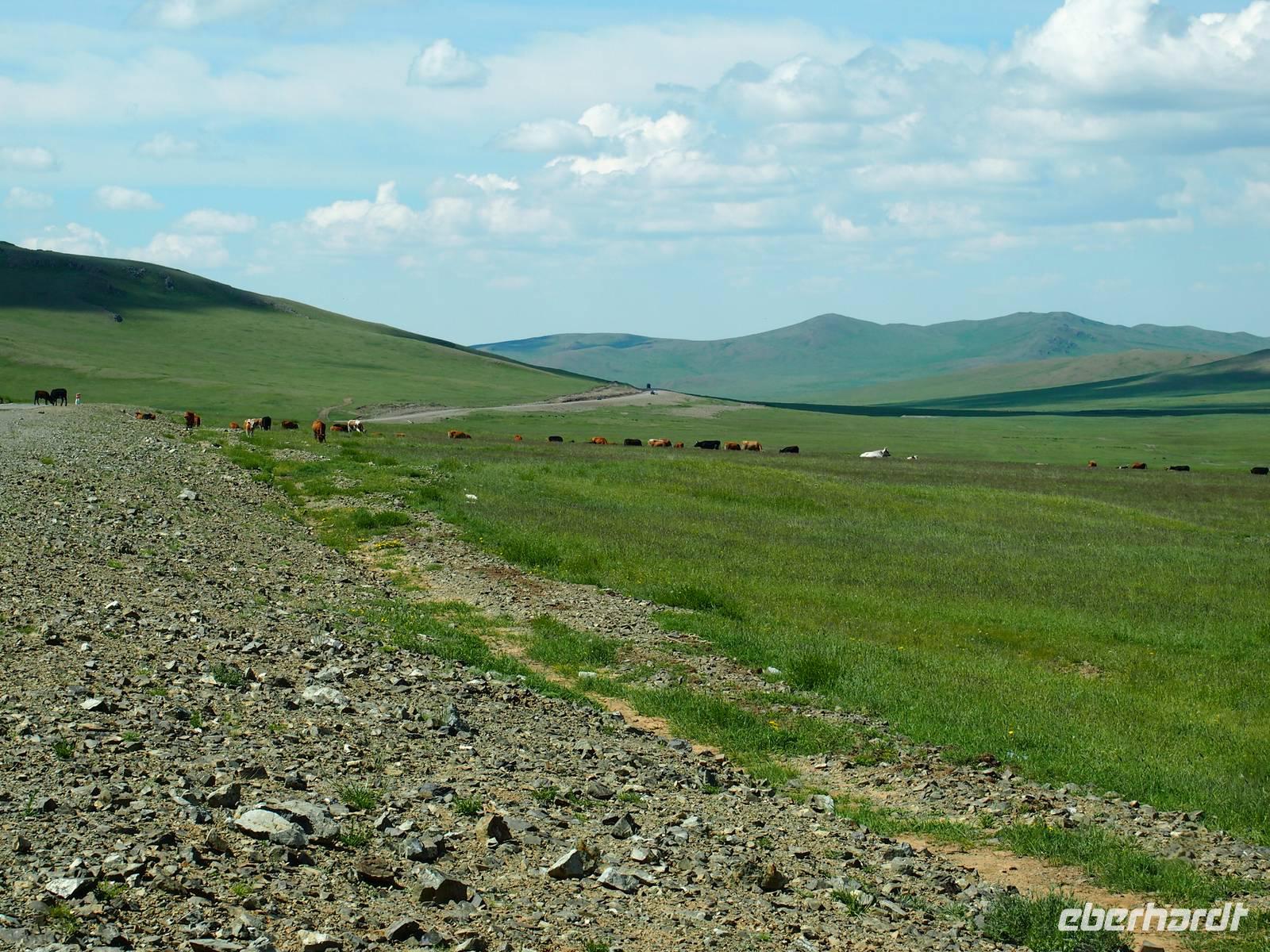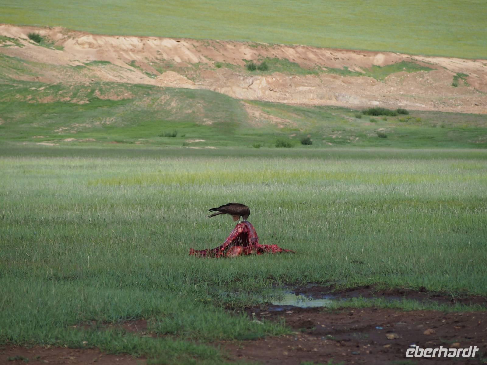 Unsere Mittagspause legten wir wieder in der unendlichen Weite ein. Sensationell war dabei zu sehen, wie ein Adler über uns hinweg flog. Auf unserer weiteren Fahrt sahen wir noch viele weitere Adler. Die Landschaft wurde immer idyllischer und faszinierender. Dieses saftige Grün der Wiesen und die leicht blauen Berge in der Ferne. Auf den Wiesen sah man sehr viele Pferde, Rinder und unsere ersten Yaks auf der Reise. Unser Camp erreichten wir erst am Abend. Nach dem Essen erkundeten einige noch die nähere Umgebung und sahen so neben der hervorragenden Aussicht auch noch Felszeichnungen. Nach einem doch etwas anstrengenden Tag ging es heute für uns zeitig ins Bett.