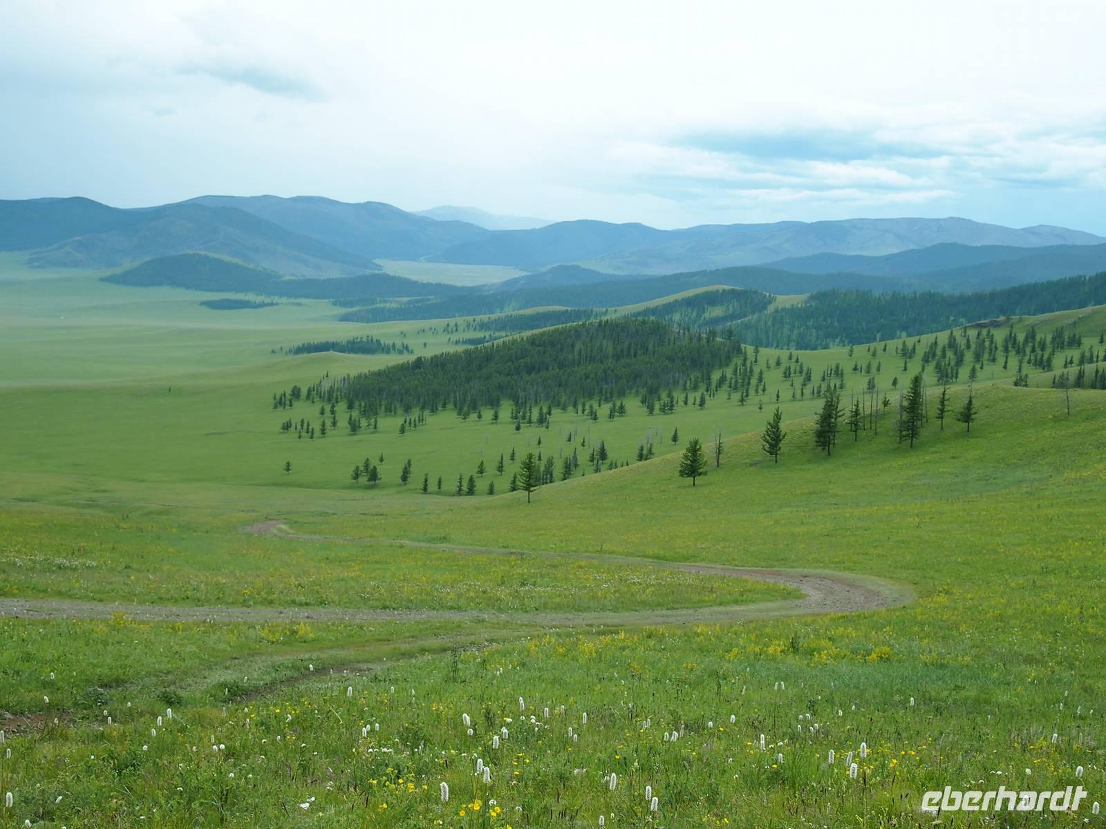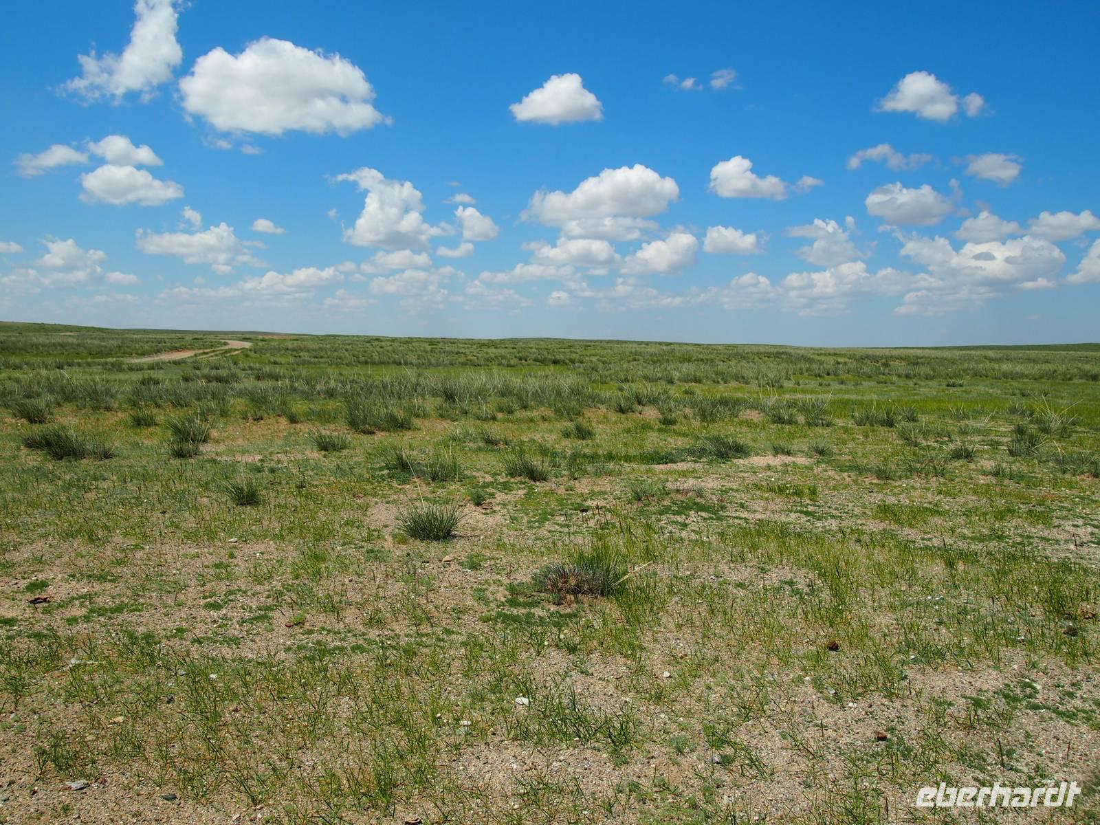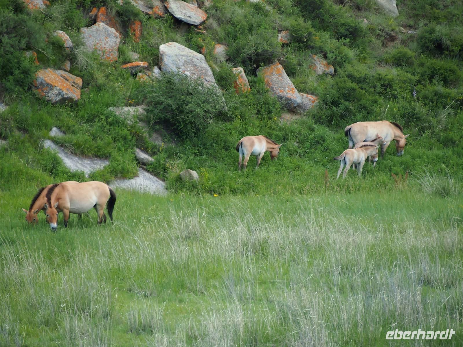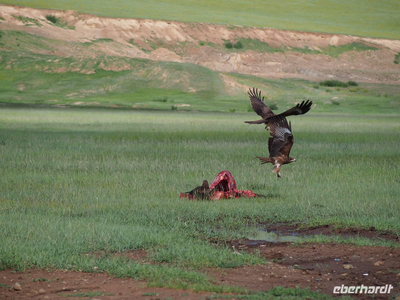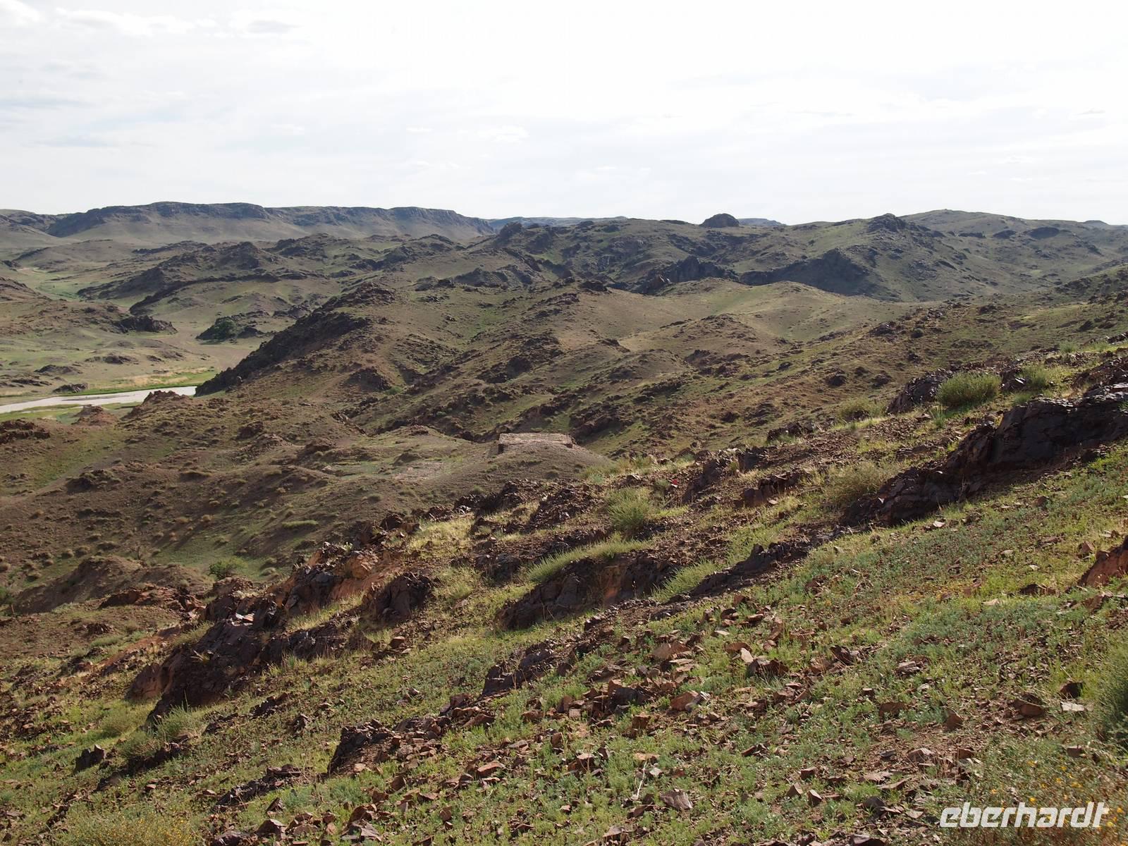 Unsere Mittagspause legten wir wieder in der unendlichen Weite ein. Sensationell war dabei zu sehen, wie ein Adler über uns hinweg flog. Auf unserer weiteren Fahrt sahen wir noch viele weitere Adler. Die Landschaft wurde immer idyllischer und faszinierender. Dieses saftige Grün der Wiesen und die leicht blauen Berge in der Ferne. Auf den Wiesen sah man sehr viele Pferde, Rinder und unsere ersten Yaks auf der Reise. Unser Camp erreichten wir erst am Abend. Nach dem Essen erkundeten einige noch die nähere Umgebung und sahen so neben der hervorragenden Aussicht auch noch Felszeichnungen. Nach einem doch etwas anstrengenden Tag ging es heute für uns zeitig ins Bett.