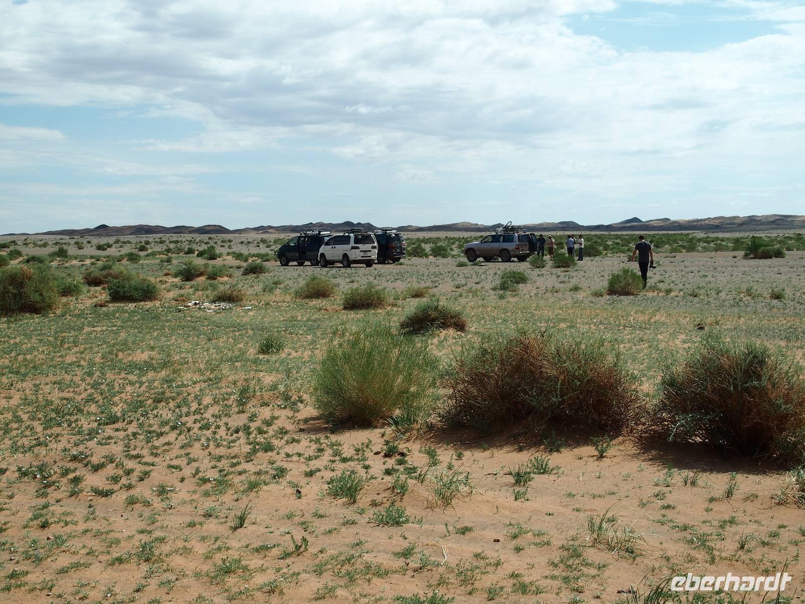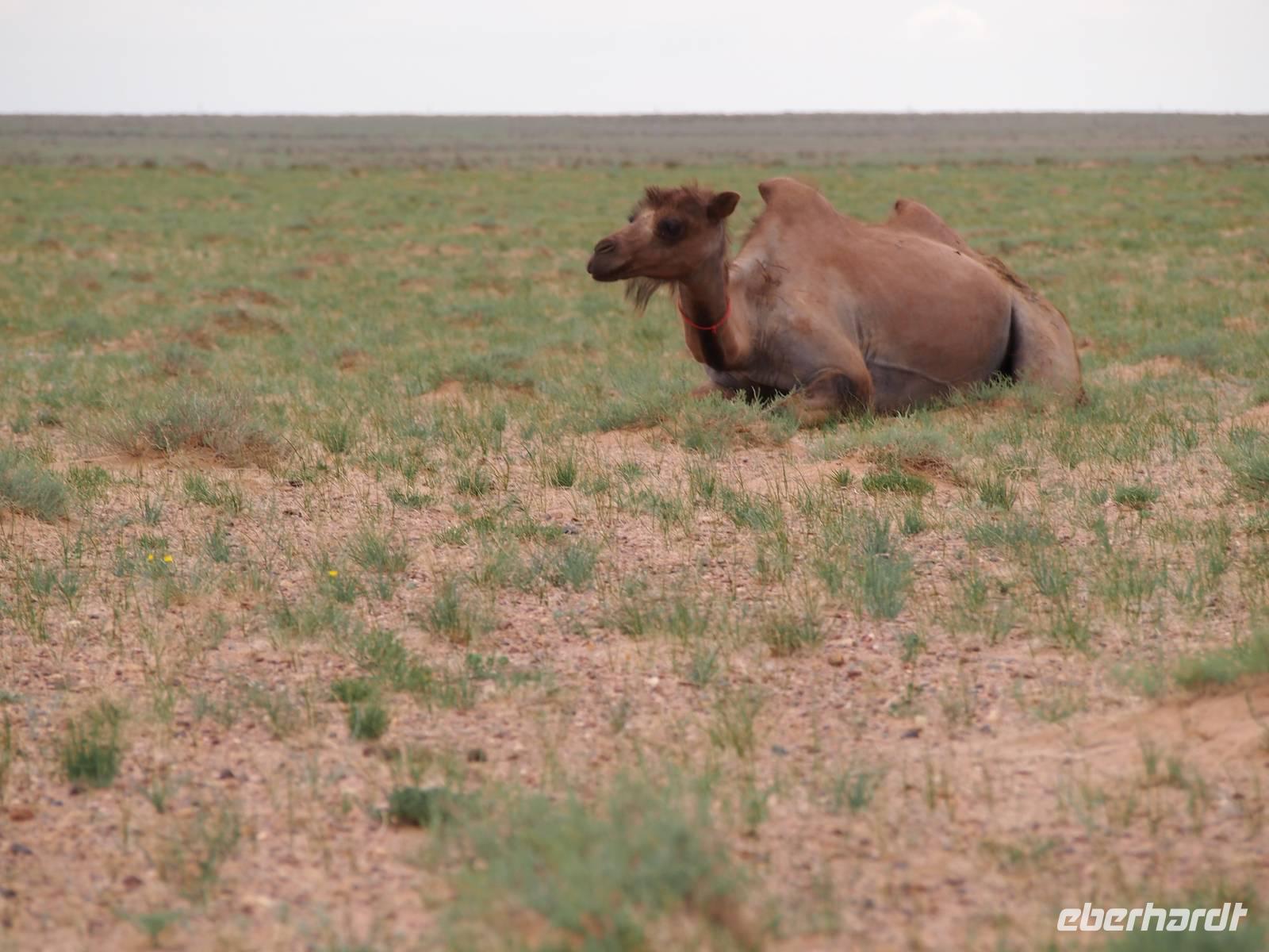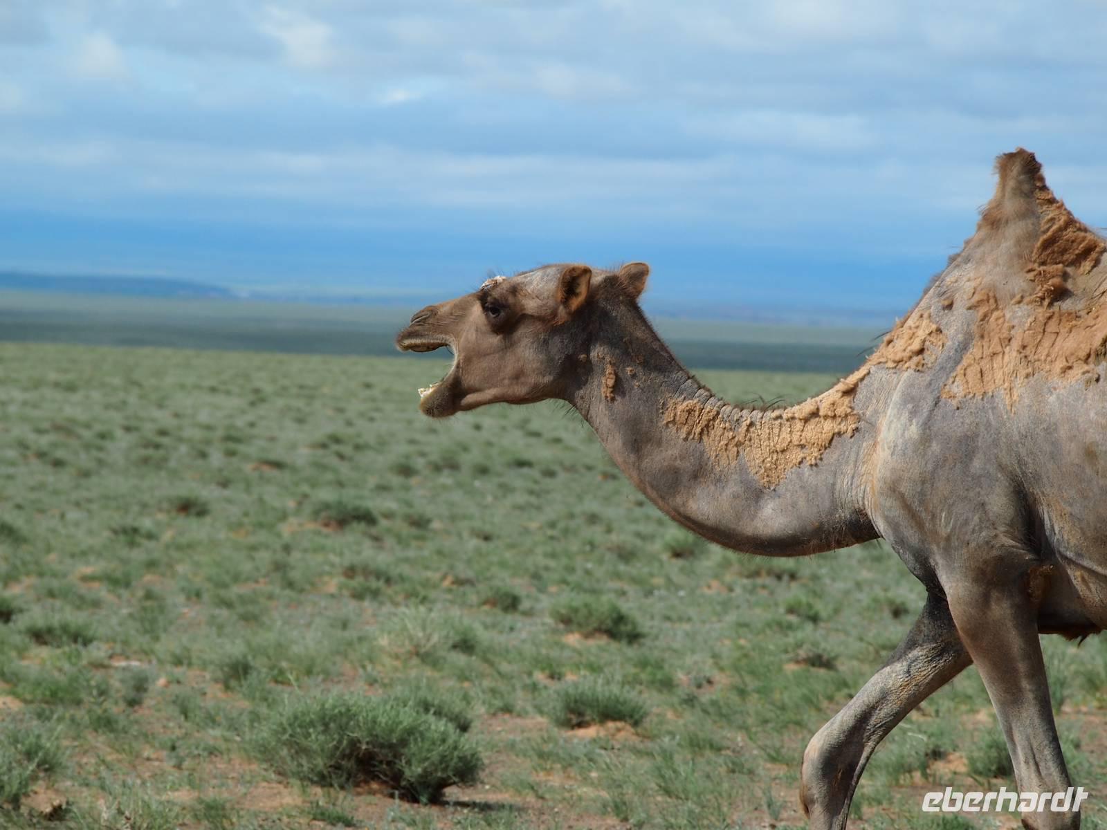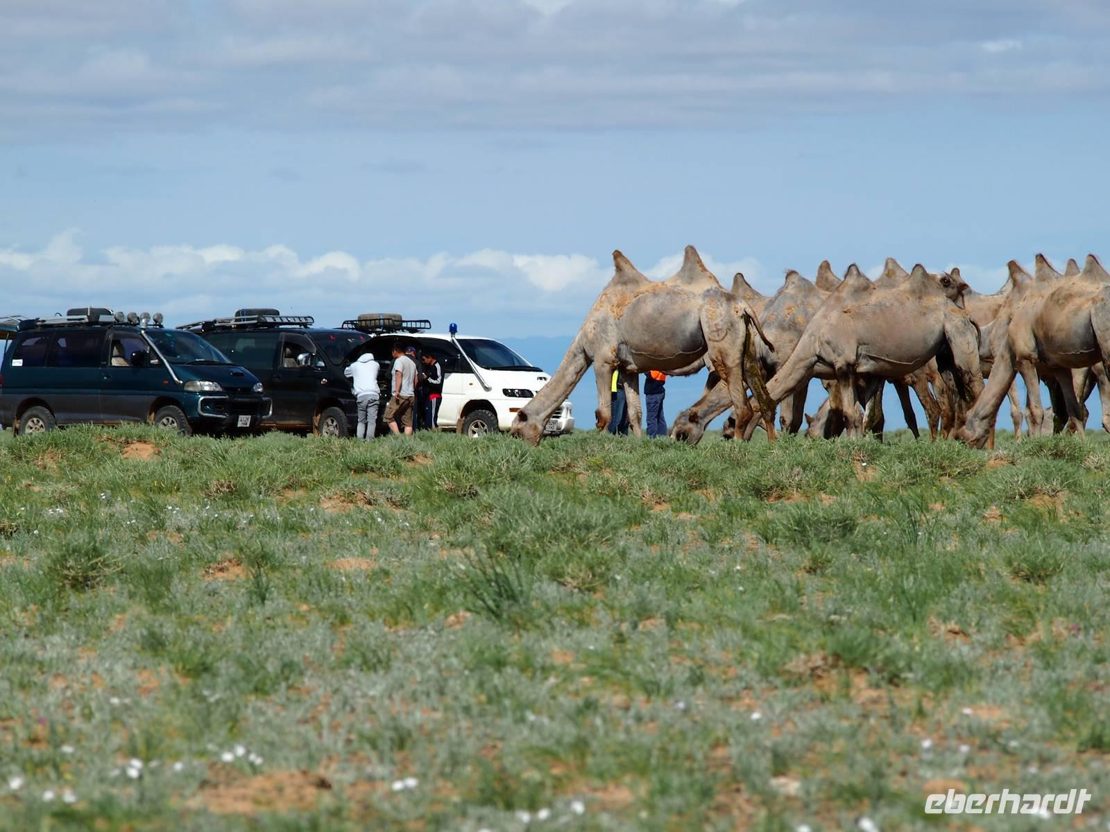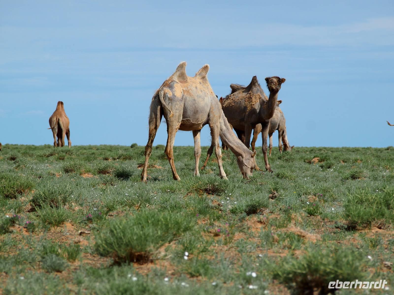 Nach dem Frühstück fuhren wir weiter Richtung Norden durch die Wüste Gobi. Nach relativ kurzer Fahrzeit hatte ein Auto eine Panne und so mussten wir eine kleine Zwangspause einlegen. Die Fahrer konnten das Problem schnell beheben, wir nutzten die Zeit, um die Pflanzenwelt zu begutachten und zu fotografieren. Zu unserem Glück waren zwei größere Kamelherden in unmittelbarer Nähe von uns und so machten wir uns auf den Weg die Tiere zu beobachten. Faszinierend und gespenstisch zugleich war das laute Röhren, welches die Kamele von sich gaben, da die Tiere, die wir bis dahin zu Gesicht bekommen hatten, völlig geräuschlos waren. Wir waren doch sehr erstaunt über den Klang, der mit einem Motorradgeräusch zu vergleichen ist.