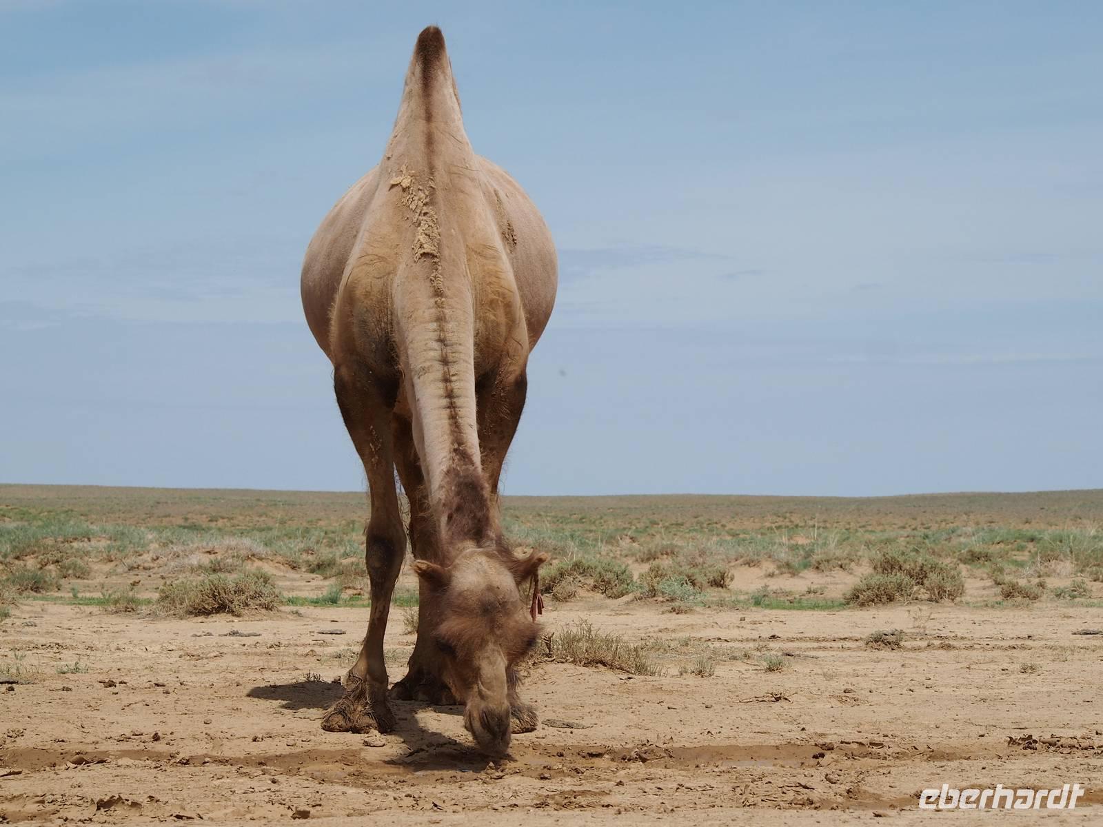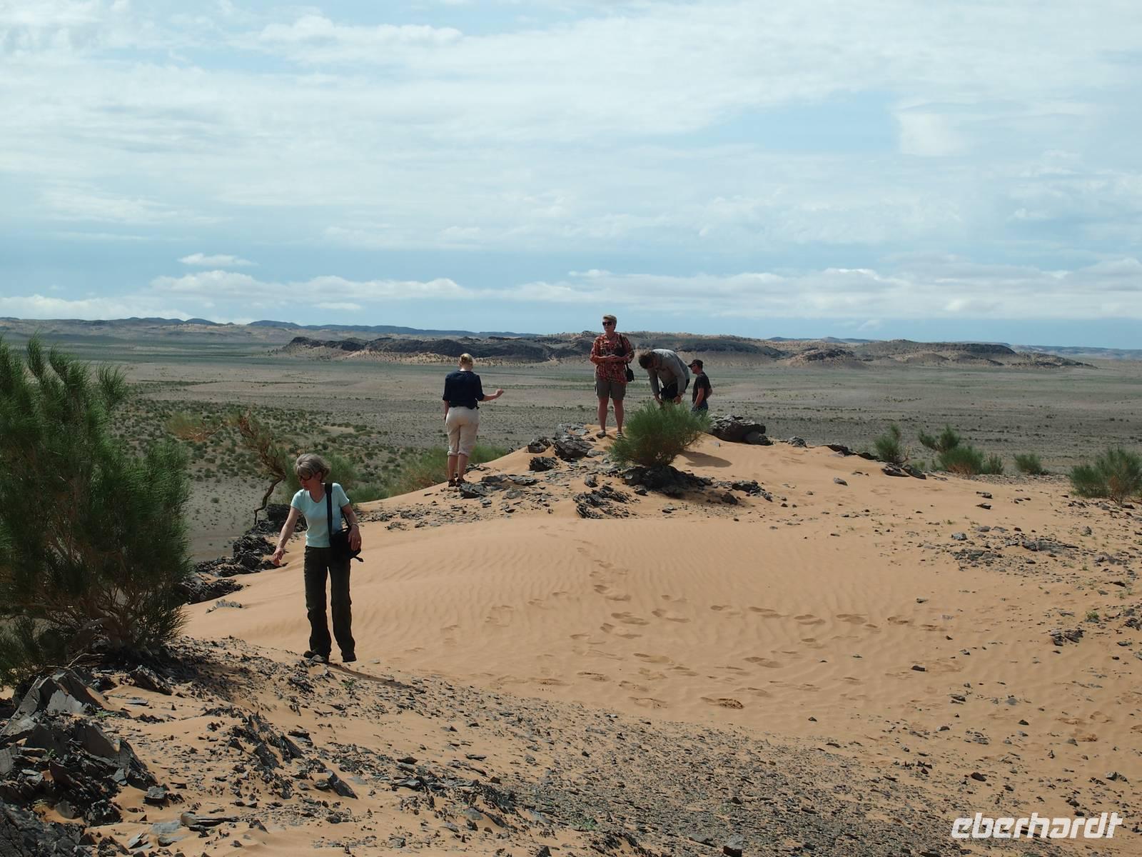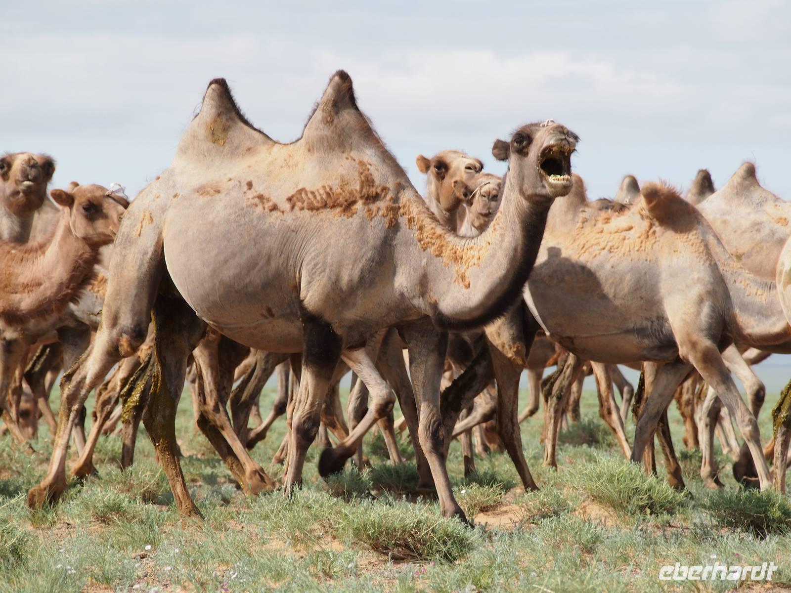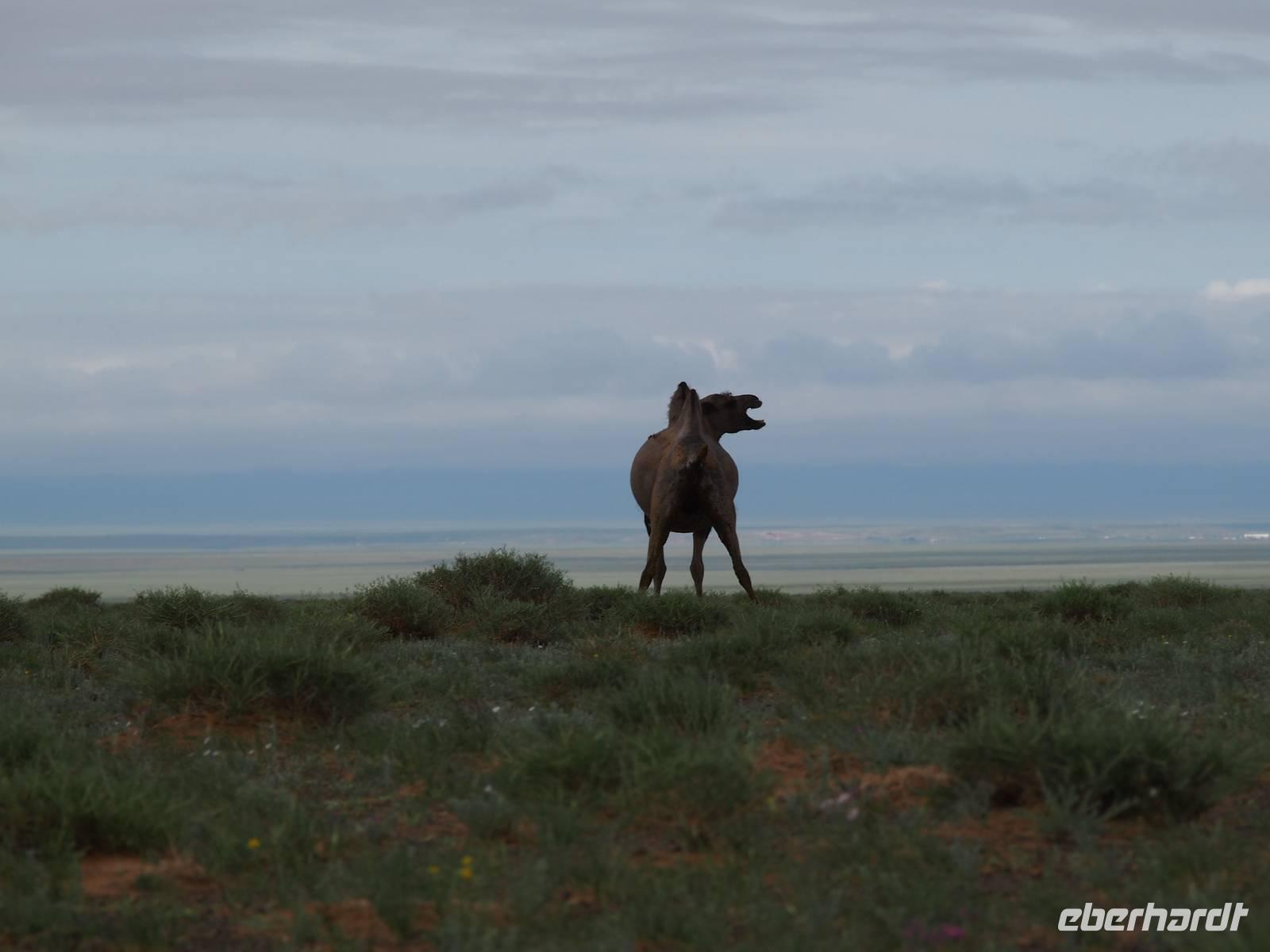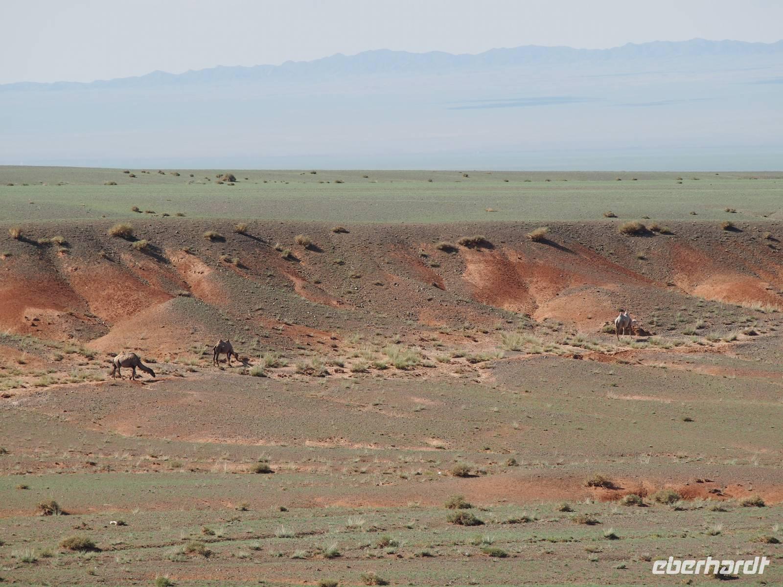 Nach dem Frühstück fuhren wir weiter Richtung Norden durch die Wüste Gobi. Nach relativ kurzer Fahrzeit hatte ein Auto eine Panne und so mussten wir eine kleine Zwangspause einlegen. Die Fahrer konnten das Problem schnell beheben, wir nutzten die Zeit, um die Pflanzenwelt zu begutachten und zu fotografieren. Zu unserem Glück waren zwei größere Kamelherden in unmittelbarer Nähe von uns und so machten wir uns auf den Weg die Tiere zu beobachten. Faszinierend und gespenstisch zugleich war das laute Röhren, welches die Kamele von sich gaben, da die Tiere, die wir bis dahin zu Gesicht bekommen hatten, völlig geräuschlos waren. Wir waren doch sehr erstaunt über den Klang, der mit einem Motorradgeräusch zu vergleichen ist.