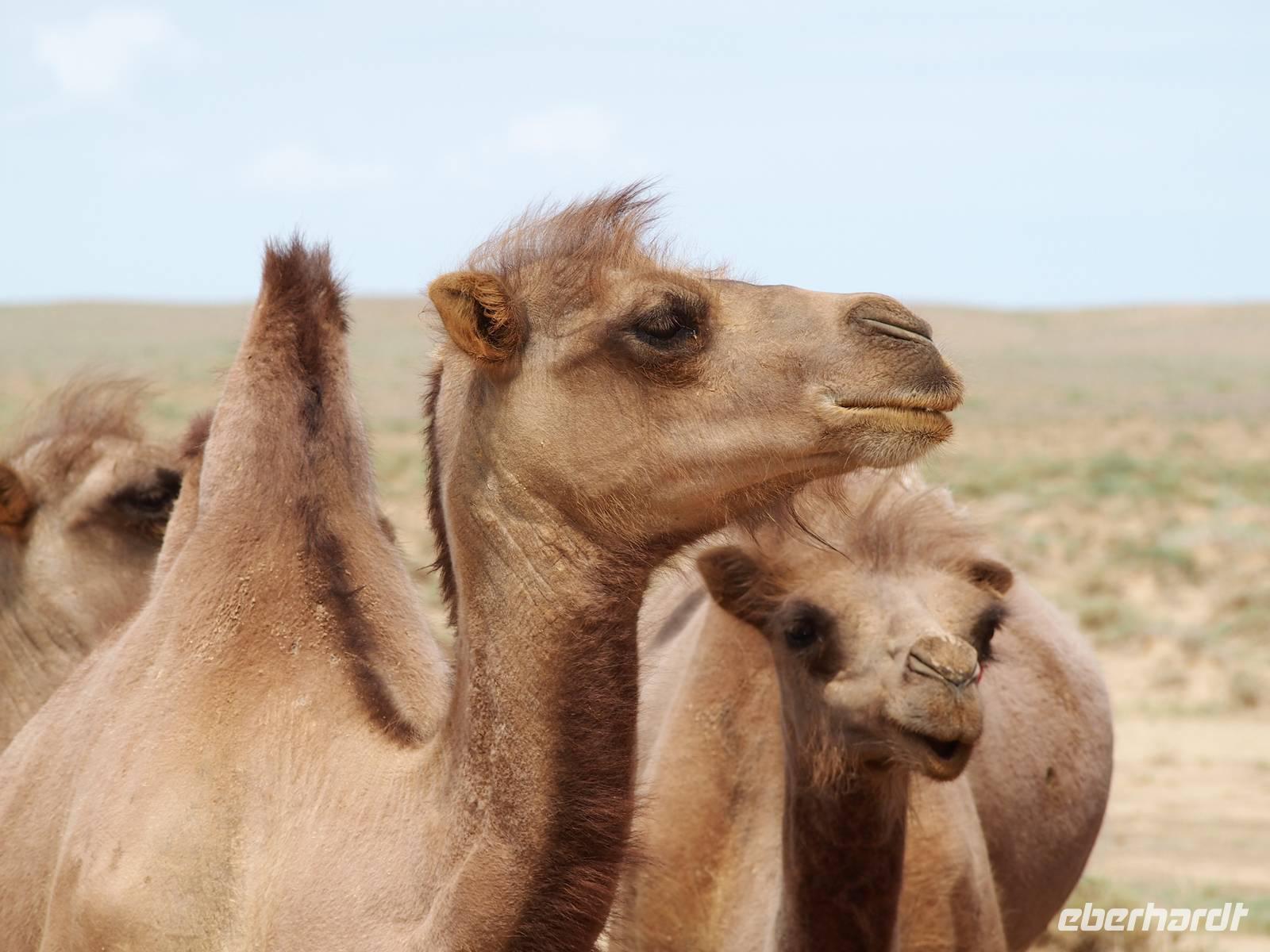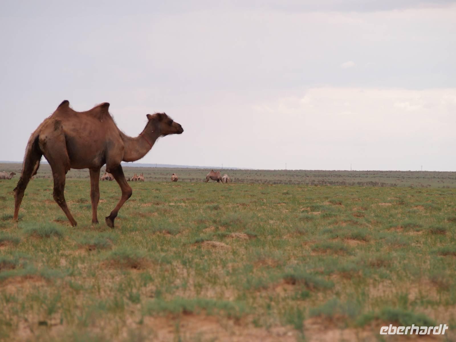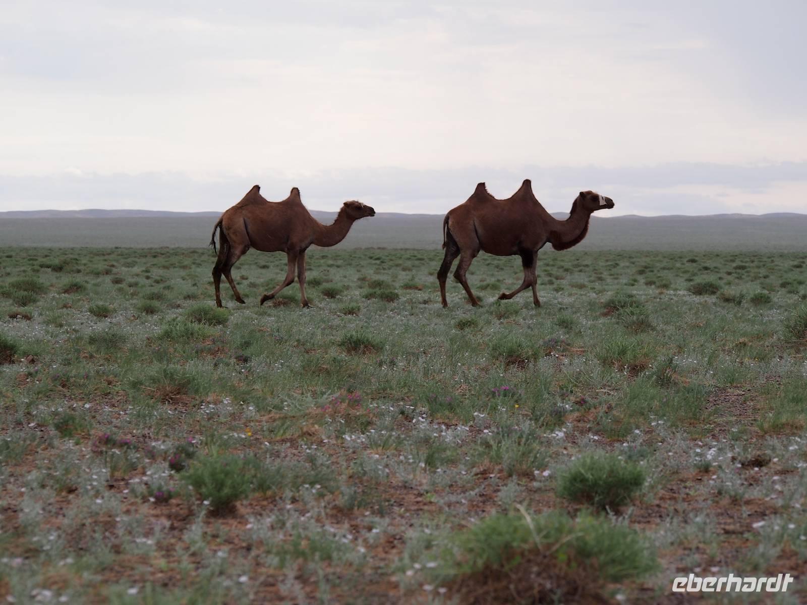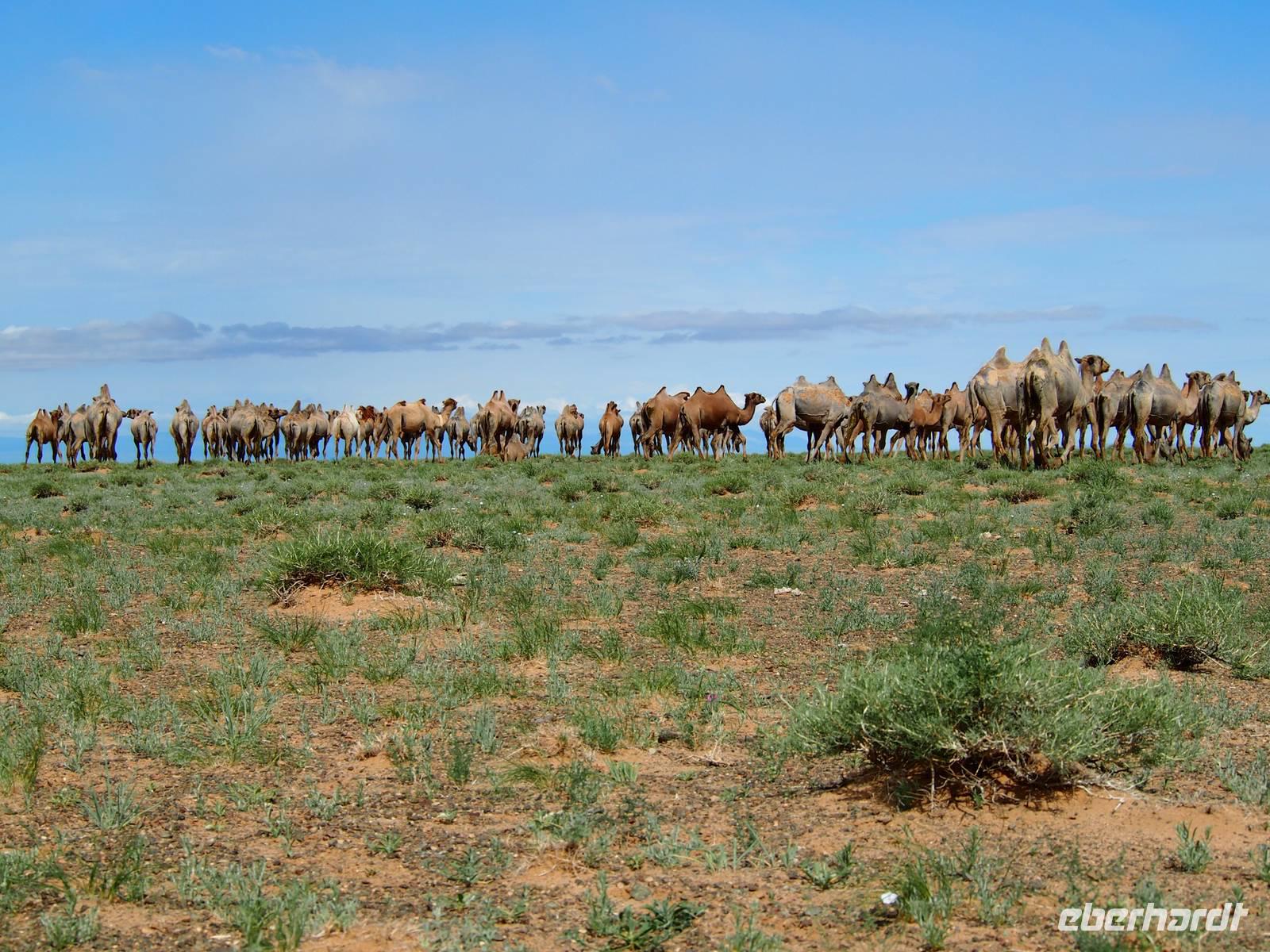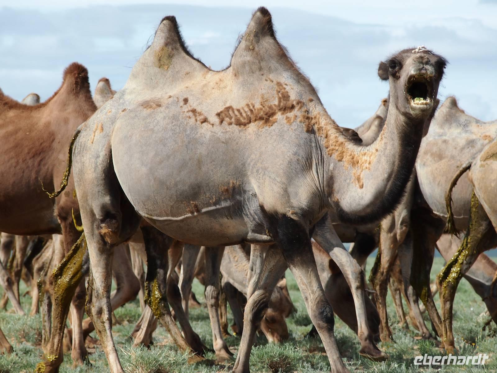 Nach dem Frühstück fuhren wir weiter Richtung Norden durch die Wüste Gobi. Nach relativ kurzer Fahrzeit hatte ein Auto eine Panne und so mussten wir eine kleine Zwangspause einlegen. Die Fahrer konnten das Problem schnell beheben, wir nutzten die Zeit, um die Pflanzenwelt zu begutachten und zu fotografieren. Zu unserem Glück waren zwei größere Kamelherden in unmittelbarer Nähe von uns und so machten wir uns auf den Weg die Tiere zu beobachten. Faszinierend und gespenstisch zugleich war das laute Röhren, welches die Kamele von sich gaben, da die Tiere, die wir bis dahin zu Gesicht bekommen hatten, völlig geräuschlos waren. Wir waren doch sehr erstaunt über den Klang, der mit einem Motorradgeräusch zu vergleichen ist.