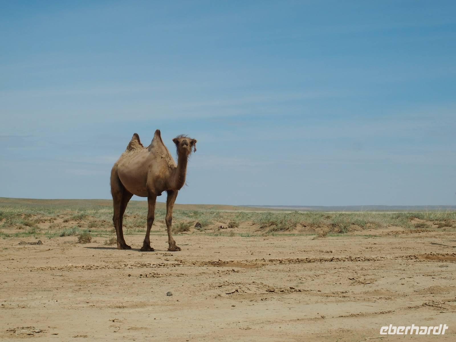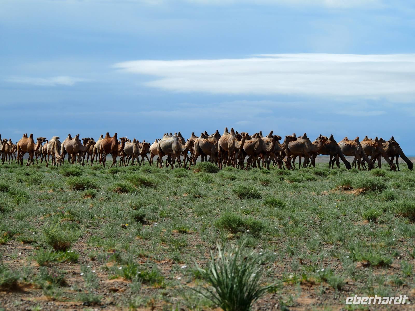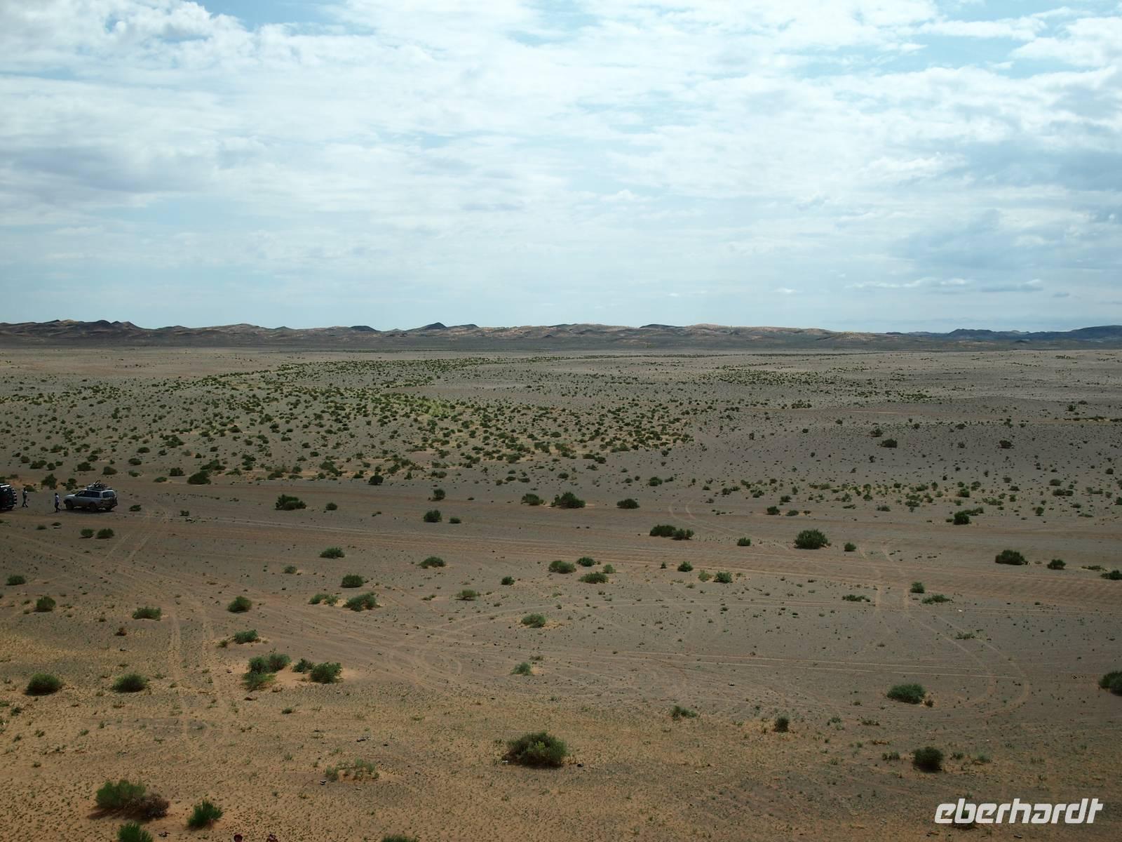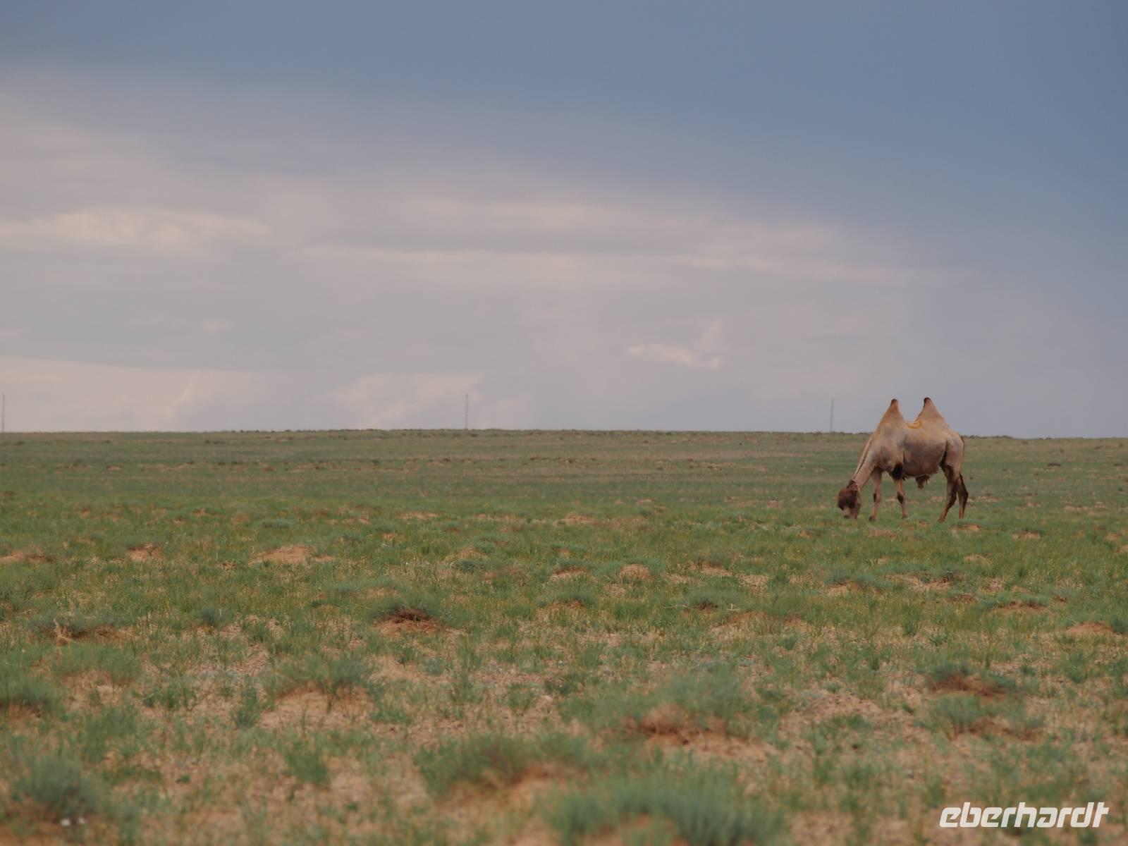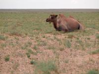 Nach dem Frühstück fuhren wir weiter Richtung Norden durch die Wüste Gobi. Nach relativ kurzer Fahrzeit hatte ein Auto eine Panne und so mussten wir eine kleine Zwangspause einlegen. Die Fahrer konnten das Problem schnell beheben, wir nutzten die Zeit, um die Pflanzenwelt zu begutachten und zu fotografieren. Zu unserem Glück waren zwei größere Kamelherden in unmittelbarer Nähe von uns und so machten wir uns auf den Weg die Tiere zu beobachten. Faszinierend und gespenstisch zugleich war das laute Röhren, welches die Kamele von sich gaben, da die Tiere, die wir bis dahin zu Gesicht bekommen hatten, völlig geräuschlos waren. Wir waren doch sehr erstaunt über den Klang, der mit einem Motorradgeräusch zu vergleichen ist.