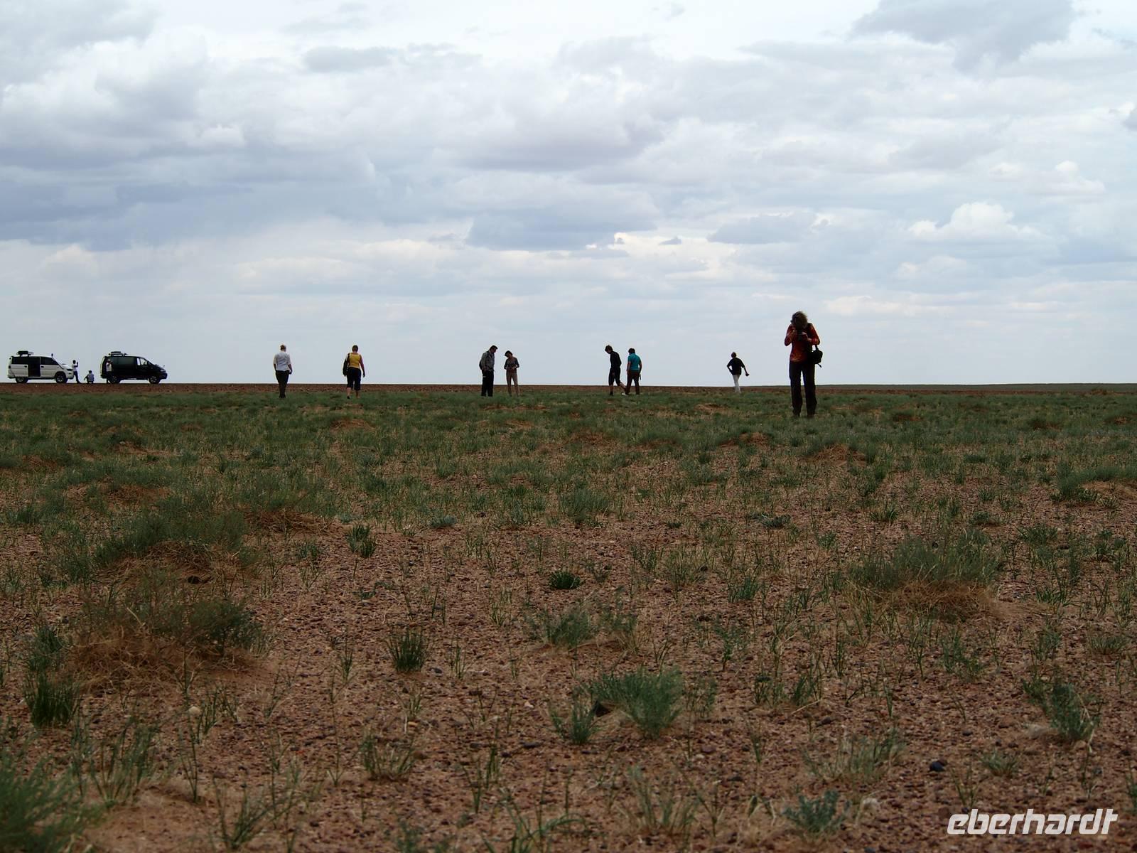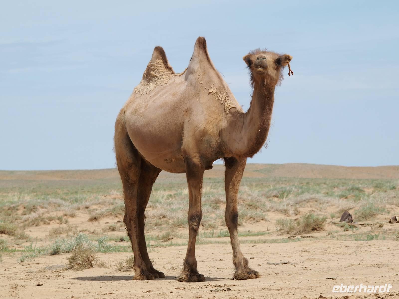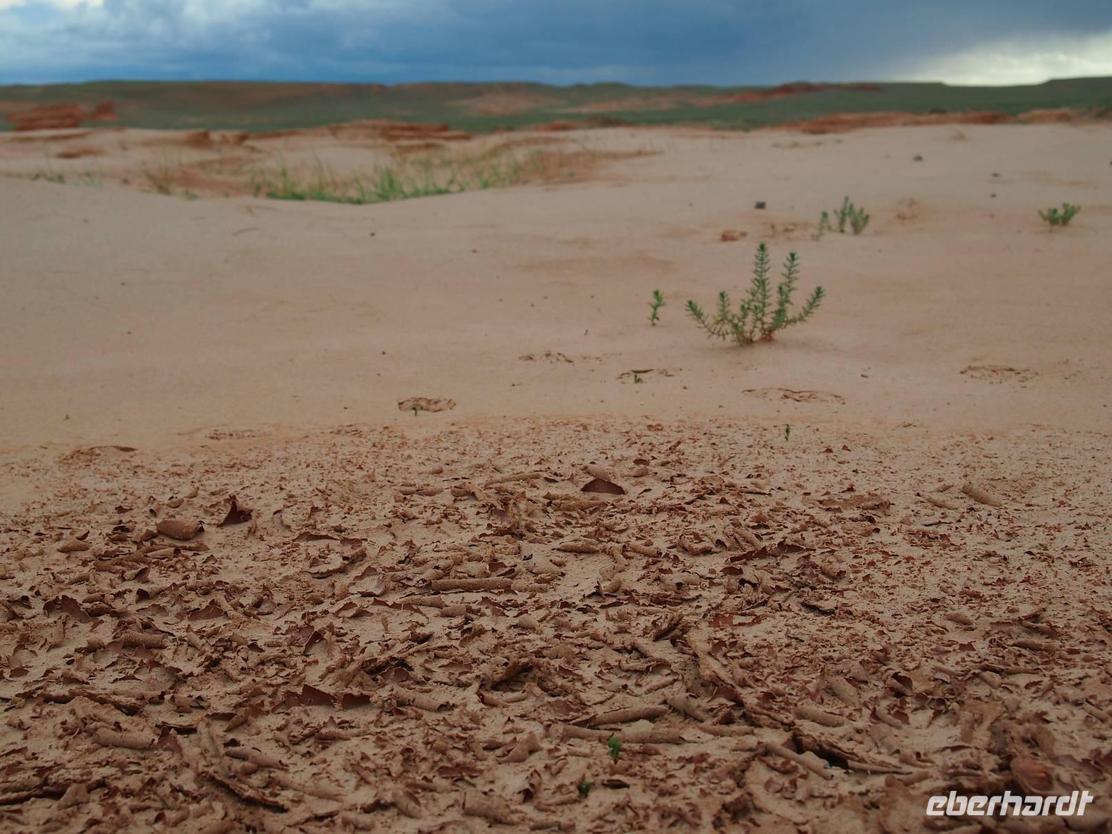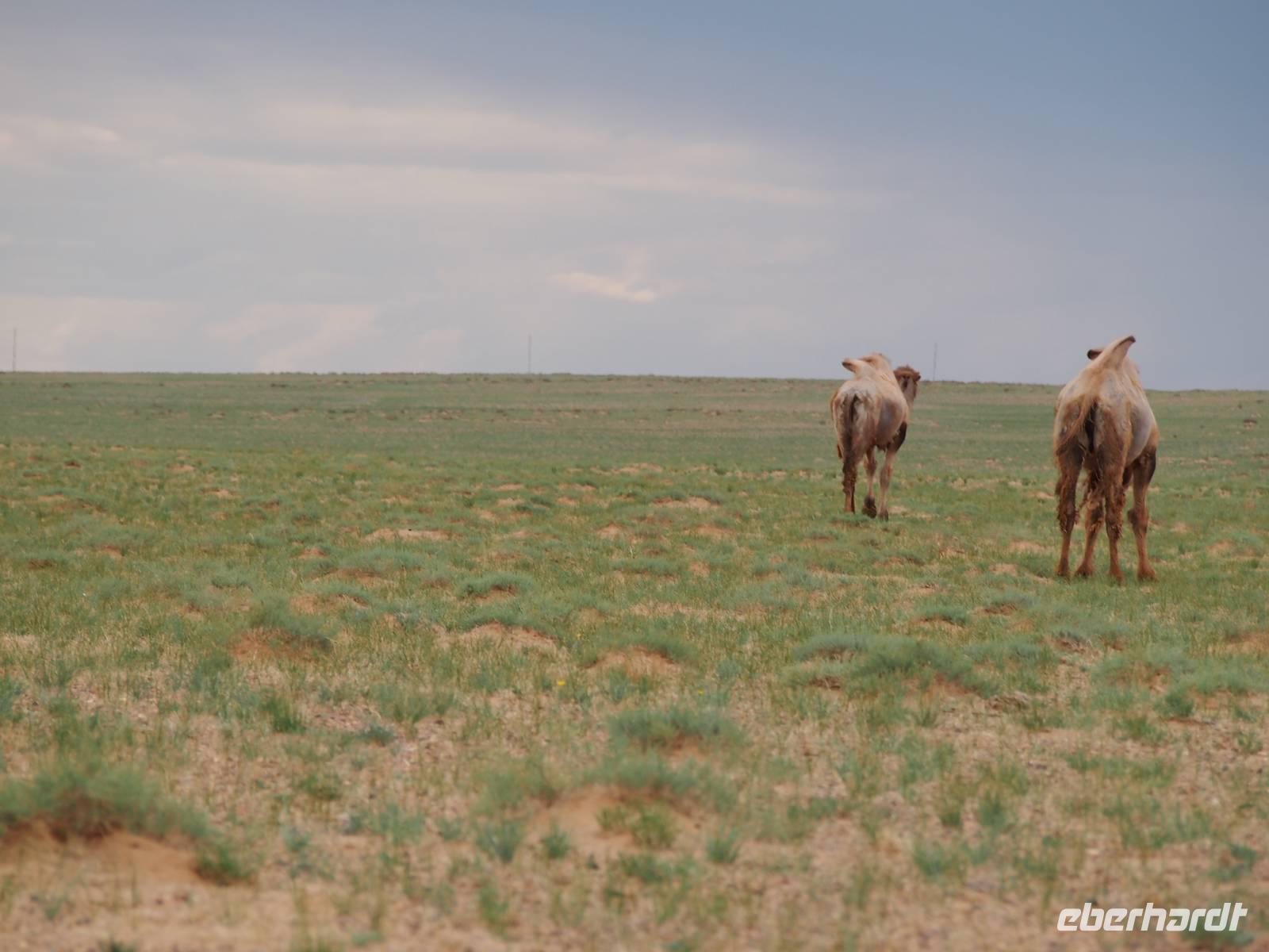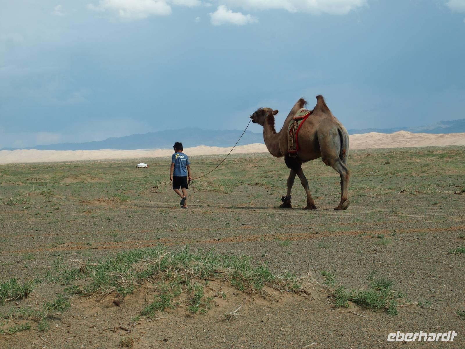 Nach dem Frühstück fuhren wir weiter Richtung Norden durch die Wüste Gobi. Nach relativ kurzer Fahrzeit hatte ein Auto eine Panne und so mussten wir eine kleine Zwangspause einlegen. Die Fahrer konnten das Problem schnell beheben, wir nutzten die Zeit, um die Pflanzenwelt zu begutachten und zu fotografieren. Zu unserem Glück waren zwei größere Kamelherden in unmittelbarer Nähe von uns und so machten wir uns auf den Weg die Tiere zu beobachten. Faszinierend und gespenstisch zugleich war das laute Röhren, welches die Kamele von sich gaben, da die Tiere, die wir bis dahin zu Gesicht bekommen hatten, völlig geräuschlos waren. Wir waren doch sehr erstaunt über den Klang, der mit einem Motorradgeräusch zu vergleichen ist.