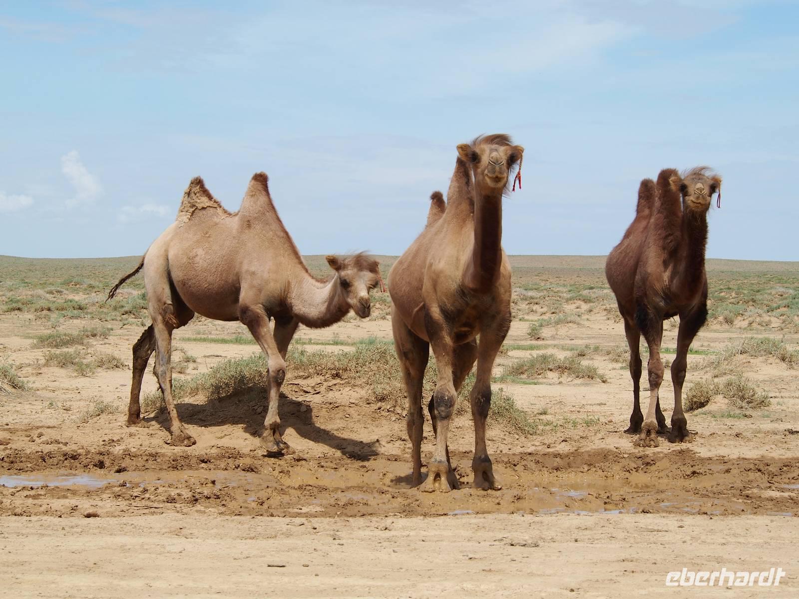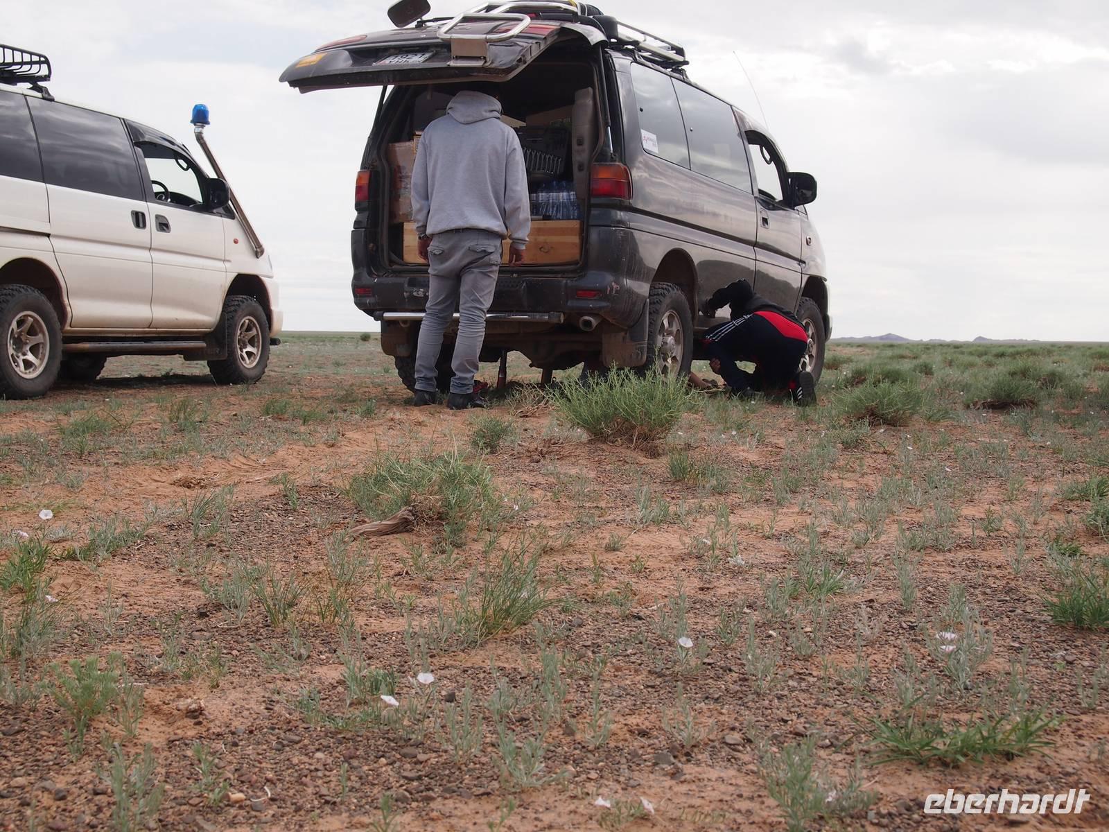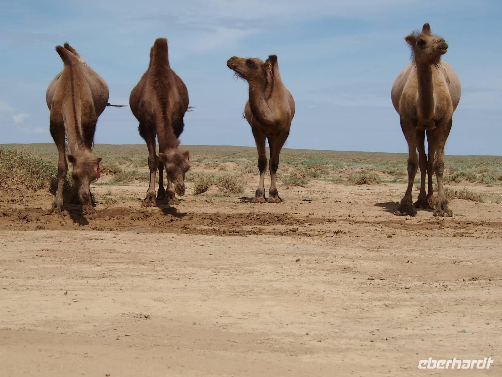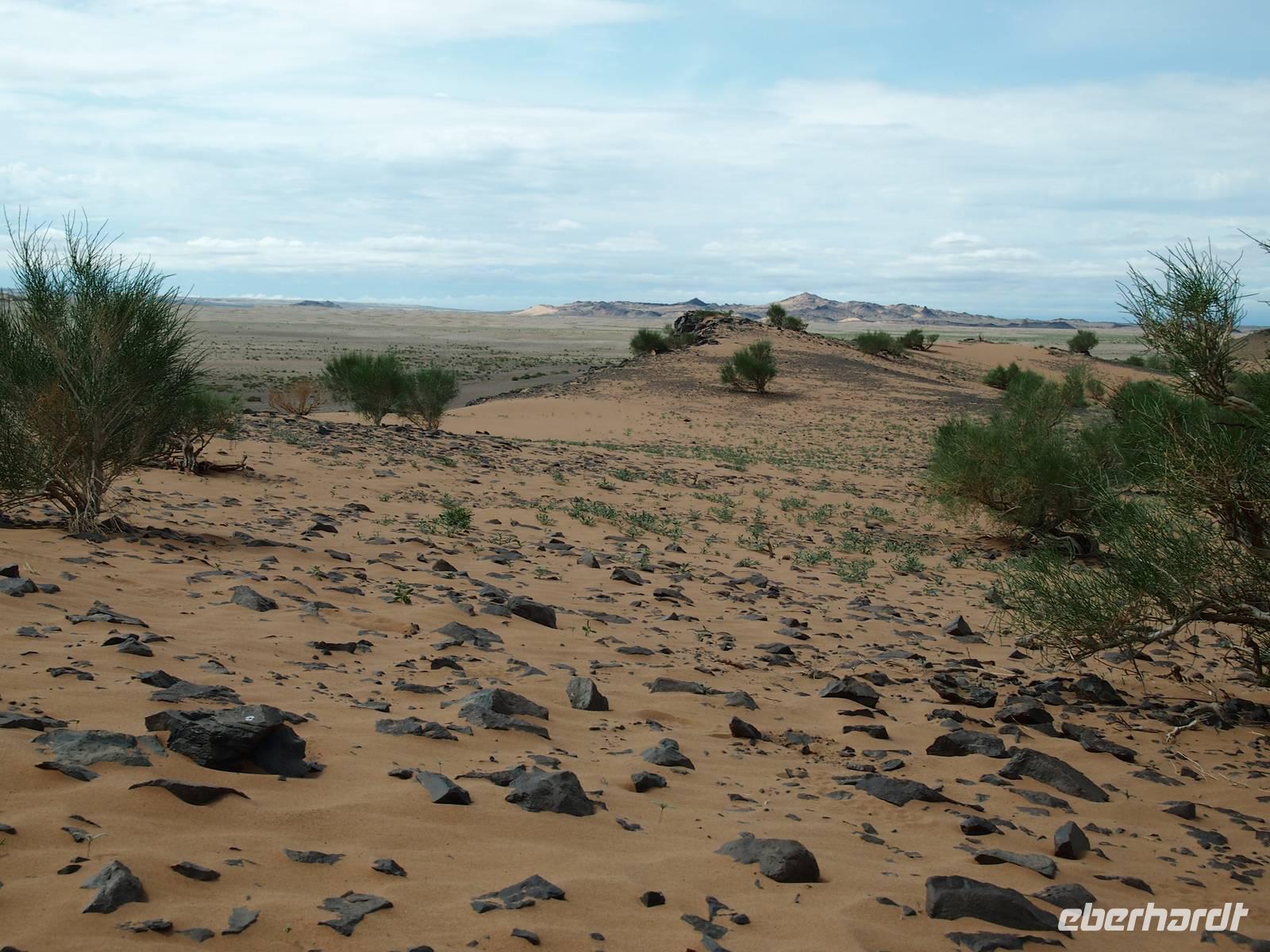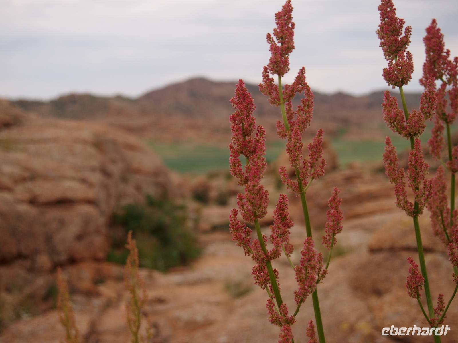 Nach dem Frühstück fuhren wir weiter Richtung Norden durch die Wüste Gobi. Nach relativ kurzer Fahrzeit hatte ein Auto eine Panne und so mussten wir eine kleine Zwangspause einlegen. Die Fahrer konnten das Problem schnell beheben, wir nutzten die Zeit, um die Pflanzenwelt zu begutachten und zu fotografieren. Zu unserem Glück waren zwei größere Kamelherden in unmittelbarer Nähe von uns und so machten wir uns auf den Weg die Tiere zu beobachten. Faszinierend und gespenstisch zugleich war das laute Röhren, welches die Kamele von sich gaben, da die Tiere, die wir bis dahin zu Gesicht bekommen hatten, völlig geräuschlos waren. Wir waren doch sehr erstaunt über den Klang, der mit einem Motorradgeräusch zu vergleichen ist.
