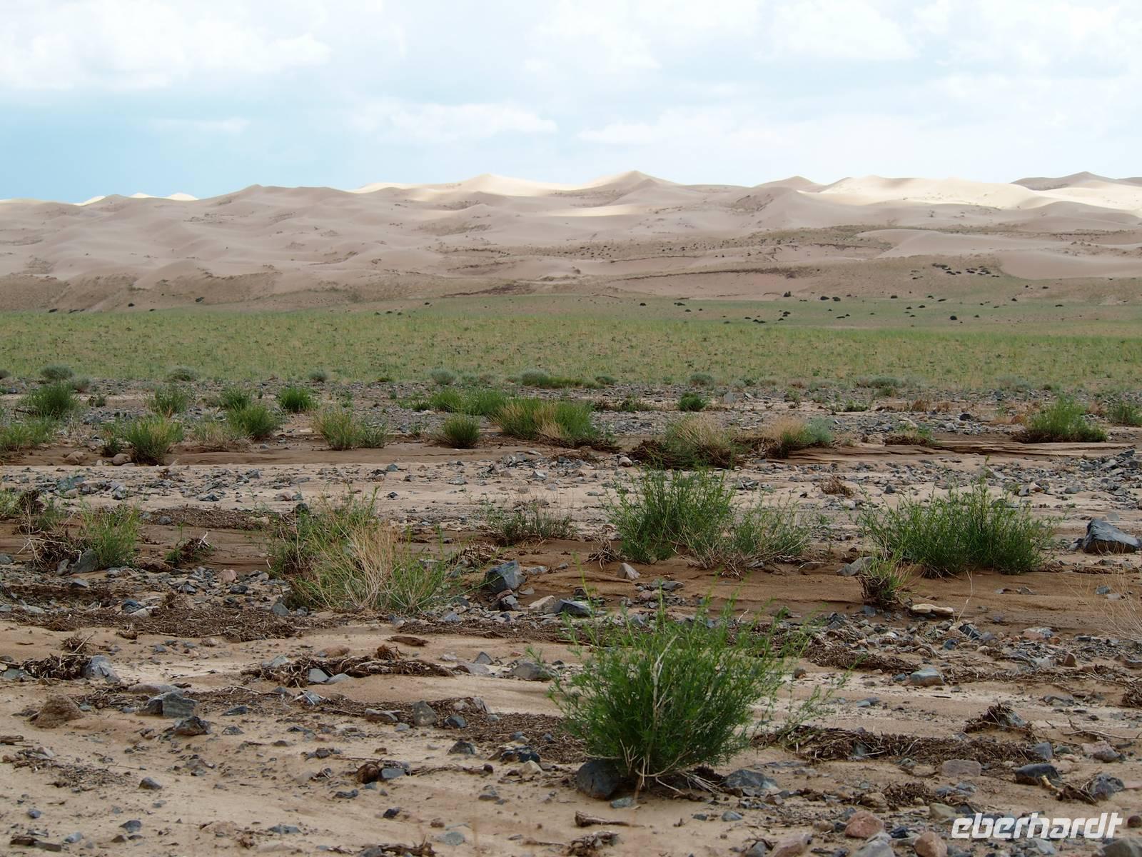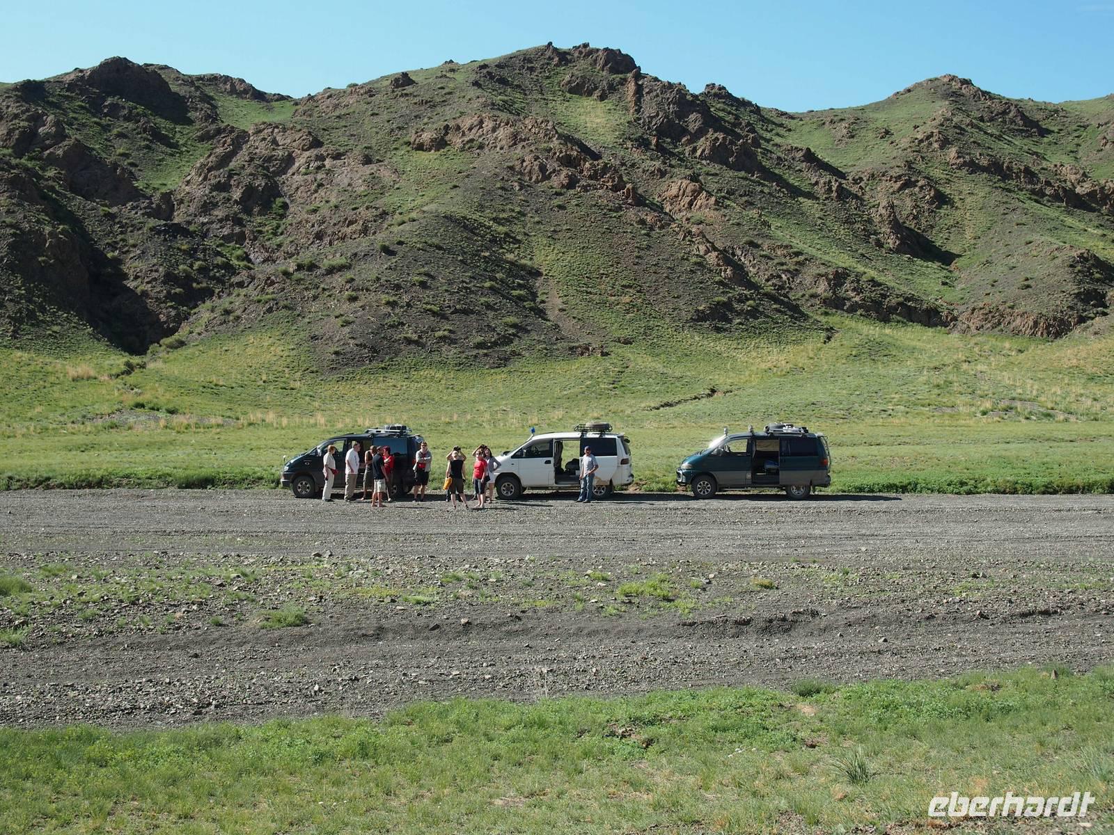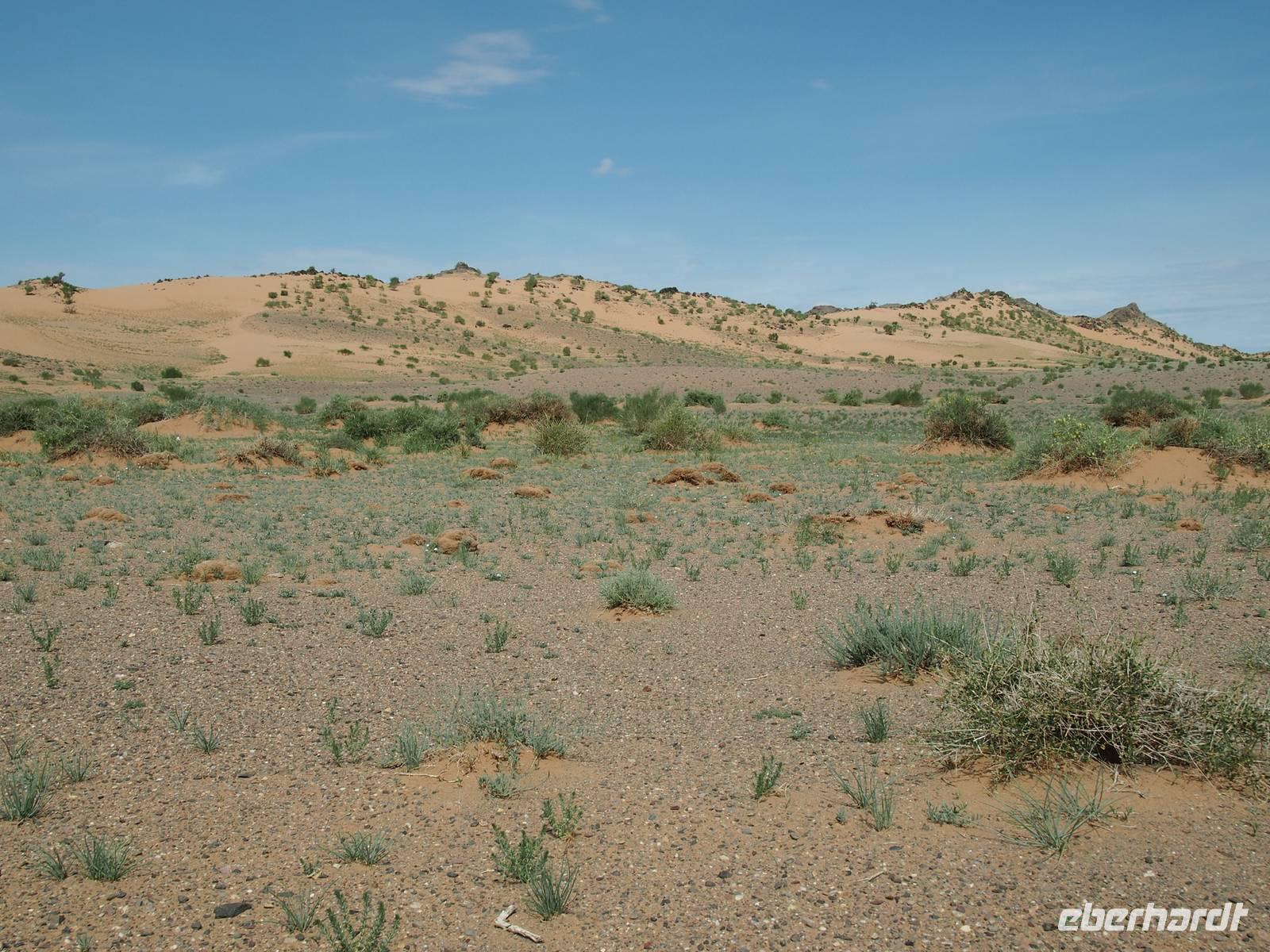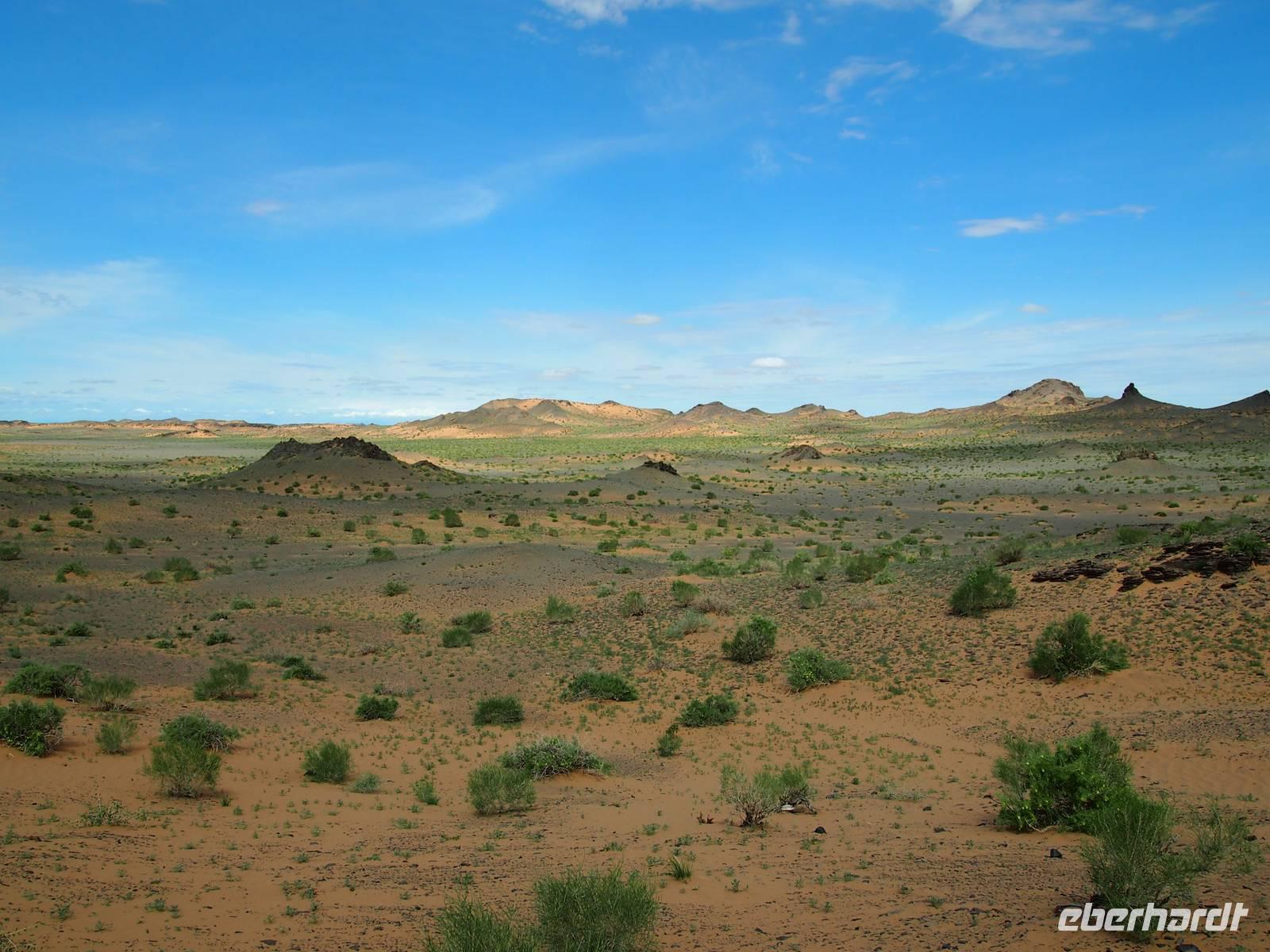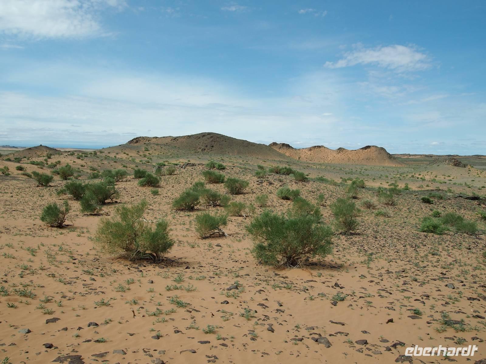 Nach dem Frühstück fuhren wir weiter Richtung Norden durch die Wüste Gobi. Nach relativ kurzer Fahrzeit hatte ein Auto eine Panne und so mussten wir eine kleine Zwangspause einlegen. Die Fahrer konnten das Problem schnell beheben, wir nutzten die Zeit, um die Pflanzenwelt zu begutachten und zu fotografieren. Zu unserem Glück waren zwei größere Kamelherden in unmittelbarer Nähe von uns und so machten wir uns auf den Weg die Tiere zu beobachten. Faszinierend und gespenstisch zugleich war das laute Röhren, welches die Kamele von sich gaben, da die Tiere, die wir bis dahin zu Gesicht bekommen hatten, völlig geräuschlos waren. Wir waren doch sehr erstaunt über den Klang, der mit einem Motorradgeräusch zu vergleichen ist.